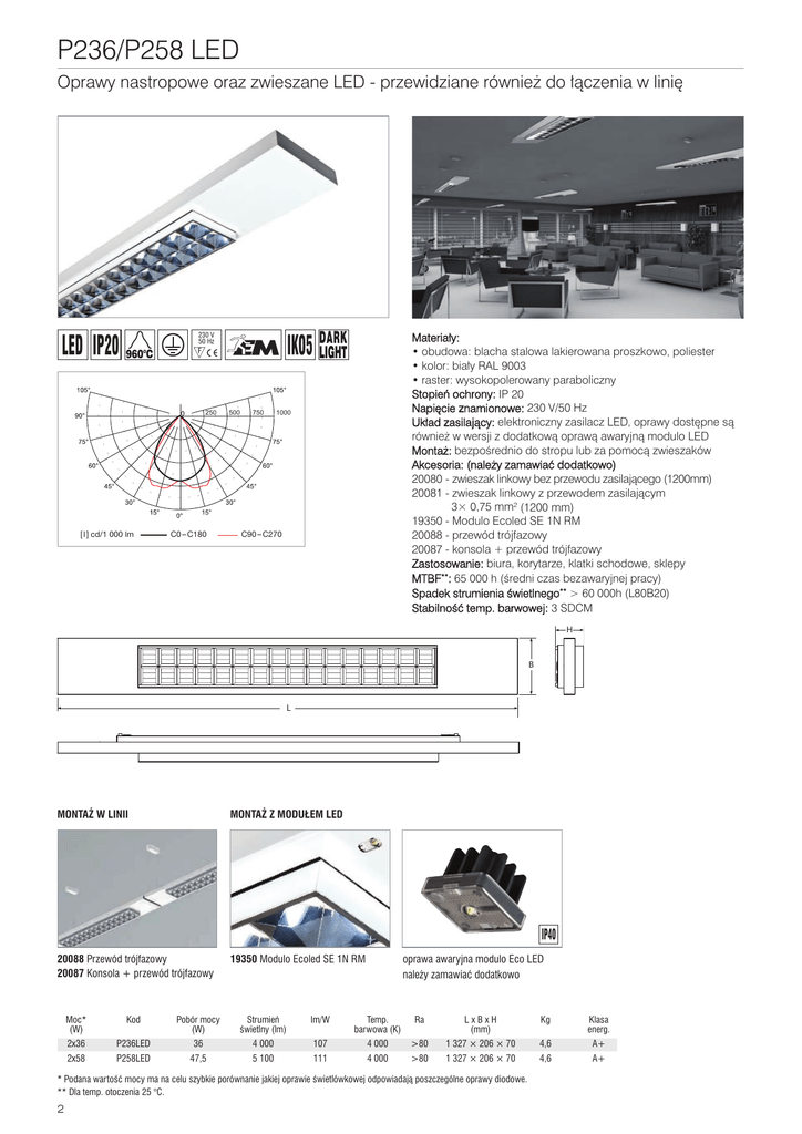 P236/P258 LED Oprawy nastropowe oraz zwieszane LED - przewidziane również do łączenia w linię LED IP20 960°C 250 [ l ] cd/1 000 lm DARK IK05 LIGHT 230 V 50 Hz F C0 – C180 500 750 Materiały: • obudowa: blacha stalowa lakierowana proszkowo, poliester • kolor: biały RAL 9003 • raster: wysokopolerowany paraboliczny Stopień ochrony: IP 20 Napięcie znamionowe: 230 V/50 Hz Układ zasilający: elektroniczny zasilacz LED, oprawy dostępne są również w wersji z dodatkową oprawą awaryjną modulo LED Montaż: bezpośrednio do stropu lub za pomocą zwieszaków Akcesoria: (należy zamawiać dodatkowo) 20080 - zwieszak linkowy bez przewodu zasilającego (1200mm) 20081 - zwieszak linkowy z przewodem zasilającym 3× 0,75 mm2 (1200 mm) 19350 - Modulo Ecoled SE 1N RM 20088 - przewód trójfazowy 20087 - konsola + przewód trójfazowy Zastosowanie: biura, korytarze, klatki schodowe, sklepy MTBF**: 65 000 h (średni czas bezawaryjnej pracy) Spadek strumienia świetlnego** > 60 000h (L80B20) Stabilność temp. barwowej: 3 SDCM 1000 C90 – C270 H B L MONTAŻ W LINII MONTAŻ Z MODUŁEM LED IP40 20088 Przewód trójfazowy 20087 Konsola + przewód trójfazowy Moc* (W) Kod 2x36 P236LED 2x58 P258LED Pobór mocy (W) 19350 Modulo Ecoled SE 1N RM oprawa awaryjna modulo Eco LED należy zamawiać dodatkowo Strumień świetlny (lm) lm/W Temp. barwowa (K) Ra LxBxH (mm) Kg Klasa energ. 36 4 000 107 4 000 >80 1 327 × 206 × 70 4,6 A+ 47,5 5 100 111 4 000 >80 1 327 × 206 × 70 4,6 A+ * Podana wartość mocy ma na celu szybkie porównanie jakiej oprawie świetlówkowej odpowiadają poszczególne oprawy diodowe. ** Dla temp. otoczenia 25 °C. 2