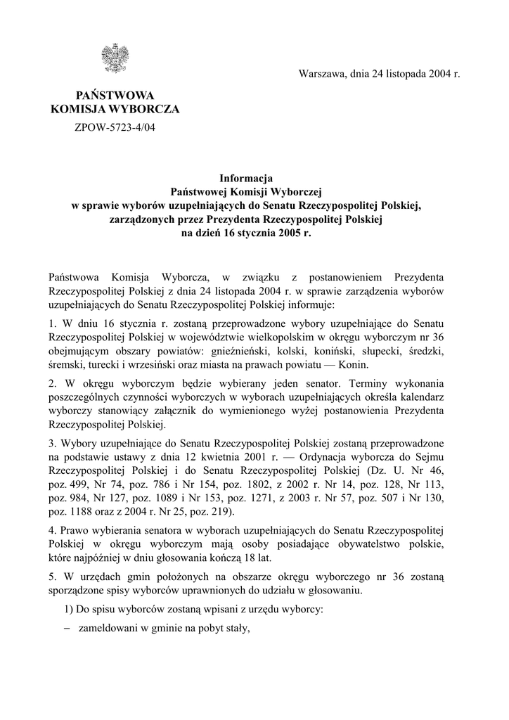 Warszawa, dnia 24 listopada 2004 r. PAŃSTWOWA KOMISJA WYBORCZA ZPOW-5723-4/04 Informacja Państwowej Komisji Wyborczej w sprawie wyborów uzupełniających do Senatu Rzeczypospolitej Polskiej, zarządzonych przez Prezydenta Rzeczypospolitej Polskiej na dzień 16 stycznia 2005 r. Państwowa Komisja Wyborcza, w związku z postanowieniem Prezydenta Rzeczypospolitej Polskiej z dnia 24 listopada 2004 r. w sprawie zarządzenia wyborów uzupełniających do Senatu Rzeczypospolitej Polskiej informuje: 1. W dniu 16 stycznia r. zostaną przeprowadzone wybory uzupełniające do Senatu Rzeczypospolitej Polskiej w województwie wielkopolskim w okręgu wyborczym nr 36 obejmującym obszary powiatów: gnieźnieński, kolski, koniński, słupecki, średzki, śremski, turecki i wrzesiński oraz miasta na prawach powiatu — Konin. 2. W okręgu wyborczym będzie wybierany jeden senator. Terminy wykonania poszczególnych czynności wyborczych w wyborach uzupełniających określa kalendarz wyborczy stanowiący załącznik do wymienionego wyżej postanowienia Prezydenta Rzeczypospolitej Polskiej. 3. Wybory uzupełniające do Senatu Rzeczypospolitej Polskiej zostaną przeprowadzone na podstawie ustawy z dnia 12 kwietnia 2001 r. — Ordynacja wyborcza do Sejmu Rzeczypospolitej Polskiej i do Senatu Rzeczypospolitej Polskiej (Dz. U. Nr 46, poz. 499, Nr 74, poz. 786 i Nr 154, poz. 1802, z 2002 r. Nr 14, poz. 128, Nr 113, poz. 984, Nr 127, poz. 1089 i Nr 153, poz. 1271, z 2003 r. Nr 57, poz. 507 i Nr 130, poz. 1188 oraz z 2004 r. Nr 25, poz. 219). 4. Prawo wybierania senatora w wyborach uzupełniających do Senatu Rzeczypospolitej Polskiej w okręgu wyborczym mają osoby posiadające obywatelstwo polskie, które najpóźniej w dniu głosowania kończą 18 lat. 5. W urzędach gmin położonych na obszarze okręgu wyborczego nr 36 zostaną sporządzone spisy wyborców uprawnionych do udziału w głosowaniu. 1) Do spisu wyborców zostaną wpisani z urzędu wyborcy: − zameldowani w gminie na pobyt stały, -2− dopisani do rejestru wyborców na własny wniosek w trybie art. 12 ust. 2 i 3 Ordynacji wyborczej, jeżeli stale zamieszkują na obszarze gminy, bez zameldowania na pobyt stały. 2) Do spisu wyborców zostaną też wpisani wyborcy czasowo przebywający na obszarze gminy w okresie obejmującym dzień wyborów, ujęci w stałym rejestrze wyborców w gminie z okręgu wyborczego nr 36, jeżeli złożą w urzędzie gminy, właściwym dla ich miejsca pobytu, wniosek o dopisanie ich do spisu wyborców; dotyczy to także osób nigdzie niezamieszkałych, przebywających na obszarze gminy (art. 19 Ordynacji wyborczej). Wniosek należy złożyć najpóźniej 6 stycznia 2005 r. 3) Osoby przebywające w szpitalach, zakładach pomocy społecznej oraz zakładach karnych i aresztach śledczych, w których zostaną utworzone obwody głosowania, będą umieszczone w spisie wyborców na podstawie wykazów osób sporządzonych przez kierowników tych jednostek. 4) Żołnierze pełniących zasadniczą lub okresową służbę wojskową oraz pełniący służbę w charakterze kandydatów na żołnierzy zawodowych lub odbywający ćwiczenia i przeszkolenie wojskowe, a także ratownicy odbywający zasadniczą służbę w obronie cywilnej poza miejscem stałego zamieszkania oraz policjanci z jednostek skoszarowanych, funkcjonariusze Biura Ochrony Rządu, Straży Granicznej, Państwowej Straży Pożarnej oraz Służby Więziennej pełniący służbę w systemie skoszarowanym, ujęci w stałym rejestrze wyborców w gminie z okręgu wyborczego nr 36, będą dopisani do wybranego przez nich spisu wyborców sporządzonego dla miejscowości, w której odbywają służbę, jeżeli złożą w urzędzie gminy wniosek w tej sprawie między 26 grudnia 2004 r. a 3 stycznia 2005 r. (termin przedłużony zgodnie z art. 233 ust. 2 Ordynacji wyborczej). 6. Prawo wybierania nie przysługuje osobom, które są ubezwłasnowolnione prawomocnym orzeczeniem sądowym (bez względu na przyczynę ubezwłasnowolnienia) lub pozbawione praw publicznych albo praw wyborczych (art. 7 Ordynacji wyborczej). 7. Kandydatów na senatora w wyborach uzupełniających zgłasza się do dnia 7 grudnia 2004 r. do godz. 24.00 do Okręgowej Komisji Wyborczej w Koninie, al. 1-go Maja 7; 1) Kandydatów na senatora mogą zgłaszać wyłącznie komitety wyborcze partii politycznych, koalicyjne komitety wyborcze oraz komitety wyborcze wyborców, które zawiadomią Państwową Komisję Wyborczą odpowiednio o zamiarze zgłoszenia kandydata na senatora oraz o utworzeniu komitetu wyborczego (art. 96-98 Ordynacji wyborczej) i uzyskają potwierdzenie przyjęcia zawiadomienia (art. 102 Ordynacji wyborczej). Zawiadomienie należy złożyć do dnia 29 listopada 2004 r. do godz. 16.15 (termin przedłużony zgodnie z art. 233 ust. 2 Ordynacji wyborczej). 2) Funkcję komitetu wyborczego partii politycznej pełni statutowy organ partii upoważniony do jej reprezentowania na zewnątrz (art. 96 ust. 1 Ordynacji wyborczej). -33) Czynności wyborcze w imieniu koalicji partii politycznych wykonuje koalicyjny komitet wyborczy, utworzony w tym celu przez organy partii tworzących koalicję, upoważnione do reprezentowania partii na zewnątrz (art. 97 ust. 3 Ordynacji wyborczej). 4) Komitet wyborczy wyborców może utworzyć nie mniej niż z 15 osób mających prawo wybierania. Do zawiadomienia Państwowej Komisji Wyborczej o utworzeniu takiego komitetu konieczne jest dołączenie wykazu podpisów co najmniej 1000 wyborców popierających utworzenie komitetu wyborczego (art. 98 ust. 4 i 6 pkt 3 Ordynacji wyborczej). 5) Kandydatem na senatora może być obywatel polski, mający prawo wybierania, który najpóźniej w dniu wyborów kończy 30 lat (art. 99 ust. 2 Konstytucji RP). Kandydat nie musi stale zamieszkiwać na terenie okręgu wyborczego, w którym kandyduje na senatora. Kandydować można tylko w ramach zgłoszenia przez jeden komitet wyborczy (art. 195 ust. 2 Ordynacji wyborczej). 6) Zgłoszen