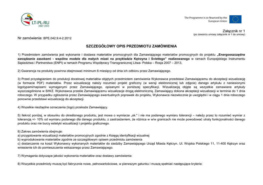 Załącznik nr 1 (po zawarciu umowy załącznik nr 1 do umowy) Nr zamówienia: BPE.042.9.4-2.2012 SZCZEGÓŁOWY OPIS PRZEDMIOTU ZAMÓWIENIA 1) Przedmiotem zamówienia jest wykonanie i dostawa materiałów promocyjnych dla Zamawiającego materiałów promocyjnych do projektu „Energooszczędne zarządzanie zasobami - wspólne modele dla małych miast na przykładzie Kętrzyna i Svietłego” realizowanego w ramach Europejskiego Instrumentu Sąsiedztwa i Partnerstwa (ENPI) w ramach Programu Współpracy Transgranicznej Litwa- Polska – Rosja 2007 – 2013, 2) Gwarancja na produkty powinna obejmować minimum 6 miesięcy od dnia ich odbioru przez Zamawiającego. 3) Przed przystąpieniem do produkcji docelowej materiałów objętych przedmiotem zamówienia Wykonawca przedstawi Zamawiającemu do akceptacji wizualizację (w formacie PDF) materiałów. Przez wizualizację naleŜy rozumieć projekt graficzny (w wersji elektronicznej lub zdjęcie) danego artykułu z naniesionymi logotypami/napisami wymaganymi przez Zamawiającego, opisanymi w poniŜszej specyfikacji. Wizualizacją objęte są wszystkie zamawiane artykuły wyszczególnione w SIWZ. Wykonawca prześle Zamawiającemu wizualizacje drogą elektroniczną. Zamawiający dokona akceptacji wizualizacji w terminie do 1 dnia roboczego. W przypadku zgłoszenia przez Zamawiającego ewentualnych poprawek do projektu, Wykonawca niezwłocznie je uwzględni i w ciągu 1 dnia roboczego ponownie przedstawi wizualizację do akceptacji. 4) Wszelkie niezbędne oznaczenia (logo) przekaŜe Zamawiający. 5) Ilekroć poniŜej, w stosunku do określonego produktu, jest mowa o wymiarze „ok." i nie ma podanego wymiaru tolerancji – naleŜy przez to rozumieć wymiar z tolerancją +/- 10% od wymiaru podanego dla danego produktu, z zastrzeŜeniem, Ŝe róŜnica w w/w granicach nie moŜe powodować utraty funkcjonalności danego produktu oraz nie burzy estetyki wizualizacji i projektu graficznego. 6) Zakres zamówienia obejmuje: a) przygotowanie wizualizacji materiałów promocyjnych zgodnie z Księgą identyfikacji wizualnej b) wyprodukowanie materiałów zgodnie ze szczegółowym opisem przedmiotu zamówienia c) dostarczenie na koszt Wykonawcy wykonanych materiałów do siedziby Zamawiającego Urząd Miasta Kętrzyn. Ul. Wojska Polskiego 11, 11-400 Kętrzyn oraz wniesienie ich do pomieszczenia wskazanego przez Zamawiającego. 7) Wymagania dotyczące jakości wykonania materiałów oraz dostawy zamówienia: 8) Wszystkie przedmioty muszą być fabrycznie nowe, pełnowartościowe, w pierwszym gatunku i muszą spełniać następujące kryteria: a) funkcjonalności, tj. powinny spełniać swoje przeznaczenie, materiały będące przedmiotem zamówienia muszą zapewniać ich łatwe i bezproblemowe uŜytkowanie b) trwałości, tj. artykuł nie ulega trwałym zniekształceniom, jest odporny na wstrząsy, artykuł nie ulega zniszczeniu przy zwykłym korzystaniu, ruchome elementy materiału zapewniają jego właściwe funkcjonowanie c) estetyki i precyzji wykonania, tj. np. nie występują zarysowania, przebarwienia, pęknięcia i inne uszkodzenia materiału podczas właściwego i normalnego korzystania, poszczególne części materiałów są dobrze do siebie dopasowane oraz zamocowane, graficzne elementy materiałów nie ścierają się, nie rozmazują ani nie zmieniają kolorów np. podczas pocierania palcem powodując tym samym zabrudzenia skóry. 9) Wszystkie materiały powinny być bezwonne lub posiadać zapach powstały wyłącznie w wyniku fabrycznego zastosowania technologii produkcji właściwej dla danego rodzaju materiału. 10) Sposób transportu oraz opakowanie artykułów muszą zapewniać zabezpieczenie przed uszkodzeniami. Za szkody powstałe w wyniku nienaleŜytego opakowania oraz/lub transportu winę ponosi Wykonawca. 11) W przypadku powstania strat podczas transportu w wyniku niewłaściwego zabezpieczenia materiałów przed uszkodzeniami Wykonawca wymieni uszkodzone materiały i dostarczy je Zamawiającemu na ten sam adres i na własny koszt w ciągu 5 dni roboczych. 12) Poszczególne rodzaje materiałów zostaną dostarczone w zbiorczych opakowaniach. Na kaŜdym opakowaniu zbiorczym Wykonawca zaznaczy rodzaj artykułu wraz z jego opisem, liczbę sztuk w opakowaniu oraz, tam gdzie dotyczy, wersję językową. 13) Uwagi/sugestie lub akceptacje kolejnych etapów realizacji przedmiotu umowy będą przekazywane Wykonawcy drogą elektroniczną przez osobę odpowiedzialną za realizację umowy ze strony Zamawiającego. 14) Akceptacja wzorów i wizualizacji nastąpi drogą poczty elektronicznej. 2 WYKAZ PRZEDMIOTU ZAMÓWIENIA Szczegółowy opis produktu Treść nadruku Ilość (szt.) długopis metalowy z logo LPR - kolor: róŜne kolory - wkład długopisu wymienny w kolorze niebieskim lub czarnym , - wymiar ok. 13,5 cm Długopis powinien być na tyle gruby, by nadrukowane logotypy były wyraźne i czytelne - opakowanie: kaŜdy długopis zapakowany w osobną folię. Nadruk achromatyczny pozytywowy lub negatywowy, zaleŜnie od koloru długopisu; preferowany na klamrze lub na długopisie, zaleŜnie od rodzaju długopisu. Logotypy zgodnie z wytycznymi oznaczania projektów z Programu Współpracy Transgranicznej Litwa- Polska- Rosja 2007- 2013, w tym minimum: - logo EU (flaga) - logo LPR - Informacja o współfinansowaniu w języku angielskim: Programme is cofinanced by the European Union 1000 Notatnik A5 - format A5 - ilość kartek: min. 50 kartek w kratkę lub linię; - papier offset min.90 g, - kaŜda kartka oraz okładka oznaczona logo-typami zgodnym z wytycznymi oznaczania projektów z Programu Współpracy Transgranicznej LitwaPolska- Rosja 2007- 2013, w tym logotyp Programu, flaga Unii Europejskiej oraz logo promocyjne miast; - wierzchnia okładka twarda z klipsem i nadrukiem w kolorze białym z nadrukiem logotypów zgodnym z wytycznymi oznaczania projektów z Programu Współpracy Transgranicznej Litwa- Polska- Rosja 2007- 2013, w tym logotyp Progra