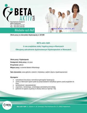 Paul-Hartmann-Straße 61 89522 Heidenheim Tel.: +49 (7321) 315 047 Fax: +49 (7321) 345 832 www.beta-aktiv.pl Oferta pracy na stanowisku fizjoterapeuty nr 201499 BETA aktiv GbRU nas znajdziesz stałą i legalną pracę w Niemczech Oferujemy zatrudnienie dyplomowanym fizjoterapeutom w Niemczech Oferta pracy: Fizjoterapeuta Dostępność oferty pracy: od zaraz W wymiarze: pełnym Miejsce pracy: na terenie Badenii-Wirtembergii Opis stanowiska: praca głównie z dziećmi i młodzieżą o ciężkim stopniu niepełnosprawności Wymagania: wykształcenie kierunkowe: technik/licencjat/magister fizjoterapeuty uznany w Niemczech dyplom polski lub przeprowadzenie nostryfikacji dyplomu przed przyjazdem do pracy samodzielność i odpowiedzialność, znajomość j. niemieckiego, umożliwiająca samodzielną komunikację, gotowość do wyjazdu za granicę na dłuższy okres (co najmniej 1 rok) Beta aktiv GbR | E. Sobiech, A. M. Schimizek | Paul-Hartmann-Str. 61 | 89522 Heidenheim Oferujemy: wsparcie podczas tłumaczenia umowy o pracę okres wprowadzenia w zakres obowiązków wspomagające kursy języka niemieckiego 27 – 33 dni roboczych urlopu różne inne dodatki za pracę w nocy, niedziele i święta, nadgodziny, itp. miłą atmosferę w miejscu pracy wynagrodzenie od 2000 EUR brutto opiekę polskojęzycznego przedstawiciela podczas pracy w Niemczech pomoc w przeprowadzeniu procesu uznania dyplomu Jak z sukcesem i bez ryzyka podjąć się tej pracy? Skontaktuj się z naszym przedstawicielem w Polsce pod numer 505 123 391. Po pozytywnym przejściu pierwszej rozmowy kwalifikacyjnej: wypełnij otrzymany formularz. W ciągu 5 dni roboczych zgłosimy się do Ciebie telefonicznie. Zaprosimy Cię na 2 dni próbnej pracy u Twojego przyszłego pracodawcy. Podpiszesz umowę o pracę bezpośrednio z niemieckim pracodawcą Prosimy o przesłanie aplikacji na adres: [email protected] Zapraszamy do kontaktu telefonicznego na numer 0048 505 123 391 Erreichen Sie zusammen mit uns schnell und effektiv Ihre Ziele. Bądźmy partnerami. Przyłącz się do grona osób, które skorzystały już z naszej oferty pracy. Beta aktiv GbR | E. Sobiech, A. M. Schimizek | Paul-Hartmann-Str. 61 | 89522 Heidenheim
