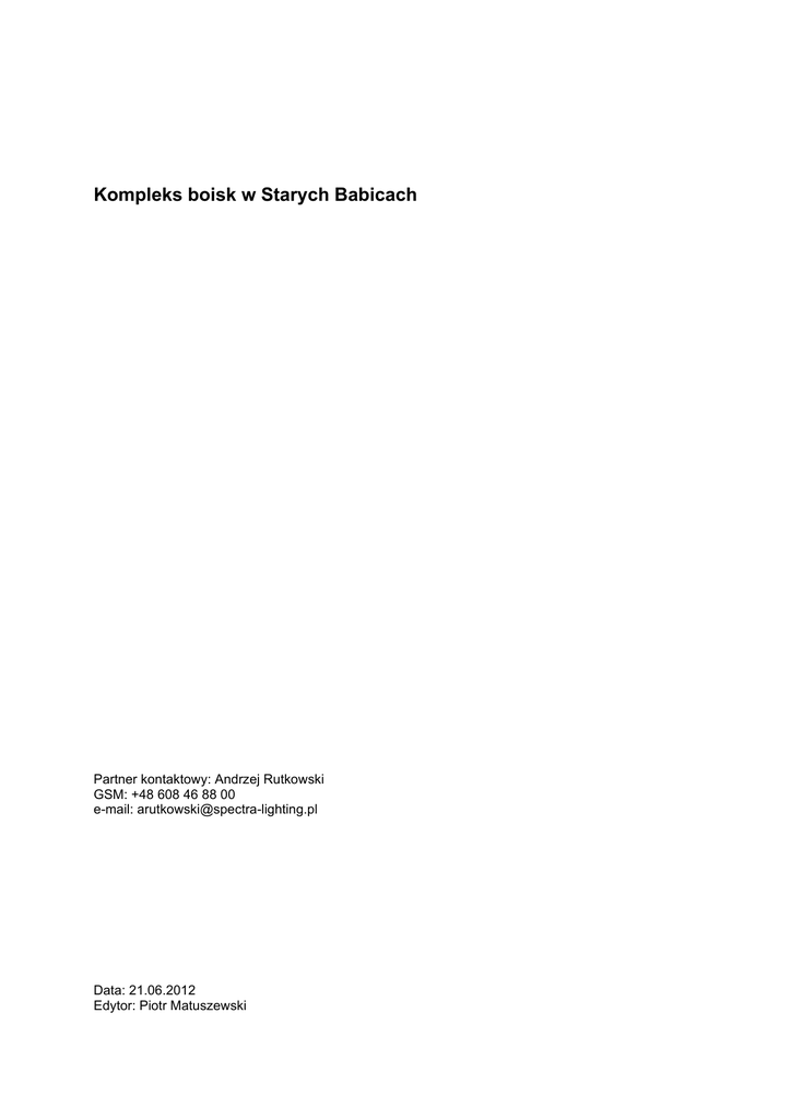 Kompleks boisk w Starych Babicach Partner kontaktowy: Andrzej Rutkowski GSM: +48 608 46 88 00 e-mail: [email protected] Data: 21.06.2012 Edytor: Piotr Matuszewski Kompleks boisk w Starych Babicach 21.06.2012 Spectra Lighting Sp. z o. o. ul. Ostródzka 53 tel: (0-22) 567 01 00 http://www.spectra-lighting.com.pl/ Edytor Piotr Matuszewski Telefon faks e-Mail [email protected] Spis treści Kompleks boisk w Starych Babicach Strona tytułowa projektu Spis treści Scena zewnętrzna 1 Oprawy (plan rozmieszczenia) Powierzchnie zewnętrzne Bieżnia prosta Grafika wartości (E, prostopadle) Boisko do gry w piłkę nożną Siatka obliczeniowa Podsumowanie Grafika wartości (E, prostopadle) Bieżnia Siatka obliczeniowa Grafika wartości (E, prostopadle) Scena zewnętrzna 2 Oprawy (plan rozmieszczenia) Powierzchnie zewnętrzne Piłka ręczna Siatka obliczeniowa Podsumowanie Grafika wartości (E, prostopadle) Koszykówka 1 Siatka obliczeniowa Podsumowanie Grafika wartości (E, prostopadle) 1 2 3 4 5 6 7 8 9 10 11 12 Strona 2 Kompleks boisk w Starych Babicach 21.06.2012 Spectra Lighting Sp. z o. o. ul. Ostródzka 53 tel: (0-22) 567 01 00 http://www.spectra-lighting.com.pl/ Edytor Piotr Matuszewski Telefon faks e-Mail [email protected] Scena zewnętrzna 1 / Oprawy (plan rozmieszczenia) 85.03 m 1 78.40 75.55 111 111 69.94 1 1 56.98 47.02 1 11 34.26 111 1 28.50 21.56 52.10 62.14 73.38 87.66 98.20 110.03 120.55 139.30 158.33 m Skala 1 : 760 Wykaz opraw Nr. Ilość 1 16 Etykieta Lanzini 26121 Olympia 2 Asim. Grigio Strona 3 Kompleks boisk w Starych Babicach 21.06.2012 Spectra Lighting Sp. z o. o. ul. Ostródzka 53 tel: (0-22) 567 01 00 http://www.spectra-lighting.com.pl/ Edytor Piotr Matuszewski Telefon faks e-Mail [email protected] Scena zewnętrzna 1 / Bieżnia prosta / Grafika wartości (E, prostopadle) 23.57 m 56 59 52 37 51 40 38 39 72 47 63 18.50 105 156 155 95 82 98 106 72 68 82 133 160 134 93 59 45 77 41 46 42 31 23 25 5.07 0.00 0.00 74.91 m Wartości Lux, Skala 1 : 536 Nie wszystkie obliczone wartości mogą zostać przedstawione. Położenie powierzchni w scenie zewnętrznej: Zaznaczony punkt: (61.753 m, 42.620 m, 0.000 m) Siatka: 128 x 16 Punkty Em [lx] 82 Emin [lx] 12 Emax [lx] 174 Emin / Em 0.149 Emin / Emax 0.070 Strona 4 Kompleks boisk w Starych Babicach 21.06.2012 Spectra Lighting Sp. z o. o. ul. Ostródzka 53 tel: (0-22) 567 01 00 http://www.spectra-lighting.com.pl/ Edytor Piotr Matuszewski Telefon faks e-Mail [email protected] Scena zewnętrzna 1 / Boisko do gry w piłkę nożną Siatka obliczeniowa / Podsumowanie 85.03 m 72.81 59.17 53.38 47.60 33.95 21.56 52.10 75.09 105.41 129.40 158.33 m Skala 1 : 760 Pozycja: (105.411 m, 53.384 m, 0.000 m) Rozmiar: (56.000 m, 26.000 m) Rotacja: (0.0°, 0.0°, -14.1°) Typ: Normalna, Siatka: 17 x 7 Punkty Należy do następujących obiektów sportowych: Boisko do gry w piłkę nożną 1 Zestawienie wyników Nr. 1 Typ pionowa Em [lx] Emin [lx] Emax [lx] Emin / Em Emin / Emax Eh m/Em W [m] Kamera 81 50 140 0.62 0.36 / 0.000 / Eh m/Em = Stosunek między średnim poziomym i pionowym natężeniem oświetlenia, W = Wysokość pomiaru Strona 5 Kompleks boisk w Starych Babicach 21.06.2012 Spectra Lighting Sp. z o. o. ul. Ostródzka 53 tel: (0-22) 567 01 00 http://www.spectra-lighting.com.pl/ Edytor Piotr Matuszewski Telefon faks e-Mail [email protected] Scena zewnętrzna 1 / Boisko do gry w piłkę nożną Siatka obliczeniowa / Grafika wartości (E, prostopadle) 66 73 91 115 139 140 119 100 90 100 120 139 135 110 86 66 59 58 64 76 94 107 109 97 85 82 86 98 108 106 90 74 64 59 54 59 67 77 84 85 81 76 74 77 83 85 83 76 65 57 54 50 56 63 69 74 75 74 72 70 72 75 76 74 70 62 56 54 51 56 63 71 75 77 77 73 71 73 77 79 78 73 65 58 53 53 57 66 80 90 93 88 80 77 80 88 94 93 84 72 64 58 54 62 78 97 118 121 106 91 87 92 106 123 120 101 80 67 61 13.00 m -13.00 -28.00 28.00 m Wartości Lux, Skala 1 : 401 Położenie powierzchni w scenie zewnętrznej: Zaznaczony punkt: (75.088 m, 47.597 m, 0.000 m) Siatka: 17 x 7 Punkty Em [lx] 81 Emin [lx] 50 Emax [lx] 140 Emin / Em 0.62 Emin / Emax 0.36 Strona 6 Kompleks boisk w Starych Babicach 21.06.2012 Spectra Lighting Sp. z o. o. ul. Ostródzka 53 tel: (0-22) 567 01 00 http://www.spectra-lighting.com.pl/ Edytor Piotr Matuszewski Telefon faks e-Mail [email protected] Scena zewnętrzna 1 / Bieżnia Siatka obliczeniowa / Grafika wartości (E, prostopadle) 45 155 58 154 20.36 m 35 56 62 18 11 40 31 48 104 111 113 98 38 -20.36 -43.90 43.90 m Wartości Lux, Skala 1 : 628 Położenie powierzchni w scenie zewnętrznej: Zaznaczony punkt: (57.825 m, 44.414 m, 0.000 m) Siatka: 17 x 1 Punkty Em [lx] 69 Emin [lx] 11 Emax [lx] 155 Emin / Em 0.16 Emin / Emax 0.07 Strona 7 Kompleks boisk w Starych Babicach 21.06.2012 Spectra Lighting Sp. z o. o. ul. Ostródzka 53 tel: (0-22) 567 01 00 http://www.spectra-lighting.com.pl/ Edytor Piotr Matuszewski Telefon faks e-Mail [email protected] Scena zewnętrzna 2 / Oprawy (plan rozmieszczenia) 52.22 m 11 41.70 1 1 1 34.28 14.94 1 7.94 2.22 140.51 161.93 169.44 185.41 192.22 200.39 m Skala 1 : 429 Wykaz opraw Nr. Ilość 1 6 Etykieta Lanzini 26121 Olympia 2 Asim. Grigio Strona 8 Kompleks boisk w Starych Babicach 21.06.2012 Spectra Lighting Sp. z o. o. ul. Ostródzka 53 tel: (0-22) 567 01 00 http://www.spectra-lighting.com.pl/ Edytor Piotr Matuszewski Telefon faks e-Mail [email protected] Scena zewnętrzna 2 / Piłka ręczna Siatka obliczeniowa / Podsumowanie 52.22 m 40.69 31.02 26.15 21.29 11.61 2.22 140.51 147.44 169.27 186.25 200.39 m Skala 1 : 477 Pozycja: (169.267 m, 26.151 m, 0.000 m) Rozmiar: (40.000 m, 20.000 m) Rotacja: (0.0°, 0.0°, -14.0°) Typ: Normalna, Siatka: 15 x 7 Punkty Należy do następujących obiektów sportowych: Piłka ręczna 1 Zestawienie wyników Nr. 1 Typ pionowa Em [lx] Emin [lx] Emax [lx] Emin / Em Emin / Emax Eh m/Em W [m] Kamera 77 17 144 0.22 0.12 / 0.000 / Eh m/Em = Stosunek między średnim poziomym i pionowym natężeniem oświetlenia, W = Wysokość pomiaru Strona 9 Kompleks bo