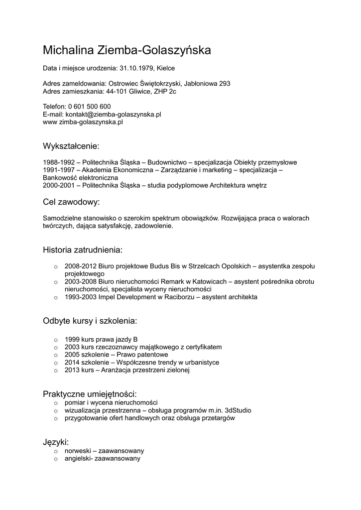 Michalina Ziemba-Golaszyńska Data i miejsce urodzenia: 31.10.1979, Kielce Adres zameldowania: Ostrowiec Świętokrzyski, Jabłoniowa 293 Adres zamieszkania: 44-101 Gliwice, ZHP 2c Telefon: 0 601 500 600 E-mail: [email protected] www zimba-golaszynska.pl Wykształcenie: 1988-1992 – Politechnika Śląska – Budownictwo – specjalizacja Obiekty przemysłowe 1991-1997 – Akademia Ekonomiczna – Zarządzanie i marketing – specjalizacja – Bankowość elektroniczna 2000-2001 – Politechnika Śląska – studia podyplomowe Architektura wnętrz Cel zawodowy: Samodzielne stanowisko o szerokim spektrum obowiązków. Rozwijająca praca o walorach twórczych, dająca satysfakcję, zadowolenie. Historia zatrudnienia: o o o 2008-2012 Biuro projektowe Budus Bis w Strzelcach Opolskich – asystentka zespołu projektowego 2003-2008 Biuro nieruchomości Remark w Katowicach – asystent pośrednika obrotu nieruchomości, specjalista wyceny nieruchomości 1993-2003 Impel Development w Raciborzu – asystent architekta Odbyte kursy i szkolenia: o o o o o 1999 kurs prawa jazdy B 2003 kurs rzeczoznawcy majątkowego z certyfikatem 2005 szkolenie – Prawo patentowe 2014 szkolenie – Współczesne trendy w urbanistyce 2013 kurs – Aranżacja przestrzeni zielonej Praktyczne umiejętności: o o o pomiar i wycena nieruchomości wizualizacja przestrzenna – obsługa programów m.in. 3dStudio przygotowanie ofert handlowych oraz obsługa przetargów Języki: o o norweski – zaawansowany angielski- zaawansowany Zainteresowania i hobby: Architektura, design, współczesne budownictwo, drobne remonty, hand made. Zgodnie z ustawą o ochronie danych osobowych Dz.U. Nr 133 poz. 883 z 1997 roku wyrażam zgodę na użycie moich danych w procesie rekrutacji. Michalina Ziemba-Golaszyńska
