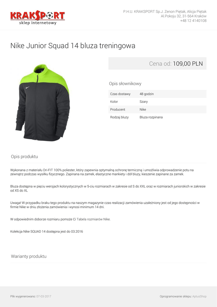 P.H.U. KRAKSPORT Sp.J. Zenon Piętak, Alicja Piętak Al.Pokoju 32, 31-564 Kraków +48 12 4140108 Nike Junior Squad 14 bluza treningowa Cena od: 109,00 PLN Opis słownikowy Czas dostawy 48 godzin Kolor Szary Producent Nike Rodzaj bluzy Bluza rozpinana Opis produktu Wykonana z materiału Dri-FIT 100% poliester, który zapewnia optymalną ochronę termiczną i umożliwia odprowadzenie potu na zewnątrz podczas wysiłku fizycznego. Zapinana na zamek, elastyczne mankiety i dół bluzy, kieszenie zapinane za zamek. Bluza dostępna w pięciu wersjach kolorystycznych w 5-ciu rozmiarach w zakresie od S do XXL oraz w rozmiarach juniorskich w zakresie od XS do XL Uwaga! W przypadku braku tego produktu na naszym magazynie czas realizacji zamówienia uzależniony jest od jego dostępności w firmie Nike w dniu złożenia zamówienia i wynosi minimum 14 dni. W odpowiednim doborze rozmiaru pomoże Ci Tabela rozmiarów Nike. Kolekcja Nike SQUAD 14 dostępna jest do 03.2016 Warianty produktu Plik wygenerowano: 07-03-2017 Oprogramowanie sklepu: AptusShop P.H.U. KRAKSPORT Sp.J. Zenon Piętak, Alicja Piętak Al.Pokoju 32, 31-564 Kraków +48 12 4140108 M 109,00 PLN XL 109,00 PLN Galeria Plik wygenerowano: 07-03-2017 Powered by TCPDF (www.tcpdf.org) Oprogramowanie sklepu: AptusShop
