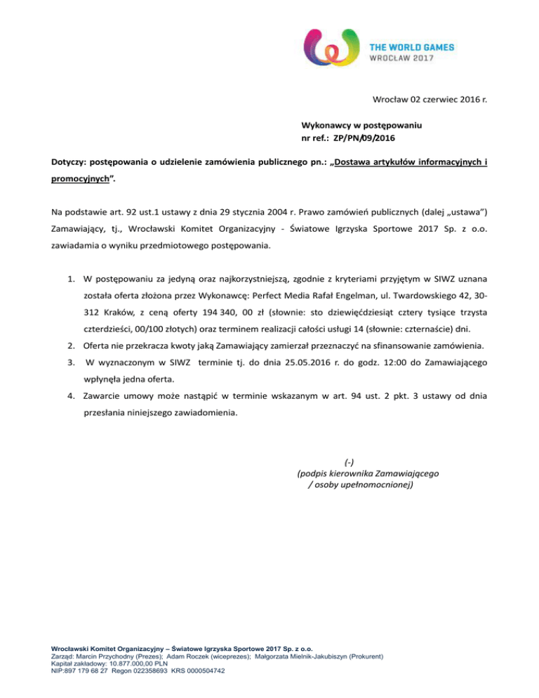 Wrocław 02 czerwiec 2016 r. Wykonawcy w postępowaniu nr ref.: ZP/PN/09/2016 Dotyczy: postępowania o udzielenie zamówienia publicznego pn.: „Dostawa artykułów informacyjnych i promocyjnych”. Na podstawie art. 92 ust.1 ustawy z dnia 29 stycznia 2004 r. Prawo zamówień publicznych (dalej „ustawa”) Zamawiający, tj., Wrocławski Komitet Organizacyjny - Światowe Igrzyska Sportowe 2017 Sp. z o.o. zawiadamia o wyniku przedmiotowego postępowania. 1. W postępowaniu za jedyną oraz najkorzystniejszą, zgodnie z kryteriami przyjętym w SIWZ uznana została oferta złożona przez Wykonawcę: Perfect Media Rafał Engelman, ul. Twardowskiego 42, 30312 Kraków, z ceną oferty 194 340, 00 zł (słownie: sto dziewięćdziesiąt cztery tysiące trzysta czterdzieści, 00/100 złotych) oraz terminem realizacji całości usługi 14 (słownie: czternaście) dni. 2. Oferta nie przekracza kwoty jaką Zamawiający zamierzał przeznaczyć na sfinansowanie zamówienia. 3. W wyznaczonym w SIWZ terminie tj. do dnia 25.05.2016 r. do godz. 12:00 do Zamawiającego wpłynęła jedna oferta. 4. Zawarcie umowy może nastąpić w terminie wskazanym w art. 94 ust. 2 pkt. 3 ustawy od dnia przesłania niniejszego zawiadomienia. (-) (podpis kierownika Zamawiającego / osoby upełnomocnionej) Wrocławski Komitet Organizacyjny – Światowe Igrzyska Sportowe 2017 Sp. z o.o. Zarząd: Marcin Przychodny (Prezes); Adam Roczek (wiceprezes); Małgorzata Mielnik-Jakubiszyn (Prokurent) Kapitał zakładowy: 10.877.000,00 PLN NIP:897 179 68 27 Regon 022358693 KRS 0000504742