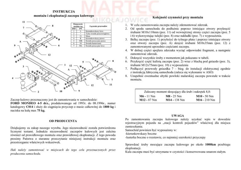 INSTRUKCJA montaŜu i eksploatacji zaczepu kulowego Kolejność czynności przy montaŜu 11 Oznaczenie zacisku wg ISO PN 1 L 2 + 3 31 4 R 5 58R 6 54 7 58L 8 7 A 6 9 Łączenie przewodów Kierunkowskazy lewe Tylne światła przeciwmgłowe Masa Kierunkowskazy prawe Światła pozycyjne prawe Światła hamowania Światła pozycyjne lewe 12 8 5 1 3 12 A 4 7 12 2 10 1. W celu zamontowania zaczepu naleŜy zdemontować zderzak. 2. Od spodu samochodu do podłuŜnic poprzez istniejące otwory przykręcić śrubami M10x110mm (poz. 11) od wewnętrznej strony części zaczepu (poz. 5 i 6) wykorzystując tulejki (poz. 8) oraz nakładki (poz. 7) z wyposaŜenia. 3. Belkę zaczepu (poz. 1) przyłoŜyć do tylnego płata i poprzez istniejące otwory oraz otwory zaczepu (poz. A) skręcić śrubami M10x35mm (poz. 12) z zamontowanymi uprzednio częściami zaczepu. 4. W dolnej części spojlera zderzaka wyciąć odpowiedni fragment, a następnie zamontować zderzak. 5. Dokręcić wszystkie śruby z momentem jak pokazano w tabeli. 6. Przykręcić część kulistą zaczepu (poz. 2) wraz z blachą pod gniazdo (poz. 3), śrubami M12x75mm (poz. 10) z wyposaŜenia 7. Podłączyć przewody gniazdka 7 – bieg. do instalacji elektrycznej zgodnie z instrukcją fabryczną samochodu (zaleca się wykonanie w ASO) 8. Uzupełnić ewentualne ubytki powłoki malarskiej zaczepu powstałe w trakcie montaŜu. 11 9 Zaczep kulowy przeznaczony jest do zamontowania w samochodzie: FORD MONDEO 4-5 drz., produkowanego od 1993r. do 08.1996r., numer katalogowy C014 i słuŜy do ciągnięcia przyczep o masie całkowitej do 1800 kg i nacisku na kulę max 75 kg. OD PRODUCENTA Dziękujemy za zakup naszego wyrobu. Jego niezawodność została potwierdzona licznymi testami. JednakŜe niezawodność zaczepów kulowych jest zaleŜna równieŜ od prawidłowego montaŜu oraz prawidłowej eksploatacji. Z tego powodu prosimy Państwa o staranne przeczytanie niniejszej instrukcji montaŜu oraz przestrzeganie właściwych wskazówek. Hak naleŜy zamontować w miejscach do tego celu przeznaczonych przez producenta samochodu. Zalecany moment skręcający dla śrub i nakrętek 8,8: M6 - 11 Nm M8 - 25 Nm M10 - 50 Nm M12 - 87 Nm M14 - 138 Nm M16 - 210 Nm UWAGA Po zamontowaniu zaczepu kulowego naleŜy uzyskać wpis w dowodzie rejestracyjnym pojazdu na „stacji kontroli pojazdów” właściwej dla miejsca zamieszkania. Samochód powinien być wyposaŜony w: -kierunkowskazy boczne -lusterka boczne o rozstawie, co najmniej szerokości przyczepy Sprawdzać śruby mocujące zaczepu kulowego po około 1000km przebiegu eksploatacji. Kula zaczepu musi być utrzymana w czystości i konserwowana smarem stałym. PPUH AUTO-HAK S.J. WyposaŜenie zaczepu: Produkcja Zaczepów Kulowych Henryk & Zbigniew Nejman 76-200 SŁUPSK ul. Słoneczna 16K tel/fax (059) 8-414-414; 8-414-413 E-mail: [email protected] www. autohak.com.pl Zaczep kulowy bez wyposaŜenia elektrycznego C014 Klasa: A50-X Nr kat. Przeznaczony do zamontowania w samochodzie: Producent: FORD Model: MONDEO Typ: 4-5 drz. produkowanego od 1993r. do 08.1996r. Dane techniczne: Wartość siły D: 8,83 kN maksymalna masa przyczepy: 1800 kg maksymalny nacisk na kulę: 75 kg Numer homologacji zgodnie z Dyrektywą 94/20/WE: e20*94/20*0244*00 KARTA GWARANCYJNA Producent udziela gwarancji niniejszą kartą gwarancyjną na okres 24 miesięcy licząc od dnia zakupu zaczepu kulowego do samochodu: FORD MONDEO 4-5drz. produkowanego od 1993r. do 08.1996r. Data produkcji .............................. Data zakupu.......................................... Zakres gwarancji obejmuje wyłącznie wady jakościowe wynikające z winy producenta. Gwarancja nie obejmuje natomiast uszkodzeń zawinionych przez nabywcę, wynikających z niewłaściwego montaŜu, uŜytkowania lub konserwacji, uszkodzeń mechanicznych, normalnego zuŜycia podczas eksploatacji itp. Gwarancja udzielona na zakupiony towar nie wyłącza, nie ogranicza ani nie zawiesza uprawnień kupującego wynikających z niezgodności towaru z umową. Reklamacje naleŜy zgłaszać w punkcie sprzedaŜy, składając jednocześnie kartę gwarancyjną. Usunięcie "wady" następuje po stwierdzeniu przez punkt sprzedaŜy wspólnie z producentem słuszności złoŜonej reklamacji. Reklamacja powinna być załatwiona w ciągu 14 dni od dnia uznania reklamacji. Karta gwarancyjna jest niewaŜna jeŜeli nie jest wypełniona i podpisana. Data zgłoszenia reklamacji: ................................................................... INFORMACJA WSTĘPNA Zaczep kulowy jest skonstruowany zgodnie z zasadami bezpieczeństwa ruchu drogowego. Zaczep kulowy jest elementem wpływającym na bezpieczeństwo jazdy i moŜe zostać zainstalowany wyłącznie przez personel wyspecjalizowany. Niedopuszczalne jest dokonywanie jakichkolwiek zmian w konstrukcji zaczepu. Powoduje to wygaśniecie dopuszczenia do stosowania. W przypadku obecności masy izolacyjnej lub osłony podwozia w miejscu przylegania zaczepu, naleŜy ją usunąć. Nieosłonięte miejsca karoserii oraz wywiercone otwory naleŜy pomalować farbą antykorozyjną. Informacjami wiąŜącymi odnośnie wartości obciąŜeń są dane podawane przez producenta samochodu, względnie wartości maksymalnej masy przyczepy oraz maksymalnego nacisku na kulę, przy czym wartości parametrów zaczepu kulowego nie mogą być przekroczone. Wzór do obliczania wartości siły D: Maks. masa przyczepy [kg] x Maks. masa samochodu [kg] Maks. masa przyczepy [kg] + Maks. masa samochodu [kg] X 9,81 = 1000 D [kN]