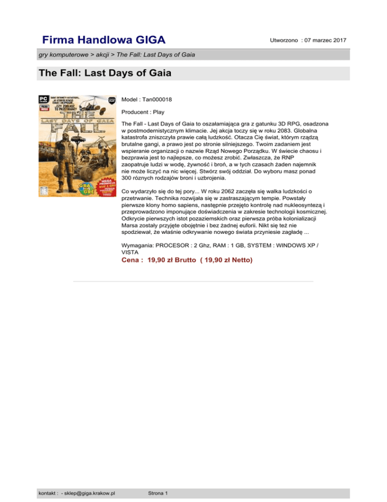 Firma Handlowa GIGA Utworzono : 07 marzec 2017 gry komputerowe > akcji > The Fall: Last Days of Gaia The Fall: Last Days of Gaia Model : Tan000018 Producent : Play The Fall - Last Days of Gaia to oszałamiająca gra z gatunku 3D RPG, osadzona w postmodernistycznym klimacie. Jej akcja toczy się w roku 2083. Globalna katastrofa zniszczyła prawie całą ludzkość. Otacza Cię świat, którym rządzą brutalne gangi, a prawo jest po stronie silniejszego. Twoim zadaniem jest wspieranie organizacji o nazwie Rząd Nowego Porządku. W świecie chaosu i bezprawia jest to najlepsze, co możesz zrobić. Zwłaszcza, że RNP zaopatruje ludzi w wodę, żywność i broń, a w tych czasach żaden najemnik nie może liczyć na nic więcej. Stwórz swój oddział. Do wyboru masz ponad 300 róznych rodzajów broni i uzbrojenia. Co wydarzyło się do tej pory... W roku 2062 zaczęła się walka ludzkości o przetrwanie. Technika rozwijała się w zastraszającym tempie. Powstały pierwsze klony homo sapiens, następnie przejęto kontrolę nad nukleosyntezą i przeprowadzono imponujące doświadczenia w zakresie technologii kosmicznej. Odkrycie pierwszych istot pozaziemskich oraz pierwsza próba kolonializacji Marsa zostały przyjęte obojętnie i bez żadnej euforii. Nikt się też nie spodziewał, że właśnie odkrywanie nowego świata przyniesie zagładę ... Wymagania: PROCESOR : 2 Ghz, RAM : 1 GB, SYSTEM : WINDOWS XP / VISTA Cena : 19,90 zł Brutto ( 19,90 zł Netto) kontakt : - [email protected] Strona 1