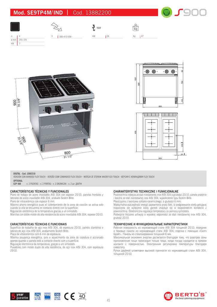 Mod. SE9TP4M/ IND | Cod. 13882200 270 x 310 kW 7 900 4 ø mm V 380-415 V3N~ kW 28 Kg 87 35 3/8” n. / 35 3 900 8” 800 31 1/2” DIGITAL - Cod. 13882210 VERSIÓN CON MANDOS FLEX TOUCH - VERSÃO COM COMANDOS FLEX TOUCH - WERSJA ZE STEROW ANIEM FLEX TOUCH - ВЕРСИЯ С КОМАНДАМИ FLEX TOUCH OPTIONAL S2P 400 n. 2 PUERTAS - n. 2 PORTAS - n. 2 DRZWICZKI - n. 2 шт. ДВЕРИ CARACTERÍSTICAS TÉCNICAS Y FUNCIONALES CHARAKTERYSTYKI TECHNICZNE I FUNKCJONALNE Plano de trabajo de acero inoxidable AISI 304 con espesor 20/10, paneles frontales y laterales de acero inoxidable AISI 304, acabado Scotch Brite. Plano de vitrocerámica con espesor 6 mm. Máximo ahorro energético pues el calentamiento de la zona de cocción se activa solo cuando la olla se encuentra en contacto directo con la superficie. Regulación electrónica de la temperatura gracias a un simostato. Manillas con doble molde de alta resistencia de acero inoxidable AISI 304, espesor 20/10. Powierzchnia robocza ze stali nierdzewnej inox AISI 304 o grubości 20/10, panele przednie i boczne ze stali nierdzewnej inox AISI 304, wykończenie typu Scotch Brite. Płaszczyzna z tworzywa szklano-ceramicznego, o grubości 6 mm. Maksymalna oszczędność energii zapewniona przez fakt, iż podgrzewanie strefy gotującej rozpoczyna się wyłącznie kiedy garnek znajduje się w bezpośrednim kontakcie z powierzchnią. Elektroniczna regulacja temperatury za pomocą symostatu. Podwójnie tłoczone uchwyty o wysokiej odporności ze stali nierdzewnej inox AISI 304, grubość 20/10. CARACTERÍSTICAS TÉCNICAS E FUNCIONAIS ТЕХНИЧЕСКИЕ И ФУНКЦИОНАЛЬНЫЕ ХАРАКТЕРИСТИКИ Superfície de trabalho de aço inox AISI 304, de espessura 20/10, painéis dianteiros e laterais de aço inox AISI 304, acabamento Scotch Brite. Placa de vitrocerâmica com 6 mm de espessura. Máxima poupança energética, pois o aquecimento da zona de cozedura é accionado apenas quando a panela está a contacto directo com a superfície. Regulação electrónica da temperatura, graças a um simostato. Puxadores com molde duplo de alta resistência, de aço inox AISI 304, com espessura 20/10. Рабочая поверхность из нержавеющей стали AISI 304 толщиной 20/10, передние и боковые панели из нержавеющей стали AISI 304, отделка с помощью «Скотч Брайт». Панель из стеклокерамики толщиной 6 мм. Максимальная экономия энергии достигается благодаря тому, что разогрев зоны приготовления пищи происходит только тогда, когда посуда находится в прямом контакте с поверхностью. Электронная регулировка температуры благодаря симостату. Ручки двойной штамповки высокой прочности из нержавеющей стали AISI 304, толщиной 20/10. 45