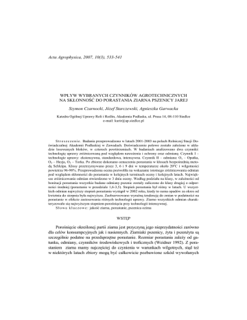 Acta Agrophysica, 2007, 10(3), 533-541 WPŁYW WYBRANYCH CZYNNIKÓW AGROTECHNICZNYCH NA SKŁONNOŚĆ DO PORASTANIA ZIARNA PSZENICY JAREJ Szymon Czarnocki, Józef Starczewski, Agnieszka Garwacka Katedra Ogólnej Uprawy Roli i Roślin, Akademia Podlaska, ul. Prusa 14, 08-110 Siedlce e-mail: [email protected] S t r e s z c z e n i e . Badania przeprowadzono w latach 2001-2003 na polach Rolniczej Stacji Doświadczalnej Akademii Podlaskiej w Zawadach. Doświadczenie polowe zostało załoŜone w układzie losowanych bloków, w czterech powtórzeniach. W badaniach analizowano dwa czynniki: technologię uprawy zróŜnicowaną pod względem nawoŜenia i ochrony oraz odmianę. Czynnik I – technologie uprawy: ekstensywna, standardowa, intensywna. Czynnik II – odmiana: O1 – Opatka, O2 – Hezja, O3 – Torka. Po zbiorze dokonano oznaczenia porastania w kłosach bezpośrednią metodą Schleipa. Kłosy przetrzymywano przez 3, 6 i 9 dni w temperaturze około 20oC i wilgotności powietrza 96-98%. Przeprowadzona ocena pozwoliła na wskazanie istotnego zróŜnicowania odmian pod względem skłonności do porastania w kolejnych terminach oceny i kolejnych latach. Największe zróŜnicowanie odmian stwierdzono w 3 dniu oceny. Według podziału na klasy, w zaleŜności od bonitacji porastania wszystkie badane odmiany pszenic zostały zaliczone do klasy drugiej o odporności średniej (porastanie w przedziale 1,6-3,5). Stopień porastania był róŜny w latach. U wszystkich odmian najwyŜszy stopień porastania wystąpił w 2002 roku, kiedy to suma opadów za okres od kwietnia do sierpnia była najwyŜsza. Zaobserwowano wyraźną tendencję do zmian w podatności na porastanie w efekcie zastosowania róŜnych technologii uprawy. Ziarno wszystkich odmian charakteryzowało się najwyŜszym stopniem porośnięcia przy technologii intensywnej. S ł o w a k l u c z o w e : jakość ziarna, porastanie, pszenica ozima WSTĘP Porośnięcie określonej partii ziarna jest przyczyną jego nieprzydatności zarówno dla celów konsumpcyjnych jak i nasiennych. Ziarniaki pszenicy, Ŝyta i pszenŜyta są szczególnie podatne na przedsprzętne porastanie. Rozmiar porastania zaleŜy od gatunku, odmiany, czynników środowiskowych i troficznych (Weidner 1992). Z porastaniem ziarna mamy najczęściej do czynienia w warunkach wilgotnych, stąd teŜ w niektórych latach zbiory mogą być całkowicie pozbawione szkód wywołanych 534 S. CZARNOCKI i in. porastaniem natomiast w innych latach straty mogą być bardzo duŜe. Straty plonu zbóŜ spowodowane tym zjawiskiem sięgają w Polsce średnio 5-10% ogólnej produkcji, jednak w niektórych latach, kiedy pogoda jest wyraźnie niekorzystna mogą przybrać rozmiary klęski. Celem przeprowadzonych badań była ocena skłonności do porastania ziarna w kłosach trzech wybranych odmian pszenicy jarej przy róŜnej intensywności technologii uprawy. MATERIAŁ I METODY Badania przeprowadzono w latach 2001-2003 na polach Rolniczej Stacji Doświadczalnej Akademii Podlaskiej w Zawadach. Doświadczenia polowe zostały załoŜone w układzie losowanych bloków, w czterech powtórzeniach. W badaniach analizowano dwa czynniki: technologię uprawy zróŜnicowaną pod względem nawoŜenia i ochrony oraz odmianę. Czynnik I – technologie uprawy: • T1 technologia ekstensywna extensive technology – nawoŜenie: N – 60 kg·ha-1, P – 13,2 kg·ha-1, K – 33,2 kg·ha-1, zwalczanie chwastów: Chwastox Extra 300 SL 3 l·ha-1, • T2 technologia standardowa conventional technology – nawoŜenie: N – 90 kg·ha-1, P – 26,4 kg·ha-1, K – 66,4 kg·ha-1, zwalczanie chwastów: Chwastox Extra 300 SL 3 l·ha-1, • T3 technologia intensywna intensive technology – nawoŜenie: N – 120 kg·ha-1, P – 39,6 kg·ha-1, K – 99,6 kg·ha-1, zwalczanie chwastów: Puma Uniwersal + Chwastox Extra 300 SL 1+ 3 l·ha-1, antywylegacz: Bercema CCC 2 l·ha-1, zwalczanie chorób: Dithane 75 WG 2 kg·ha-1, Alert 375 SC 1 l·ha-1, zwalczanie szkodników: Decis 2,5 EC 0,3 l·ha-1. Czynnik II – odmiana: O1 – Opatka , O2 – Hezja, O3 – Torka. Porastanie w kłosach wykonano bezpośrednią metodą Schleipa. Kłosy przetrzymywane są w pozycji pionowej w warunkach prowokacyjnych. Oznaczenia wykonano dla kaŜdej odmiany w 3 powtórzeniach. Kłosy przetrzymywano przez 3, 6 i 9 dni w temperaturze około 20oC i wilgotności powietrza 96-98%, uzyskiwanej przez dwukrotne zraszanie kłosów w ciągu dnia. W ocenie wyróŜniono następujące stopnie porastania: 1 – ziarniaki nie objawiające porastania, 2 – ziarniaki z uszkodzoną okrywą nasienną w okolicy zarodka, 3 – ziarniaki kiełkujące, których kiełki nie przekraczały długości ziarniaka, 4 – ziarniaki kiełkujące, których kiełki były dłuŜsze od długości ziarniaka. WPŁYW WYBRANYCH CZYNNIKÓW AGROTECHNICZNYCH 535 Dla obliczenia współczynnika porastania (Wp) zaproponowano wzór, w którym sumowane iloczyny uwzględniają sumę ziarniaków porośniętych w kolejnych stopniach porastania oraz wartości odpowiednich stopni porastania od 1 do 4. W ten sposób obliczone współczynniki mogą przyjmować wartości od 1 do 4, przy czym wartości zbliŜone do 1 oznaczają brak porastania, a wartości zbliŜone do 4 wskazują silne porastanie. Wszystkie oceniane odmiany podzielono na umowne klasy w zaleŜności od bonitacji porastania. Do klasy pierwszej zaliczono obiekty odporne, lub porastające nieznacznie, sklasyfikowane w zakresie 1,5 i poniŜej, do klasy drugiej obiekty o odporności średniej w zakresie 1,6-3,5 a do trzeciej klasy porastające najsilniej (od 3,6 do 4,0) Analizy wyników dokonano zgodnie z modelem odpowiednim dla doświadczenia trzyczynnikowego załoŜonego w układzie losowanych bloków. Szczegółowego porównania średnich dokonano przy pomocy testu t-Tukey’a przy poziomie istotności α = 0,05. Z punktu widzenia potrzeb roślin bardzo duŜe znaczenie ma temperatura szczególnie w okresie dojrzewania. Słoneczna i cie
