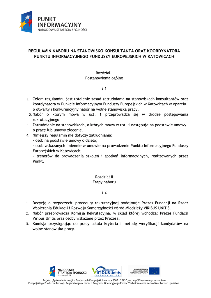 REGULAMIN NABORU NA STANOWISKO KONSULTANTA ORAZ KOORDYNATORA PUNKTU INFORMACYJNEGO FUNDUSZY EUROPEJSKICH W KATOWICACH Rozdział I Postanowienia ogólne §1 1. Celem regulaminu jest ustalenie zasad zatrudniania na stanowiskach konsultantów oraz koordynatora w Punkcie Informacyjnym Funduszy Europejskich w Katowicach w oparciu o otwarty i konkurencyjny nabór na wolne stanowiska pracy. 2. Nabór o którym mowa w ust. 1 przeprowadza się w drodze postępowania rekrutacyjnego. 3. Zatrudnienie na stanowiskach, o których mowa w ust. 1 następuje na podstawie umowy o pracę lub umowy zlecenie. 4. Niniejszy regulamin nie dotyczy zatrudniania: - osób na podstawie umowy o dzieło; - osób wskazanych imiennie w umowie na prowadzenie Punktu Informacyjnego Funduszy Europejskich w Katowicach; - trenerów do prowadzenia szkoleń i spotkań informacyjnych, realizowanych przez Punkt. Rozdział II Etapy naboru §2 1. Decyzję o rozpoczęciu procedury rekrutacyjnej podejmuje Prezes Fundacji na Rzecz Wspierania Edukacji i Rozwoju Samorządności wśród Młodzieży VIRIBUS UNITIS. 2. Nabór przeprowadza Komisja Rekrutacyjna, w skład której wchodzą: Prezes Fundacji Viribus Unitis oraz osoby wskazane przez Prezesa. 3. Komisja przystępując do pracy ustala kryteria i metodę weryfikacji kandydatów na wolne stanowiska pracy. Projekt „System Informacji o Funduszach Europejskich na lata 2007 - 2013” jest współfinansowany ze środków Europejskiego Funduszu Rozwoju Regionalnego w ramach Programu Operacyjnego Pomoc Techniczna oraz ze środków budżetu państwa. §3 Procedura rekrutacyjna składa się z następujących etapów: 1. 2. 3. 4. 5. 6. Decyzji w sprawie wszczęcia postępowania i ogłoszenia o naborze na wolne stanowisko. Przyjmowanie dokumentów aplikacyjnych. Wstępna selekcja kandydatów (analizy złożonych dokumentów). Selekcji końcowej kandydatów (rozmowa kwalifikacyjna). Sporządzenia protokołu z przeprowadzone naboru na wolne stanowisko. Informacji o wyniku naboru. Rozdział III Ogłoszenie o naborze na wolne stanowisko §4 1. Ogłoszenie o naborze na wolne stanowisko umieszcza się na: a) tablicy informacyjnej w siedzibie Fundacji Viribus Unitis; b) stronie internetowej Fundacji VIRIBUS UNITIS; c) na portalu zawierającym oferty pracy (o zasięgu ogólnopolskim). 2. Ogłoszenie o naborze na wolne stanowisko pracy zawiera: a) nazwę Fundacji; b) opis zakresu obowiązków; c) określenie wymagań związanych ze stanowiskiem pracy. Rozdział IV Składanie i przyjmowanie dokumentów aplikacyjnych §5 1. Po umieszczeniu ogłoszenia na stronie internetowej Fundacji VIRIBUS UNITIS, na tablicy informacyjnej oraz na ogólnopolskim portalu następuje przyjmowanie dokumentów aplikacyjnych od kandydatów zainteresowanych pracą. 2. Na pierwszym etapie rekrutacji wymagane jest złożenie życiorysu – curriculum vitae. 3. Dokumenty aplikacyjne przyjmowane są w formie elektronicznej za pośrednictwem ogólnopolskiego portalu, skrzynki e-mailowej [email protected] oraz [email protected]. Dokumenty aplikacyjne można także przesłać pocztą na adres Fundacji Viribus Unitis lub złożyć osobiście. Projekt „System Informacji o Funduszach Europejskich na lata 2007 - 2013” jest współfinansowany ze środków Europejskiego Funduszu Rozwoju Regionalnego w ramach Programu Operacyjnego Pomoc Techniczna oraz ze środków budżetu państwa. Rozdział V Wstępna selekcja kandydatów §6 1. Wstępnej oceny dokumentów dokonuje Komisja Rekrutacyjna. 2. Ocena polega na zapoznaniu się z życiorysem kandydatów oraz wyborze kandydatów, którzy spełniają kryteria ubiegania się o pracę na danym stanowisku (podane w ofercie pracy). Osoby spełniające kryteria przechodzą do drugiego etapu rekrutacji – etapu ustnego. Rozdział VI Selekcja końcowa kandydatów §7 1. W ramach selekcji końcowej kandydatów dokonywanej w oparciu o kryteria podane w ogłoszeniu o pracy oraz rozmowę kwalifikacyjną, Komisja Rekrutacyjna dokonuje weryfikacji informacji uzyskanych od kandydatów. 2. W trakcie rozmowy kwalifikacyjnej Komisja zapoznaje się także z kserokopią dokumentów potwierdzających doświadczenie zawodowe, wykształcenie oraz ukończone kursy i szkolenia. Rozdział VII Selekcja końcowa kandydatów §8 1. Po zakończeniu naboru Komisja Rekrutacyjna sporządza protokół. 2. Protokół zawiera w szczególności: a) określenie stanowiska pracy, na jakie przeprowadzany był nabór; b) określenie liczby nadesłanych ofert; c) imiona i nazwiska kandydatów, którzy zakwalifikowali się do etapu ustnego; d) informację o zastosowanych metodach i technikach naboru; e) uzasadnienie dokonanego wyboru; f) imiona i nazwiska oraz podpisy Komisji przeprowadzającej nabór. Projekt „System Informacji o Funduszach Europejskich na lata 2007 - 2013” jest współfinansowany ze środków Europejskiego Funduszu Rozwoju Regionalnego w ramach Programu Operacyjnego Pomoc Techniczna oraz ze środków budżetu państwa. Rozdział VIII Informacja o wynikach naboru §9 1. Informację o wyniku naboru upowszechnia się w terminie do 7 dni od dnia zakończenia procedury naboru. 2. Informacja, o której mowa w ust. 1 zawiera: a) nazwę i adres jednostki; b) określenie stanowiska pracy; c) imię i nazwisko wybranego kandydata; d) uzasadnienie dokonanego wyboru albo uzasadnienie nierozstrzygnięcia naboru na stanowisko. 3. Informację o wyniku naboru upowszechnia się na stronie internetowej Fundacji VIRIBUS UNITIS oraz na tablicy informacyjnej. Rozdział IX Sposób postępowania z dokumentami aplikacyjnymi § 10 1. Dokumenty aplikacyjne kandydata, który zostanie wyłoniony w procesie rekrutacji, zostaną dołączone do jego akt osobowych. 2. Dokumenty aplikacyjne osób, poza kandydatem wskazanym do zatrudnienia, będą odbierane osobiście przez kandydatów, a nieodebrane w przeciągu 6 miesięcy od zakończenia postępowania podlegają zniszczeniu. 3. Fundacja Viribus Unitis zastrzega sobie prawo wykonania i zachow