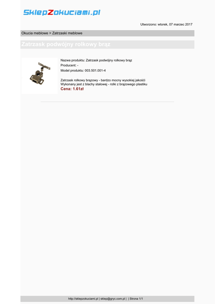 Utworzono: wtorek, 07 marzec 2017 Okucia meblowe > Zatrzaski meblowe Zatrzask podwójny rolkowy brąz Nazwa produktu: Zatrzask podwójny rolkowy brąz Producent: Model produktu: 003.501.001-4 Zatrzask rolkowy brązowy - bardzo mocny wysokiej jakośći Wykonany jest z blachy stalowej - rolki z brązowego plastiku Cena: 1.61zł http://sklepzokuciami.pl | [email protected] | | Strona 1/1