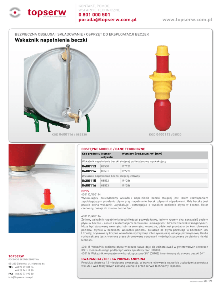 KONTAKT, POMOC, WSPARCIE TECHNICZNE 0 801 000 501 [email protected] www.topserw.com.pl BEZPIECZNA OBSŁUGA I SKŁADOWANIE / OSPRZĘT DO EKSPLOATACJI BECZEK Wskaźnik napełnienia beczki KOD 0400116 / 085330 KOD 0400113 /08530 DOSTĘPNE MODELE / DANE TECHNICZNE Kod produktu Numer artykułu Wymiary Śred.zewn.*W (mm) Wskaźnik napełnienia beczki stojącej, polietylenowy, wyskakujący 0400113 0400114 08530 19*127 08531 19*279 Wskaźnik napełnienia beczki leżącej, żeliwny 0400115 0400116 08532 19*286 08533 19*286 OPIS 400113/400114 Wyskakujący, polietylenowy wskaźnik napełnienia beczki stojącej jest tanim rozwiązaniem zapobiegającym przelaniu płynu przy napełnianiu beczki płynami odpadowymi. Gdy beczka jest prawie pełna wskaźnik „wyskakuje”, ostrzegając o wysokim poziomie płynu w beczce. Kolor czerwony, pasuje do otworu beczki 3/4”. 400115/400116 Żeliwny wskaźnik napełnienia beczki leżącej pozwala łatwo, jednym rzutem oka, sprawdzić poziom płynu w beczce – koniec z reklamacjami zamówień i „znikającymi” litrami z beczek w magazynach. Może być stosowany wewnątrz lub na zewnątrz, wszędzie, gdzie jest przydatny do kontrolowania poziomu płynów w beczkach. Wskaźnik poziomu pokazuje ile płynu pozostaje w beczkach 200 l.Trwały, ocynkowany korpus wskaźnika wytrzymuje intensywną eksploatację przemysłową. Gruba rurka szklana jest chroniona przez chromowaną obudowę i może być stosowana do olejów o niskiej lepkości. 400115 Wskaźnik poziomu płynu w beczce łatwo daje się zainstalować w gwintowanych otworach 3/4” i można do niego podłączyć kurek spustowy 3/4” (08902). 400116 Wskaźnik wyposażony w kurek spustowy 3⁄4” (08902) i montowany do otworu beczki 3⁄4”. TOPSERW POCZUCIE BEZPIECZEŃSTWA 05-220 Zielonka, ul. Marecka 66 TEL +48 22 771 04 56 +48 22 761 11 80 FAX +48 22 771 93 80 [email protected] GWARANCJA / OPIEKA POGWARANCYJNA Produkty objęte są 12 miesięczną gwarancją. W trakcie jej trwania wszystkie uszkodzenia powstałe wskutek wad fabrycznych zostaną usunięte przez serwis techniczny Topserw. KOD 0400113 08530 str. 1/1
