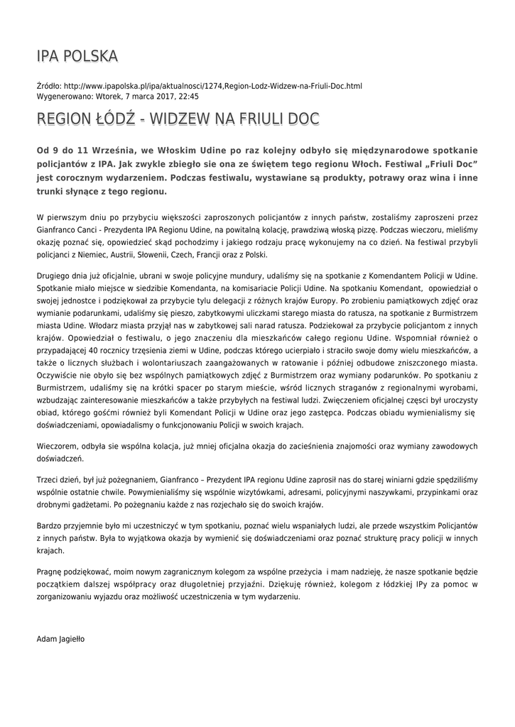 IPA POLSKA Źródło: http://www.ipapolska.pl/ipa/aktualnosci/1274,Region-Lodz-Widzew-na-Friuli-Doc.html Wygenerowano: Wtorek, 7 marca 2017, 22:45 REGION ŁÓDŹ - WIDZEW NA FRIULI DOC Od 9 do 11 Września, we Włoskim Udine po raz kolejny odbyło się międzynarodowe spotkanie policjantów z IPA. Jak zwykle zbiegło sie ona ze świętem tego regionu Włoch. Festiwal „Friuli Doc” jest corocznym wydarzeniem. Podczas festiwalu, wystawiane są produkty, potrawy oraz wina i inne trunki słynące z tego regionu. W pierwszym dniu po przybyciu większości zaproszonych policjantów z innych państw, zostaliśmy zaproszeni przez Gianfranco Canci - Prezydenta IPA Regionu Udine, na powitalną kolację, prawdziwą włoską pizzę. Podczas wieczoru, mieliśmy okazję poznać się, opowiedzieć skąd pochodzimy i jakiego rodzaju pracę wykonujemy na co dzień. Na festiwal przybyli policjanci z Niemiec, Austrii, Słowenii, Czech, Francji oraz z Polski. Drugiego dnia już oficjalnie, ubrani w swoje policyjne mundury, udaliśmy się na spotkanie z Komendantem Policji w Udine. Spotkanie miało miejsce w siedzibie Komendanta, na komisariacie Policji Udine. Na spotkaniu Komendant, opowiedział o swojej jednostce i podziękował za przybycie tylu delegacji z różnych krajów Europy. Po zrobieniu pamiątkowych zdjęć oraz wymianie podarunkami, udaliśmy się pieszo, zabytkowymi uliczkami starego miasta do ratusza, na spotkanie z Burmistrzem miasta Udine. Włodarz miasta przyjął nas w zabytkowej sali narad ratusza. Podziekował za przybycie policjantom z innych krajów. Opowiedział o festiwalu, o jego znaczeniu dla mieszkańców całego regionu Udine. Wspomniał również o przypadającej 40 rocznicy trzęsienia ziemi w Udine, podczas którego ucierpiało i straciło swoje domy wielu mieszkańców, a także o licznych służbach i wolontariuszach zaangażowanych w ratowanie i później odbudowe zniszczonego miasta. Oczywiście nie obyło się bez wspólnych pamiątkowych zdjęć z Burmistrzem oraz wymiany podarunków. Po spotkaniu z Burmistrzem, udaliśmy się na krótki spacer po starym mieście, wśród licznych straganów z regionalnymi wyrobami, wzbudzając zainteresowanie mieszkańców a także przybyłych na festiwal ludzi. Zwięczeniem oficjalnej częsci był uroczysty obiad, którego gośćmi również byli Komendant Policji w Udine oraz jego zastępca. Podczas obiadu wymienialismy się doświadczeniami, opowiadalismy o funkcjonowaniu Policji w swoich krajach. Wieczorem, odbyła sie wspólna kolacja, już mniej oficjalna okazja do zacieśnienia znajomości oraz wymiany zawodowych doświadczeń. Trzeci dzień, był już pożegnaniem, Gianfranco – Prezydent IPA regionu Udine zaprosił nas do starej winiarni gdzie spędziliśmy wspólnie ostatnie chwile. Powymienialiśmy się wspólnie wizytówkami, adresami, policyjnymi naszywkami, przypinkami oraz drobnymi gadżetami. Po pożegnaniu każde z nas rozjechało się do swoich krajów. Bardzo przyjemnie było mi uczestniczyć w tym spotkaniu, poznać wielu wspaniałych ludzi, ale przede wszystkim Policjantów z innych państw. Była to wyjątkowa okazja by wymienić się doświadczeniami oraz poznać strukturę pracy policji w innych krajach. Pragnę podziękować, moim nowym zagranicznym kolegom za wspólne przeżycia i mam nadzieję, że nasze spotkanie będzie początkiem dalszej współpracy oraz długoletniej przyjaźni. Dziękuję również, kolegom z łódzkiej IPy za pomoc w zorganizowaniu wyjazdu oraz możliwość uczestniczenia w tym wydarzeniu. Adam Jagiełło Ocena: 4/5 (1) Tweetnij Łódzka Grupa Wojewódzka IPA