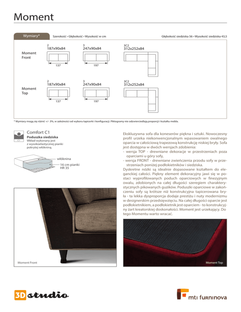 Moment Wymiary* Szerokość • Głębokość • Wysokość w cm 2 187x90x84 3 247x90x84 Moment Front 137 2 Moment Top 187x90x84 137 Głębokość siedziska 56 • Wysokość siedziska 43,5 3C2 312x252x84 197 3 247x90x84 3C2 312x252x84 197 * Wymiary mogą się różnić +/- 3%, w zależności od wyboru tapicerki i konfiguracji. Piktogramy nie odzwierciedlają proporcji i kształtu mebla. Comfort C1 Poduszka siedziska C1 Wkład wykonany jest z wysokoelastycznej pianki pokrytej włókniną. włóknina 16 cm pianki HR 35 Moment Front Ekskluzywna sofa dla koneserów piękna i sztuki. Nowoczesny profil urzeka niekonwencjonalnym wpasowaniem owalnego oparcia w całościową trapezową konstrukcję niskiej bryły. Sofa jest dostępna w dwóch wersjach zdobienia: - wersja TOP - drewniane dekoracje w przestrzeniach poza oparciami u góry sofy, - wersja FRONT - drewniane zwieńczenia przodu sofy w przestrzeniach poniżej podłokietników i siedziska. Dyskretne nóżki są idealnie dopasowane kształtem do eleganckiej całości. Piękny element dekoracyjny jawi się w postaci wyprofilowanych poduch oparciowych w finezyjnym owalu, zdobionych na całej długości szeregiem charakterystycznych pikowanych guzików. Poduszki oparciowe w zakończeniu sofy są krótsze niż konstrukcyjna tapicerowana bryła - ta lekka dysproporcja dodaje prestiżu i nuty modernizmu w designerskim przedsięwzięciu. Na całej długości oparcie jest podłokietnikiem, a podłokietnik jest oparciem - to konstrukcyjny żart kreatorskiej doskonałości. Moment jest urzekający. Do tego Momentu warto wracać. Moment Top
