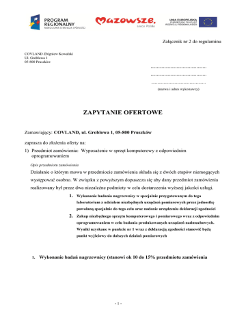 Załącznik nr 2 do regulaminu COVLAND Zbigniew Kowalski Ul. Groblowa 1 05-800 Pruszków ............................................. ............................................. ............................................ (nazwa i adres wykonawcy) ZAPYTANIE OFERTOWE Zamawiający: COVLAND, ul. Groblowa 1, 05-800 Pruszków zaprasza do złożenia oferty na: 1) Przedmiot zamówienia: Wyposażenie w sprzęt komputerowy z odpowiednim oprogramowaniem Opis przedmiotu zamówienia Działanie o którym mowa w przedmiocie zamówienia składa się z dwóch etapów niemogących występować osobno. W związku z powyższym dopuszcza się aby dany przedmiot zamówienia realizowany był przez dwa niezależne podmioty w celu dostarczenia wyższej jakości usługi. 1. Wykonanie badania nagrzewnicy w specjalnie przygotowanym do tego laboratorium z udziałem niezbędnych urządzeń pomiarowych przez jednostkę powołaną specjalnie do tego celu oraz nadanie urządzeniu deklaracji zgodności 2. Zakup niezbędnego sprzętu komputerowego i pomiarowego wraz z odpowiednim oprogramowaniem w celu badania produkowanych urządzeń nadmuchowych. Wyniki uzyskane w punkcie nr 1 wraz z deklaracją zgodności stanowić będą punkt wyjściowy do dalszych działań pomiarowych 1. Wykonanie badań nagrzewnicy (stanowi ok 10 do 15% przedmiotu zamówienia -1- 2. Zakup sprzętu z odpowiednim oprogramowaniem (stanowi ok 85 do 90 przedmiotu zamówienia) Sprzęt komputerowy klasy PC z programem do obliczeń właściwości budowanych urządzeń. Sprzęt musi być dopasowany do wymagań dostarczonego oprogramowania pozwalając mu na szybką i stabilna pracę. Dostarczony software może być seryjnie sprzedawanym pakietem jednak wyłącznie z prawem do adaptacji wg potrzeb zamawiającego. Podmiot dostarczający przedmiot zamówienia musi mieć możliwości adaptacji programu we własnym zakresie bez konieczności korzystania ze wsparcia trzeciej strony. W przypadku opracowania i wdrożenia programu autorskiego autor musi zapewnić wsparcie techniczne przez okres 12 miesięcy w sytuacji pojawienia się nieprzewidzianych bądź niepożądanych działań. Opis przedmiotowego sprzętu: - Stanowisko komputerowe obsługujący dostarczone oprogramowanie - Analizator spalin z wydrukiem - Falownik prędkości pracy silników urządzenia 8A - Regulator napięcia 8A - Stopniowy regulator napięcia - Regulator pracy palnika do mocy 25 kW - Regulator pracy palnika do mocy 32 kW - Regulator pracy palnika do mocy 42 kW - Regulator pracy palnika do mocy 60 kW - Regulator pracy palnika do mocy 75 kW - Regulator pracy palnika do mocy 100 kW - Waga platformowa do 2000 kg - Miernik prądu - Zdalny termometr laserowy Opis przedmiotowego oprogramowania: - System operacyjny - Program do analizy pracy urządzeń nadmuchowych na paliwa stałe. Program musi obsługiwać następujące sfery: 1. Wyliczanie mocy urządzenia po wprowadzeniu następujących danych: - wartość opałowa paliwa -2- - dawkowanie paliwa na godzinę - maksymalna ilość przedmuchiwanego powietrza przez wentylator na godzinę - dławienie wentylatora regulatorem napięcia - kubatura komory spalania - maksymalna moc palnika 2. Wyliczanie sprawności urządzenia (podawane parametry) - wartość opałowa paliwa - ilość użytego paliwa na godzinę - przyrost temperatury w określonej kubaturze pomieszczenia na godzinę (kubatura pomieszczenia określana na podstawie parametrów: wysokość, szerokość, głębokość, stopień ocieplenia) 3. Wyliczanie kubatury komory spalania (podawane parametry) - 2) Termin realizacji zamówienia: do 30.09.2012 3) Miejsce lub sposób uzyskania dodatkowej informacji o przedmiocie zamówienia pod adresem: [email protected] lub telefonicznie 604 27 20 20 4) Kryteria wyboru ofert: 65% cena, 35% standard proponowanych materiałów. 5) Wymagania, jakie powinni spełniać wykonawcy zamówienia w zakresie dostarczenia dokumentów związanych z: Proponowane meble powinny być zgodnie z obowiązującymi obecnie nowoczesnymi trendami. Powinny podnosić prestiż firmy i w sposób zdecydowany wpływać na jej dobry wizerunek. Złożenie oświadczenia, które stanowi załącznik nr 2, 6) Inne dokumenty bądź informacje wymagane prawem lub kategorią projektu lub istotne z punktu widzenia beneficjenta: NIP, Regon, EDG lub wypis z KRS 7) Istotne postanowienia umowy, które zostaną zawarte w treści późniejszej umowy, co stanowi załącznik nr 3, 8) Warunki gwarancji: 24 miesiące 9) Sposób przygotowania oferty - ofertę należy sporządzić w języku polskim, w formie pisemnej. 10) Miejsce i termin złożenia ofert: -3- Ofertę na formularzu oferty należy złożyć w terminie do dnia 12.08.2012 do godziny 23:59 w formie pisemnej na adres, w siedzibie zamawiającego lub mailowo na adres [email protected] 11) Finansowanie z funduszy strukturalnych Przedmiotem niniejszego zapytania ofertowego jest element będący składową projektu pn.: Zwiększenie konkurencyjności i innowacyjności firmy COVLAND poprzez realizację nowej inwestycji polegającej na adaptacji budynku i zakupie nowych środków trwałych w celu wprowadzenia na rynek innowacyjnych produktów i usług na które to przedsięwzięcie Zamawiający pozyskał dofinansowanie na w/w projekt ze środków Europejskiego Funduszu Rozwoju Regionalnego i budżetu państwa w ramach Regionalnego Programu Operacyjnego Województwa Mazowieckiego, Priorytet I - Tworzenie warunków dla rozwoju potencjału innowacyjnego i przedsiębiorczości na Mazowszu, Działanie 1.5 Rozwój przedsiębiorczości. ..................................................... podpis -4-