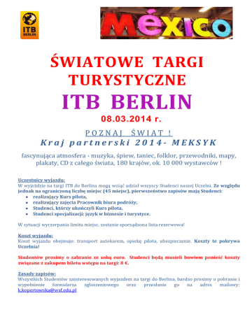 ŚWIATOWE TARGI TURYSTYCZNE ITB BERLIN 08.03.2014 r. POZNAJ ŚWIAT ! Kraj partnerski 2014- MEKSYK fascynująca atmosfera - muzyka, śpiew, taniec, folklor, przewodniki, mapy, plakaty, CD z całego świata, 180 krajów, ok. 10 000 wystawców ! Uczestnicy wyjazdu: W wyjeździe na targi ITB do Berlina mogą wziąć udział wszyscy Studenci naszej Uczelni. Ze względu jednak na ograniczoną liczbę miejsc (45 miejsc), pierwszeństwo zapisów mają Studenci: realizujący Kurs pilota, realizujący zajęcia Pracownik biura podróży, Studenci, którzy ukończyli Kurs pilota, Studenci specjalizacji: język w biznesie i turystyce. W sytuacji wyczerpania limitu miejsc, zostanie sporządzona lista rezerwowa! Koszt wyjazdu: Koszt wyjazdu obejmuje: transport autokarem, opiekę pilota, ubezpieczenie. Koszty te pokrywa Uczelnia! Studentów prosimy o zabranie ze sobą euro. Studenci będą musieli bowiem ponieść koszty związane z zakupem biletu wstępu na targi: 8 €. Zasady zapisów: Wszystkich Studentów zainteresowanych wyjazdem na targi do Berlina, bardzo prosimy o pobranie i wypełnienie formularza zgłoszeniowego oraz przesłanie go na adres mailowy: [email protected] Uwaga! Ze względu na fakt, iż koszty wyjazdu pokrywane są przez WSF rezygnacja z uczestnictwa w wyjeździe może nastąpić najpóźniej do 28.02.2014 roku. Program: 08.03. 2014 (sobota) godz. 03.00 - wyjazd autokarem, Wrocław ul. Petrusewicza - przejazd do Berlina, 10.00 - 18.00 - udział w targach, 18.30 - wyjazd do Polski (planowany przyjazd do Wrocławia 08.03.2014 ok. godz. 23:30 – 24.00) Zapraszamy do udziału!