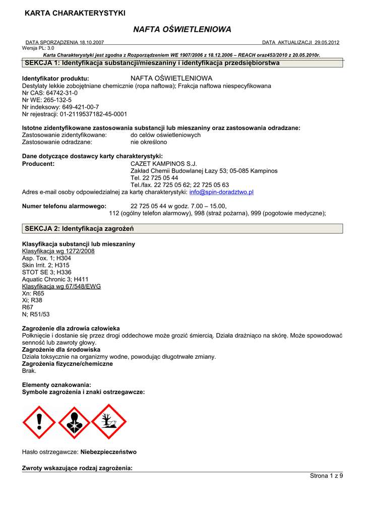 KARTA CHARAKTERYSTYKI NAFTA OŚWIETLENIOWA DATA SPORZĄDZENIA 18.10.2007 DATA AKTUALIZACJI 29.05.2012 Wersja PL: 3.0 Karta Charakterystyki jest zgodna z Rozporządzeniem WE 1907/2006 z 18.12.2006 – REACH oraz453/2010 z 20.05.2010r. SEKCJA 1: Identyfikacja substancji/mieszaniny i identyfikacja przedsiębiorstwa Identyfikator produktu: NAFTA OŚWIETLENIOWA Destylaty lekkie zobojętniane chemicznie (ropa naftowa); Frakcja naftowa niespecyfikowana Nr CAS: 64742-31-0 Nr WE: 265-132-5 Nr indeksowy: 649-421-00-7 Nr rejestracji: 01-2119537182-45-0001 Istotne zidentyfikowane zastosowania substancji lub mieszaniny oraz zastosowania odradzane: Zastosowanie zidentyfikowane: do celów oświetleniowych Zastosowanie odradzane: nie określono Dane dotyczące dostawcy karty charakterystyki: Producent: CAZET KAMPINOS S.J. Zakład Chemii Budowlanej Łazy 53; 05-085 Kampinos Tel. 22 725 05 44 Tel./fax. 22 725 05 62; 22 725 05 63 Adres e-mail osoby odpowiedzialnej za kartę charakterystyki: [email protected] Numer telefonu alarmowego: 22 725 05 44 w godz. 7.00 – 15.00, 112 (ogólny telefon alarmowy), 998 (straż pożarna), 999 (pogotowie medyczne); SEKCJA 2: Identyfikacja zagrożeń Klasyfikacja substancji lub mieszaniny Klasyfikacja wg 1272/2008 Asp. Tox. 1; H304 Skin Irrit. 2; H315 STOT SE 3; H336 Aquatic Chronic 3; H411 Klasyfikacja wg 67/548/EWG Xn: R65 Xi; R38 R67 N; R51/53 Zagrożenie dla zdrowia człowieka Połknięcie i dostanie się przez drogi oddechowe może grozić śmiercią. Działa drażniąco na skórę. Może spowodować senność lub zawroty głowy. Zagrożenie dla środowiska Działa toksycznie na organizmy wodne, powodując długotrwałe zmiany. Zagrożenia fizyczne/chemiczne Brak. Elementy oznakowania: Symbole zagrożenia i znaki ostrzegawcze: Hasło ostrzegawcze: Niebezpieczeństwo Zwroty wskazujące rodzaj zagrożenia: Strona 1 z 9 KARTA CHARAKTERYSTYKI NAFTA OŚWIETLENIOWA DATA SPORZĄDZENIA 18.10.2007 DATA AKTUALIZACJI 29.05.2012 Wersja PL: 3.0 Karta Charakterystyki jest zgodna z Rozporządzeniem WE 1907/2006 z 18.12.2006 – REACH oraz453/2010 z 20.05.2010r. H304 – połknięcie i dostanie się przez drogi oddechowe może grozić śmiercią. H315 – działa drażniąco na skórę H336 – może spowodować senność lub zawroty głowy. H411 – działa toksycznie na organizmy wodne, powodując długotrwałe zmiany. Zwroty określające warunki bezpiecznego stosowania: P102 – chronić przed dziećmi P280 – Stosować rękawice ochronne/odzież ochronną/ ochronę oczu/ochronę twarzy. P301+P310 – W PRZYPADKU POŁKNIĘCIA: Natychmiast skontaktować się z OŚRODKIEM ZATRUĆ lub lekarzem. P331 – NIE wywoływać wymiotów. P501 – Zawartość/pojemnik usuwać zgodnie z przepisami krajowymi. Inne zagrożenia: Brak innych zagrożeń. Brak informacji na temat spełnienia kryteriów PBT lub vPvB zgodnie z załącznikiem XIII rozporządzenia REACH. Odpowiednie badania nie były przeprowadzone. SEKCJA 3: Skład/informacja o składnikach Substancje: Identyfikator produktu Zawartość % Destylaty lekkie zobojętniane chemicznie (ropa naftowa); Frakcja naftowa niespecyfikowana Nr CAS: 64742-31-0 Nr WE: 265-132-5 Nr indeksowy: 649-421-00-7 Nr rejestracji: 01-211953718245-0001 Pełna treść zwrotów R i H w sekcji 16 Klasyfikacja wg 67/548/EWG Xn: R65 100 Xi; R38 R67 N; R51/53 Uwaga H Klasyfikacja CLP Kody zwrotów Klasa zagrożenia i wskazujących kody kategorii rodzaj zagrożenia Asp. Tox. 1 Skin Irrit.2 STOT SE 3 Aquatic Chronic 2 Uwaga H H304 H315 H336 H411 Mieszaniny: Nie dotyczy. SEKCJA 4: Środki pierwszej pomocy Opis środków pierwszej pomocy W przypadku kontaktu ze skórą: Zdjąć zanieczyszczoną odzież, umyć zabrudzoną skórę wodą z mydłem, spłukać dokładnie wodą, w przypadku pojawienia się podrażnienia, skontaktować się z lekarzem. W przypadku kontaktu z oczami: Przepłukać oczy przez kilkanaście minut (ok. 15) dużą ilością wody, trzymając powieki szeroko rozwarte. Unikać silnego strumienia, ze względu na niebezpieczeństwo uszkodzenia rogówki. W przypadku wystąpienia podrażnień natychmiast skontaktować się z lekarzem. Narażenie inhalacyjne: W razie zawrotów głowy lub nudności wyprowadzić poszkodowanego na świeże powietrze, w razie braku szybkiej poprawy natychmiast zasięgnąć porady lekarza. W przypadku połknięcia: Strona 2 z 9 KARTA CHARAKTERYSTYKI NAFTA OŚWIETLENIOWA DATA SPORZĄDZENIA 18.10.2007 DATA AKTUALIZACJI 29.05.2012 Wersja PL: 3.0 Karta Charakterystyki jest zgodna z Rozporządzeniem WE 1907/2006 z 18.12.2006 – REACH oraz453/2010 z 20.05.2010r. Nie wywoływać wymiotów, przepłukać usta, podać do wypicia wodę, można podać olej wazelinowy, nie podawać mleka, tłuszczów roślinnych i zwierzęcych, natychmiast skontaktować się z lekarzem. Najważniejsze ostre i opóźnione objawy oraz skutki narażenia: Może spowodować uszkodzenie płuc w przypadku połknięcia objawiającym się przykładowo oskrzelowym zapaleniem płuc. Długotrwałe lub częste narażenie może spowodować zaburzenia ze strony ośrodkowego układu nerwowego. W przypadku powtarzającego się narażenia może dojść do wysuszania, złuszczania oraz pękania skóry. Wskazania dotyczące wszelkiej natychmiastowej pomocy lekarskiej i szczególnego postępowania z poszkodowanym: Decyzję o sposobie postępowania podejmuje lekarz po ocenie stanu poszkodowanego. SEKCJA 5: Postępowanie w przypadku pożaru Środki gaśnicze: Odpowiednie środki gaśnicze: piana alkoholoodporna lub suche proszki gaśnicze, dwutlenek węgla (gaśnica śniegowa), piasek lub ziemia. Stosować metody gaśnicze odpowiednie do warunków otoczenia. Niewłaściwe środki gaśnicze: Silny strumień wody. Istnieje niebezpieczeństwo rozprzestrzeniania się palącej cieczy na powierzchni wody. W przypadku zbiorników możliwy wyrzut palącego się produktu z dużą siłą. Szczególne zagrożenia związane z substancją lub mieszaniną: Palna ciecz. Pary są cięższe od po