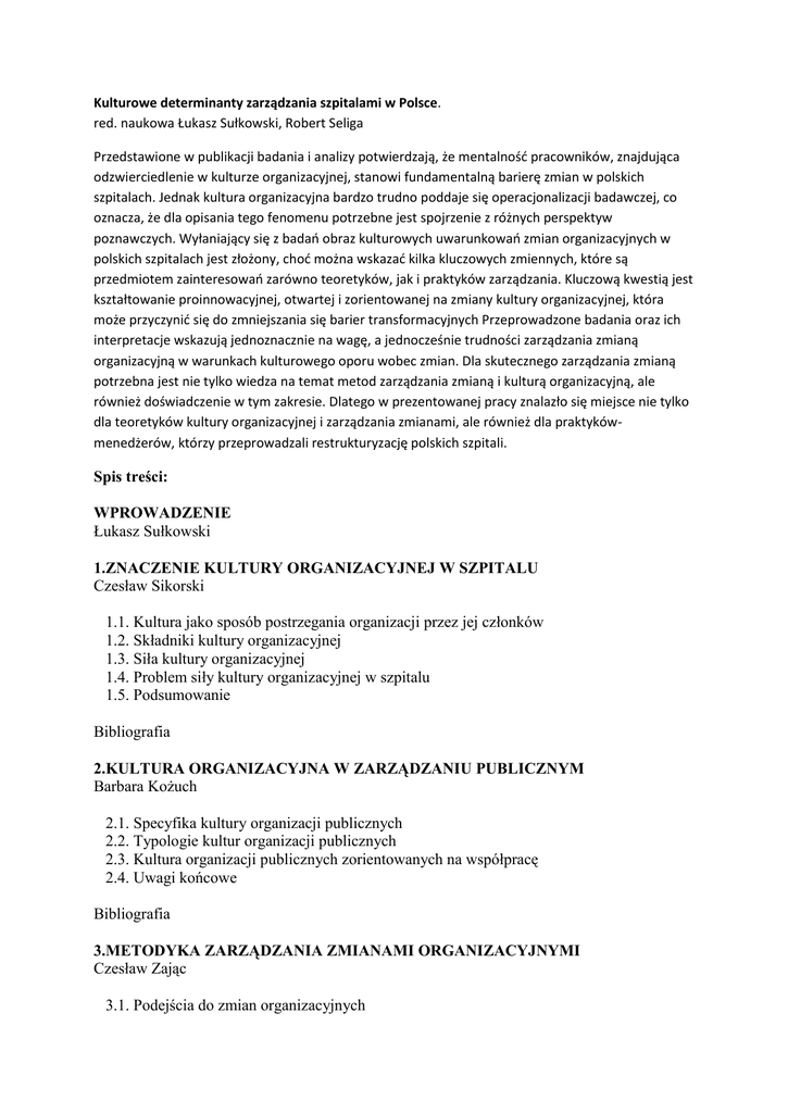 Kulturowe determinanty zarządzania szpitalami w Polsce. red. naukowa Łukasz Sułkowski, Robert Seliga Przedstawione w publikacji badania i analizy potwierdzają, że mentalność pracowników, znajdująca odzwierciedlenie w kulturze organizacyjnej, stanowi fundamentalną barierę zmian w polskich szpitalach. Jednak kultura organizacyjna bardzo trudno poddaje się operacjonalizacji badawczej, co oznacza, że dla opisania tego fenomenu potrzebne jest spojrzenie z różnych perspektyw poznawczych. Wyłaniający się z badań obraz kulturowych uwarunkowań zmian organizacyjnych w polskich szpitalach jest złożony, choć można wskazać kilka kluczowych zmiennych, które są przedmiotem zainteresowań zarówno teoretyków, jak i praktyków zarządzania. Kluczową kwestią jest kształtowanie proinnowacyjnej, otwartej i zorientowanej na zmiany kultury organizacyjnej, która może przyczynić się do zmniejszania się barier transformacyjnych Przeprowadzone badania oraz ich interpretacje wskazują jednoznacznie na wagę, a jednocześnie trudności zarządzania zmianą organizacyjną w warunkach kulturowego oporu wobec zmian. Dla skutecznego zarządzania zmianą potrzebna jest nie tylko wiedza na temat metod zarządzania zmianą i kulturą organizacyjną, ale również doświadczenie w tym zakresie. Dlatego w prezentowanej pracy znalazło się miejsce nie tylko dla teoretyków kultury organizacyjnej i zarządzania zmianami, ale również dla praktykówmenedżerów, którzy przeprowadzali restrukturyzację polskich szpitali. Spis treści: WPROWADZENIE Łukasz Sułkowski 1.ZNACZENIE KULTURY ORGANIZACYJNEJ W SZPITALU Czesław Sikorski 1.1. Kultura jako sposób postrzegania organizacji przez jej członków 1.2. Składniki kultury organizacyjnej 1.3. Siła kultury organizacyjnej 1.4. Problem siły kultury organizacyjnej w szpitalu 1.5. Podsumowanie Bibliografia 2.KULTURA ORGANIZACYJNA W ZARZĄDZANIU PUBLICZNYM Barbara Kożuch 2.1. Specyfika kultury organizacji publicznych 2.2. Typologie kultur organizacji publicznych 2.3. Kultura organizacji publicznych zorientowanych na współpracę 2.4. Uwagi końcowe Bibliografia 3.METODYKA ZARZĄDZANIA ZMIANAMI ORGANIZACYJNYMI Czesław Zając 3.1. Podejścia do zmian organizacyjnych 3.2. Organizacja procesu zarządzania zmianami organizacyjnymi 3.3. Zmiany a rozwój przedsiębiorstwa jako organizacji Bibliografia 4.KULTURA ORGANIZACYJNA W PROCESIE ZARZĄDZANIA ZMIANĄ Czesław Sikorski 4.1. Kulturowe uwarunkowania oporu przeciwko zmianom 4.1.1. Adaptacja kulturowa w procesie zmian 4.1.2. Psychologiczne determinanty stosunku do zmian 4.1.2.1. Umiejscowienie kontroli nad własnym działaniem 4.1.2.2. Stopień tolerancji niepewności 4.1.3. Kultury aktywne i pasywne 4.2. Sposoby pozyskiwania ludzi do akceptacji zmian 4.3. Kształtowanie kultury proinnowacyjnej 4.3.1. Cechy i uwarunkowania motywacji osiągnięć 4.3.2. Czynniki kulturotwórcze Bibliografia 5.KULTUROWE BARIERY ZMIAN W POLSKICH SZPITALACH. REZULTATY BADAŃ Łukasz Sułkowski, Robert Seliga, Andrzej Woźniak 5.1. Wstęp 5.2. Cele, hipotezy i metodyka badań własnych 5.3. Charakterystyka kulturowa polskich szpitali 5.4. Dualizm kultury i tożsamości organizacyjnej szpitali w Polsce 5.5. Kulturowe bariery przedsiębiorczości w szpitalach 5.6. Nieelastyczny system zarządzania zasobami ludzkimi 5.7. Wnioski Bibliografia 6.ROLA LIDERA W ZARZĄDZANIU ZMIANĄ W PUBLICZNYM PODMIOCIE DZIAŁALNOŚCI LECZNICZEJ Sabina Ostrowska, Katarzyna Burda-Świerz 6.1. Model lidera w publicznym podmiocie działalności leczniczej 6.1.1. Rola lidera zmiany 6.1.2. Zarządzanie publicznym podmiotem działalności leczniczej i zespołem w trakcie zmiany 6.2. Badanie kultury organizacyjnej w praktyce publicznego podmiotu leczniczego w kontekście wdrożenia zmiany 6.2.1 Badanie kultury organizacyjnej przez pryzmat zmiany w Okręgowym Szpitalu Kolejowym w Katowicach w świetle badań empirycznych 6.2.1.1. Identyfikacja profilów kultury w Okręgowym Szpitalu Kolejowym w Katowicach 6.3. Kultura organizacyjna jako czynnik zmiany w publicznym podmiocie leczniczym 6.4. Podsumowanie Bibliografia 7. KONTROLA W ZARZĄDZANIU ZMIANĄ Roman Andrzej Lewandowski 7.1. Podstawowe definicje i koncepcje kontroli 7.2. Zawody medyczne (medical professions) 7.3. Szpital jako podmiot kontroli 7.4. Kontrola zarządcza w szpitalach jako jednostkach sektora finansów publicznych 7.5. Metodyka badań 7.5.1. Studium przypadku ‒ kontrola zarządcza i zarządzanie zmianą w Wojewódzkim Szpitalu Rehabilitacyjnym dla Dzieci w Ameryce 7.6. Podsumowanie Bibliografia 8. MODELOWANIE KULTURY INNOWACJI W ZAKŁADACH OPIEKI ZDROWOTNEJ Janina Jończyk 8.1. Wprowadzenie 8.2. Specyfika kultury organizacyjnej w szpitalach 8.3. Pojęcie i kategorie innowacji w opiece zdrowotnej 8.4. Kultura innowacji w szpitalu . próba określenia modelu 8.5. Podsumowanie Bibliografia 9.MODEL INTERESARIUSZY W ZARZĄDZANIU ZMIANĄ W SZPITALACH Aldona Frączkiewicz-Wronka, Karolina Szymaniec 9.1. Wstęp 9.2. Otoczenie działania podmiotów leczniczych i znaczenie jego diagnozowania dla efektywnego wprowadzania zmiany w szpitalu 9.3. Interesariusze . rozwój koncepcji w odniesieniu do organizacji publicznych 9.4. Znaczenie interesariuszy dla procesu podejmowania decyzji 9.5. Identyfikacja kluczowych interesariuszy . omówienie wybranych wyników badań 9.6. Podsumowanie ‒ zarządzanie relacjami z interesariuszami Bibliografia