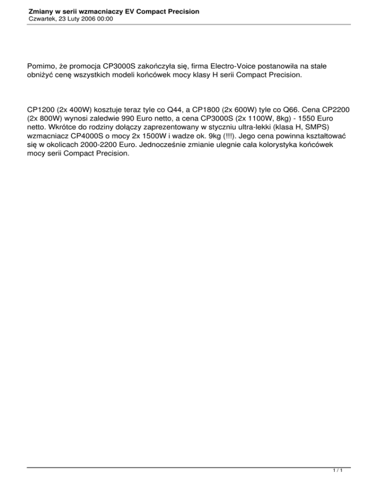 Zmiany w serii wzmacniaczy EV Compact Precision Czwartek, 23 Luty 2006 00:00 Pomimo, że promocja CP3000S zakończyła się, firma Electro-Voice postanowiła na stałe obniżyć cenę wszystkich modeli końcówek mocy klasy H serii Compact Precision. CP1200 (2x 400W) kosztuje teraz tyle co Q44, a CP1800 (2x 600W) tyle co Q66. Cena CP2200 (2x 800W) wynosi zaledwie 990 Euro netto, a cena CP3000S (2x 1100W, 8kg) - 1550 Euro netto. Wkrótce do rodziny dołączy zaprezentowany w styczniu ultra-lekki (klasa H, SMPS) wzmacniacz CP4000S o mocy 2x 1500W i wadze ok. 9kg (!!!). Jego cena powinna kształtować się w okolicach 2000-2200 Euro. Jednocześnie zmianie ulegnie cała kolorystyka końcówek mocy serii Compact Precision. 1/1
