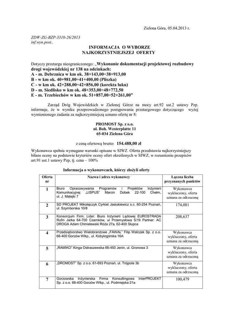 Zielona Góra, 05.04.2013 r. ZDW-ZG-BZP-3310-26/2013 inf.wyn.post.. INFORMACJA O WYBORZE NAJKORZYSTNIEJSZEJ OFERTY Dotyczy przetargu nieograniczonego: „Wykonanie dokumentacji projektowej rozbudowy drogi wojewódzkiej nr 138 na odcinkach: A - m. Debrznica w km ok. 38+143,00÷38+913,00 B - w km ok. 40+981,00÷41+400,00 (Pliszka) C - w km ok. 42+288,00÷42+856,00 (korekta łuku) D - m. Siedlisko w km ok. 48+353,00÷48+772,50 E - m. Trzebiechów w km ok. 51+857,00÷52+261,00” Zarząd Dróg Wojewódzkich w Zielonej Górze na mocy art.92 ust.2 ustawy Pzp. informuje, że w wyniku przeprowadzonego postępowania przetargowego dotyczącego wyżej wymienionego zadania za najkorzystniejszą uznano ofertę nr 8: PROMOST Sp. z o.o. ul. Boh. Westerplatte 11 65-034 Zielona Góra z ceną ofertową brutto: 154.488,00 zł Wykonawca spełnia wymagane warunki opisane w SIWZ. Oferta przedstawia najkorzystniejszy bilans oceny na podstawie kryteriów oceny ofert określonych w SIWZ, w rozumieniu przepisów art.91 ust.1 ustawy Pzp, tj. cena – 100% Informacja o wykonawcach, którzy złożyli oferty Oferta nr Nazwa i adres wykonawcy Łączna liczba przyznanych punktów 1 Biuro Opracowywania Programów i Projektów Inżynierii Komunikacyjnej „LISPUS” Marcin Dobek 22-100 Chełm, ul. J. Matejki 7 Wykonawca wykluczony, oferta uznana za odrzuconą 2 SD PROJEKT Mikołajczyk Cyrkiel Jasiukiewicz s.c. 60-254 Poznań, ul. Szymborska 10/8 174,081 3 Konsorcjum Firm: Lider: Biuro Inżynierii Lądowej EUROSTRADA Rufin Jarka 64-700 Czarnków, ul Przemysłowa 5/19 Partner: AC DROGA Adam Chmielewski Róża 27a, 62-400 Słupca 208,637 4 Przedsiębiorstwo Wielobranżowe „FAWAL” Filip Walczak Sp. z o.o. 66-400 Gorzów Wlkp., ul. Kobylogórska 16A Wykonawca wykluczony, oferta uznana za odrzuconą 5 „RAMIKO” Kinga Ostraszewska 66-450 Jenin, ul. Gronowa 3 Wykonawca wykluczony, oferta uznana za odrzuconą 6 „DROMOST” Sp. z o.o. 61-693 Poznań, ul. Trójpole 3b Wykonawca wykluczony, oferta uznana za odrzuconą 7 Gorzowska Inżynierska Firma Konsultingowa InterPROJEKT Sp. z o.o. 66-400 Gorzów Wlkp., ul. Podmiejska 21a 100,479 8 „PROMOST” Sp. z ul. Boh. Westerplatte 11 o. o. 65-034 Zielona Góra, 9 SMP Projektanci Szuba, Matysik, Pokorski Sp. j. 60-141 Poznań, ul. Promienista 87A/1 10 AUGMEN CONSULTING GROUP M. Kowalczyk Spółka Jawna 65-427 Zielona Góra, ul. Wrocławska 5A 11 APS Biuro Projektów ul. Działkowa 19 Budownictwa 65-767 Zielona 300,000 Wykonawca wykluczony, oferta uznana za odrzuconą 196,942 Góra, 111,672 Za udział w postępowaniu dziękujemy. Podpisano: Z-ca Dyrektora ds. Zarządzania Drogami i Mostami Grzegorz Szulc Zielona Góra, 05.04.2013 r. ZDW-ZG-BZP-3310-26/2013 inf.wyn.post.. INFORMACJA O WYBORZE NAJKORZYSTNIEJSZEJ OFERTY Dotyczy przetargu nieograniczonego: „Wykonanie dokumentacji projektowej rozbudowy drogi wojewódzkiej nr 138 na odcinkach: A - m. Debrznica w km ok. 38+143,00÷38+913,00 B - w km ok. 40+981,00÷41+400,00 (Pliszka) C - w km ok. 42+288,00÷42+856,00 (korekta łuku) D - m. Siedlisko w km ok. 48+353,00÷48+772,50 E - m. Trzebiechów w km ok. 51+857,00÷52+261,00” Zarząd Dróg Wojewódzkich w Zielonej Górze na mocy art.92 ust.2 ustawy Pzp. informuje, że w wyniku przeprowadzonego postępowania przetargowego dotyczącego wyżej wymienionego zadania za najkorzystniejszą uznano ofertę nr 8: PROMOST Sp. z o.o. ul. Boh. Westerplatte 11 65-034 Zielona Góra z ceną ofertową brutto: 154.488,00 zł Wykonawca spełnia wymagane warunki opisane w SIWZ. Oferta przedstawia najkorzystniejszy bilans oceny na podstawie kryteriów oceny ofert określonych w SIWZ, w rozumieniu przepisów art.91 ust.1 ustawy Pzp, tj. cena – 100% Informacja o wykonawcach, którzy złożyli oferty Oferta nr Nazwa i adres wykonawcy Łączna liczba przyznanych punktów 1 Biuro Opracowywania Programów i Projektów Inżynierii Komunikacyjnej „LISPUS” Marcin Dobek 22-100 Chełm, ul. J. Matejki 7 Wykonawca wykluczony, oferta uznana za odrzuconą 2 SD PROJEKT Mikołajczyk Cyrkiel Jasiukiewicz s.c. 60-254 Poznań, ul. Szymborska 10/8 174,081 3 Konsorcjum Firm: Lider: Biuro Inżynierii Lądowej EUROSTRADA Rufin Jarka 64-700 Czarnków, ul Przemysłowa 5/19 Partner: AC DROGA Adam Chmielewski Róża 27a, 62-400 Słupca 208,637 4 Przedsiębiorstwo Wielobranżowe „FAWAL” Filip Walczak Sp. z o.o. 66-400 Gorzów Wlkp., ul. Kobylogórska 16A Wykonawca wykluczony, oferta uznana za odrzuconą 5 „RAMIKO” Kinga Ostraszewska 66-450 Jenin, ul. Gronowa 3 Wykonawca wykluczony, oferta uznana za odrzuconą 6 „DROMOST” Sp. z o.o. 61-693 Poznań, ul. Trójpole 3b Wykonawca wykluczony, oferta uznana za odrzuconą 7 Gorzowska Inżynierska Firma Konsultingowa InterPROJEKT Sp. z o.o. 66-400 Gorzów Wlkp., ul. Podmiejska 21a 100,479 8 „PROMOST” Sp. z ul. Boh. Westerplatte 11 o. o. 65-034 Zielona Góra, 9 SMP Projektanci Szuba, Matysik, Pokorski Sp. j. 60-141 Poznań, ul. Promienista 87A/1 10 AUGMEN CONSULTING GROUP M. Kowalczyk Spółka Jawna 65-427 Zielona Góra, ul. Wrocławska 5A 11 APS Biuro Projektów ul. Działkowa 19 Budownictwa 65-767 Zielona 300,000 Wykonawca wykluczony, oferta uznana za odrzuconą 196,942 Góra, 111,672 Za udział w postępowaniu dziękujemy. Podpisano: Z-ca Dyrektora ds. Zarządzania Drogami i Mostami Grzegorz Szulc
