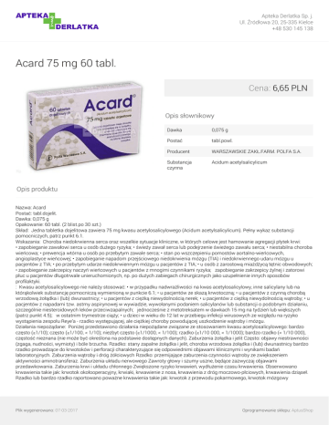 Dawkowanie: Podanie doustne. Tabletka dojelitowa produktu Acard ma otoczkę i nie rozpada się w żołądku, przez co zmniejsza się