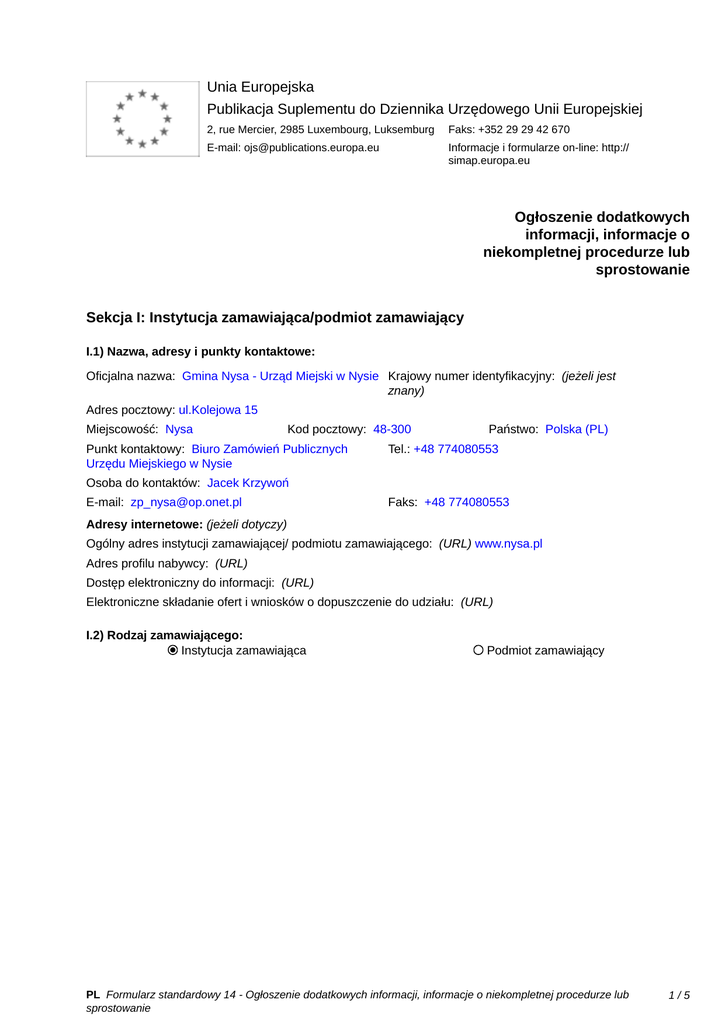 Unia Europejska Publikacja Suplementu do Dziennika Urzędowego Unii Europejskiej 2, rue Mercier, 2985 Luxembourg, Luksemburg Faks: +352 29 29 42 670 E-mail: [email protected] Informacje i formularze on-line: http:// simap.europa.eu Ogłoszenie dodatkowych informacji, informacje o niekompletnej procedurze lub sprostowanie Sekcja I: Instytucja zamawiająca/podmiot zamawiający I.1) Nazwa, adresy i punkty kontaktowe: Oficjalna nazwa: Gmina Nysa - Urząd Miejski w Nysie Krajowy numer identyfikacyjny: (jeżeli jest znany) _____ Adres pocztowy: ul.Kolejowa 15 Miejscowość: Nysa Kod pocztowy: 48-300 Punkt kontaktowy: Biuro Zamówień Publicznych Urzędu Miejskiego w Nysie Państwo: Polska (PL) Tel.: +48 774080553 Osoba do kontaktów: Jacek Krzywoń E-mail: [email protected] Faks: +48 774080553 Adresy internetowe: (jeżeli dotyczy) Ogólny adres instytucji zamawiającej/ podmiotu zamawiającego: (URL) www.nysa.pl Adres profilu nabywcy: (URL) _____ Dostęp elektroniczny do informacji: (URL) _____ Elektroniczne składanie ofert i wniosków o dopuszczenie do udziału: (URL) _____ I.2) Rodzaj zamawiającego: Instytucja zamawiająca Podmiot zamawiający PL Formularz standardowy 14 - Ogłoszenie dodatkowych informacji, informacje o niekompletnej procedurze lub sprostowanie 1/5 Sekcja II: Przedmiot zamówienia II.1.1) Nazwa nadana zamówieniu: ZAKUP ENERGII ELEKTRYCZNEJ II.1.2) Krótki opis zamówienia lub zakupu: (podano w pierwotnym ogłoszeniu) Przedmiotem niniejszego zamówienia jest Zakup energii elektrycznej do obiektów Zamawiającego oraz jednostek organizacyjnych wskazanych w załączniku nr 1 i 2 do SIWZ, zgodnie z przepisami Ustawy z dnia 10 kwietnia 1997r. Prawo energetyczne II.1.3) Wspólny Słownik Zamówień (CPV) Główny przedmiot Dodatkowe przedmioty Słownik główny 09000000 09300000 Słownik uzupełniający (jeżeli dotyczy) PL Formularz standardowy 14 - Ogłoszenie dodatkowych informacji, informacje o niekompletnej procedurze lub sprostowanie 2/5 Sekcja IV: Procedura IV.1)Rodzaj procedury (podano w pierwotnym ogłoszeniu) Otwarta Ograniczona Ograniczona przyspieszona Negocjacyjna Negocjacyjna przyspieszona Dialog konkurencyjny Negocjacyjna z uprzednim ogłoszeniem Negocjacyjna bez uprzedniego ogłoszenia Negocjacyjna z publikacją ogłoszenia o zamówieniu Negocjacyjna bez publikacji ogłoszenia o zamówieniu Udzielenie zamówienia bez uprzedniej publikacji ogłoszenia o zamówieniu w Dzienniku Urzędowym Unii Europejskiej IV.2)Informacje administracyjne IV.2.1)Numer referencyjny: (podano w pierwotnym ogłoszeniu) BZP.271.51.2013 IV.2.2)Dane referencyjne ogłoszenia w przypadku ogłoszeń przesłanych drogą elektroniczną: Pierwotne ogłoszenie przesłane przez eNotices TED eSender Login: ENOTICES_nysabzp Dane referencyjne ogłoszenia: 2013-138518 rok i numer dokumentu IV.2.3)Ogłoszenie, którego dotyczy niniejsza publikacja: Numer ogłoszenia w Dz.U.: 2013/S 200-345739 z dnia: 15/10/2013 (dd/mm/rrrr) IV.2.4)Data wysłania pierwotnego ogłoszenia: 11/10/2013 (dd/mm/rrrr) PL Formularz standardowy 14 - Ogłoszenie dodatkowych informacji, informacje o niekompletnej procedurze lub sprostowanie 3/5 Sekcja VI: Informacje uzupełniające VI.1) Ogłoszenie dotyczy: Procedury niepełnej Sprostowania Informacji dodatkowych VI.2) Informacje na temat niepełnej procedury udzielenia zamówienia: Postępowanie o udzielenie zamówienia zostało przerwane Postępowanie o udzielenie zamówienia uznano za nieskuteczne Zamówienia nie udzielono Zamówienie może być przedmiotem ponownej publikacji VI.3) Informacje do poprawienia lub dodania : VI.3.1) Zmiana oryginalnej informacji podanej przez instytucję zamawiającą Publikacja w witrynie TED niezgodna z oryginalną informacją, przekazaną przez instytucję zamawiającą Oba przypadki VI.3.2) W ogłoszeniu pierwotnym W odpowiedniej dokumentacji przetargowej (więcej informacji w odpowiedniej dokumentacji przetargowej) W obu przypadkach (więcej informacji w odpowiedniej dokumentacji przetargowej) VI.3.3) Tekst, który należy poprawić w pierwotnym ogłoszeniu Miejsce, w którym znajduje się Zamiast: zmieniany tekst: Część 2 zamówienia- pozostałe II.2.1) Całkowita wielkość lub zakres obiekty. Szacunkowe zapotrzebowanie energii elektrycznej w okresie od 01.01.2014 r. do 31.12.2015 r. wynosi 11 894 433,12 kWh. Powinno być: Część 2 zamówienia- pozostałe obiekty. Szacunkowe zapotrzebowanie energii elektrycznej w okresie od 01.01.2014 r. do 31.12.2015 r. wynosi 12.040.629,12 kWh. Miejsce, w którym znajduje się Zamiast: zmieniany tekst: Szacunkowe zapotrzebowanie Informacje o częściach zamówienia energii elektrycznej w okresie od 1.1.2014 r. do 31.12.2015 r. wynosi 11 894 433,12 kWh. Powinno być: Szacunkowe zapotrzebowanie energii elektrycznej w okresie od 01.01.2014 r. do 31.12.2015 r. wynosi 12.040.629,12 kWh. VI.3.4) Daty, które należy poprawić w pierwotnym ogłoszeniu Miejsce, w którym znajdują się Zamiast: zmieniane daty: Powinno być: VI.3.5) Adresy i punkty kontaktowe, które należy poprawić VI.3.6) Tekst, który należy dodać do pierwotnego ogłoszenia Miejsce, w którym należy dodać tekst: Tekst do dodania: VI.4) Inne dodatkowe informacje: _____ PL Formularz standardowy 14 - Ogłoszenie dodatkowych informacji, informacje o niekompletnej procedurze lub sprostowanie 4/5 VI.5) Data wysłania niniejszego ogłoszenia: 30/10/2013 (dd/mm/rrrr) - ID:2013-147358 PL Formularz standardowy 14 - Ogłoszenie dodatkowych informacji, informacje o niekompletnej procedurze lub sprostowanie 5/5