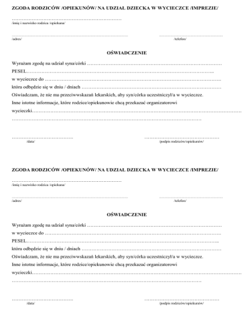 ZGODA RODZICÓW /OPIEKUNÓW/ NA UDZIAŁ DZIECKA W WYCIECZCE /IMPREZIE/ ………………………………………………………… /imię i nazwisko rodzica /opiekuna/ ………………………………………………………………………………… /adres/ …………………………………………… /telefon/ OŚWIADCZENIE Wyrażam zgodę na udział syna/córki ……………………………………………………………………… PESEL………………………………………………………………………………………………….. w wycieczce do ……………………………………………………………………………………………. która odbędzie się w dniu / dniach ………………………………………………………………………… Oświadczam, że nie ma przeciwwskazań lekarskich, aby syn/córka uczestniczył/a w wycieczce. Inne istotne informacje, które rodzice/opiekunowie chcą przekazać organizatorowi wycieczki……………………………………………………………………………………………………………… …………………………………………………………………………………………………… ………………………………. ……………………………………… /podpis rodziców/opiekunów/ /data/ ZGODA RODZICÓW /OPIEKUNÓW/ NA UDZIAŁ DZIECKA W WYCIECZCE /IMPREZIE/ ………………………………………………………… /imię i nazwisko rodzica /opiekuna/ ………………………………………………………………………………… /adres/ …………………………………………… /telefon/ OŚWIADCZENIE Wyrażam zgodę na udział syna/córki ……………………………………………………………………… w wycieczce do ……………………………………………………………………………………………. PESEL…………………………………………………………………………………………………….. która odbędzie się w dniu / dniach ………………………………………………………………………… Oświadczam, że nie ma przeciwwskazań lekarskich, aby syn/córka uczestniczył/a w wycieczce. Inne istotne informacje, które rodzice/opiekunowie chcą przekazać organizatorowi wycieczki……………………………………………………………………………………………………………… …………………………………………………………………………………………………… ………………………………. /data/ ……………………………………… /podpis rodziców/opiekunów/ ZGODA RODZICÓW /OPIEKUNÓW/ NA UDZIAŁ DZIECKA W WYJEŹDZIE NA KONKURS ………………………………………………………… /imię i nazwisko rodzica /opiekuna/ ………………………………………………………………………………… /adres/ …………………………………………… /telefon/ OŚWIADCZENIE Wyrażam zgodę na wyjazd syna/córki ……………………………………………………………………… do …………………………………………………………………………………………………………… PESEL………………………………………………………………………………………….. który odbędzie się w dniu ………………………… r. Oświadczam, że nie ma przeciwwskazań lekarskich, aby syn/córka uczestniczył/a w konkursie. Inne istotne informacje, które rodzice/opiekunowie chcą przekazać organizatorowi wyjazdu……………………………………………………………………………………………………………… …………………………………………………………………………………………………… ………………………………. ……………………………………… /podpis rodziców/opiekunów/ /data/ ZGODA RODZICÓW /OPIEKUNÓW/ NA UDZIAŁ DZIECKA W WYJEŹDZIE NA KONKURS ………………………………………………………… /imię i nazwisko rodzica /opiekuna/ ………………………………………………………………………………… /adres/ …………………………………………… /telefon/ OŚWIADCZENIE Wyrażam zgodę na wyjazd syna/córki ……………………………………………………………………… do …………………………………………………………………………………………………………… PESEL………………………………………………………………………………………….. który odbędzie się w dniu ………………………… r. Oświadczam, że nie ma przeciwwskazań lekarskich, aby syn/córka uczestniczył/a w konkursie. Inne istotne informacje, które rodzice/opiekunowie chcą przekazać organizatorowi wyjazdu……………………………………………………………………………………………………………… …………………………………………………………………………………………………… ………………………………. /data/ ……………………………………… /podpis rodziców/opiekunów/ ZGODA RODZICÓW /OPIEKUNÓW/ NA UDZIAŁ DZIECKA W WYJEŹDZIE NA BASEN ………………………………………………………… /imię i nazwisko rodzica /opiekuna/ ………………………………………………………………………………… /adres/ …………………………………………… /telefon/ OŚWIADCZENIE Wyrażam zgodę na wyjazd syna/córki ……………………………………………………………………… PESEL: ………………………………………………………………… do Wąbrzeźna