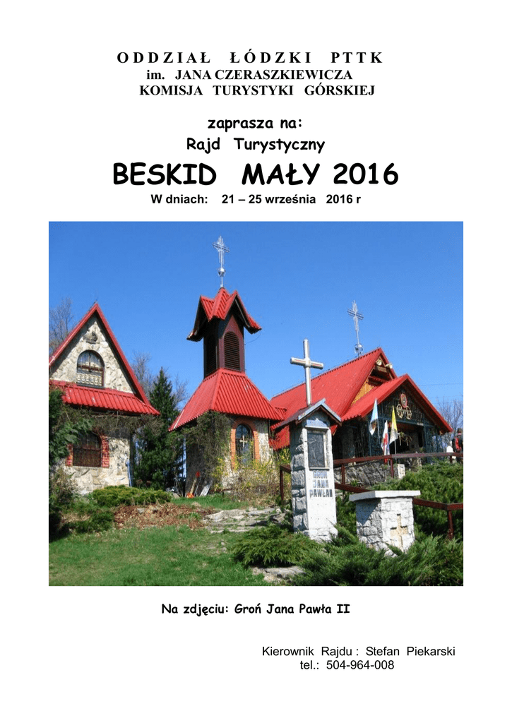 ODDZIAŁ ŁÓDZKI PTTK im. JANA CZERASZKIEWICZA KOMISJA TURYSTYKI GÓRSKIEJ zaprasza na: Rajd Turystyczny BESKID MAŁY 2016 W dniach: 21 – 25 września 2016 r Na zdjęciu: Groń Jana Pawła II Kierownik Rajdu : Stefan Piekarski tel.: 504-964-008 Rajd jest dostępny dla wszystkich miłujących góry i pragnących bliższego kontaktu z nimi poprzez pieszą wędrówkę. Trasa rajdu prowadzi malowniczymi szczytami i dolinami Beskidu Małego. WARUNKI UCZESTNICTWA W rajdzie uczestniczyć mogą pełnoletni turyści indywidualni, a niepełnoletni mogą być zgłaszani przez rodziców lub opiekunów uczestniczących w rajdzie. Każdy uczestnik musi posiadać plecak, odpowiednią odzież chroniącą od deszczu i zimna, mocne i wygodne, wodoodporne buty. Uczestnicy biorą udział w rajdzie na własną odpowiedzialność prawną i materialną. Organizatorzy nie ubezpieczają uczestników od następstw nieszczęśliwych wypadków. Wyjątek stanowią członkowie PTTK z opłaconymi na bieżąco składkami, którzy są objęci ubezpieczeniem NW Uczestnicy rajdu winni stosować się do zarządzeń porządkowych kierownictwa rajdu. Na trasie uczestnicy wędrują razem. Noclegi są zarezerwowane w Domkach „Cicha Dolina” w Międzybrodziu Bialskim przy ul. Kublinów 6. Na terenie obiektu jest kuchnia turystyczna z wyposażeniem. Miejsca noclegowe przydziela wyłącznie kierownik rajdu. W godzinach 22.00 - 6.00 obowiązuje cisza nocna. Za spowodowanie zagrożenia pożarowego, zniszczenie przyrody, zniszczenie obiektu noclegowego itp. uczestnicy będą pociągnięci do odpowiedzialności finansowej. Transport zostanie „dograny”, po ustaleniu listy uczestników imprezy – samochodami prywatnymi, lub busem. Rozliczenie transportu z kierowcami samochodów. ZGŁOSZENIE UCZESTNICTWA Zgłaszając swoje uczestnictwo w rajdzie należy koniecznie podać swoje imię, nazwisko, datę urodzenia, adres zamieszkania (potrzebne do zameldowania) a członkowie PTTK z aktualnie opłaconymi składkami – nr legitymacji PTTK. Zapisy poparte wniesieniem wpisowego na rajd przyjmowane są w Łódzkim Oddziale PTTK im. Jana Czeraszkiewicza, 90-301 Łódź, ul. Wigury 12a, I piętro pok. 105, tel. 42-63615-09 lub 42-636-87-64, od poniedziałku do piątku w godz. 10-17. Wpłaty wpisowego można również dokonać przelewem na konto bankowe: Spółdzielcza Grupa Bankowa; Bank Spółdzielczy w Radomsku; Oddział 5 w Łodzi Nr konta: 15 8980 0009 2019 0072 6027 0001 PTTK Oddział w Łodzi , ul. Wigury 12a podając cel wpłaty: rajd „Beskid Mały – 2016”, jednocześnie przesyłając do Oddziału pocztą elektroniczną na adres [email protected] dane potrzebne do sporządzenia listy uczestników 1. 2. 3. 4. WYSOKOŚĆ WPISOWEGO: Kadra, posiadacze Honorowych Odznak PTTK 190,00 zł Członkowie PTTK posiadający aktualnie opłacone składki 200,00 zł Młodzież szkolna i studencka 210,00 zł Pozostali 220,00 zł W przypadku nie zgłoszenia się drużyny lub uczestników na rajd wpisowe nie będzie zwracane. TERMINY ZAPISÓW Zgłoszenia przyjmowane będą w Biurze Zarządu Oddziału Łódzkiego PTTK w dniach 16 sierpnia - 12 wreśnia 2016 r. Podany termin może być skrócony w przypadku wcześniejszego uzyskania kompletu zgłoszeń. Ilość miejsc ograniczona (15). O przyjęciu decyduje kolejność zgłoszeń popartych wpłatą, przy czym pierwszeństwo mają członkowie PTTK . PRAWA I OBOWIĄZKI UCZESTNIKÓW : Kierownictwo w ramach wpisowego zapewnia : 1. 4 noclegi w „Cichej Dolinie” w Międzybrodziu Bialskim (pokoje 2-3 os.) 2. opiekę przodownicką na trasach 3. znaczek pamiątkowy (buton) 4. potwierdzenie zdobytych punktów na GOT UCZESTNICY ZOBOWIĄZANI SĄ DO : - ścisłego przestrzegania postanowień wynikających z „Karty Turysty” - zachowania przepisów ppoż. oraz ochrony przyrody - przestrzegania regulaminu rajdu DOJAZD do Międzybrodzia Bialskiego – 21 września w godz. 17:00 – 19:00 Zakończenie Rajdu w Międzybrodziu Żywieckim – 25 września ok. godz. 14:00 UWAGI KOŃCOWE : 1. zapis na rajd oznacza akceptacje postanowień regulaminu i wyraża gotowość podporządkowania się im 2. wyżywienie uczestnicy organizują we własnym zakresie. W obiekcie jest kuchnia z wyposażeniem udostępniona dla turystów 3. wszystkie dojazdy i przejazdy w trakcie trwania rajdu (w tym przejazd kolejką górsko – terenową) uczestnicy pokrywają we własnym zakresie. 4. Interpretacja niniejszego regulaminu należy do organizatorów rajdu. PROGRAM RAJDU 21 września 2016 r. - środa Dojazd do miejsca zakwaterowania w Międzybrodziu Bialskim 1 dzień - 22 września 2016 r. - czwartek Żarnówka Mała (zapora w Porąbce)(310m) – Zasolnica (553m) – Bujakowski Groń (749m) – Hrobacza Łąka (828m) – przeł. U Panienki (739m) – Groniczki (839m) – Gaiki (808m)(znaki czerwone) – Nowy Świat (660m)(znaki zielone) – Międzybrodzie Bialskie (znaki niebieskie)(5h30’) 2 dzień - 3 września 2016 r. - piątek Międzybrodzie Bialskie – Rogacz (899m) – Czupel (933m) (znaki czerwone) – Jaskinia Wietrzna Dziura – Magurka Wilkowicka (909m) (znaki niebieskie) – Piekło – Czulaki – Ponikiew – Międzybrodzie Bialskie (znaki żółte) (4h50’) 3 dzień - 4 września 2016 r. - sobota Przejazd do Krzeszowa Górnego, a stąd za znakami czerwonymi przez Palusową Górę (614m) – Harańczykową Górę (626m) – Jaworzynę (662m) – na Groń Jana Pawła II (890m) – dalej schronisko Pod Leskowcem – Leskowiec (918m) – Przełęcz Beskidek (799m) – Potrójna (847m) – Na Beskidzie (863m) – Smrekowica – Madohora (929m) – Smrekowica (znaki czerwone) – Czarna Góra (790m) – Gajka (578m) – Sikorówka PKS – Gronik (520m) (znaki zielone) – Krzeszów Górny (bez znaków) (6h) 4 dzień - 5 września 2016 r. - niedziela Międzybrodzie Żywieckie – Góra Żar (761m) (wjazd kolejką terenowo szynową) – Kiczera (831m) – Przełęcz Isepnicka (699m) – Przełęcz Przysłop Cisowy (807m) (