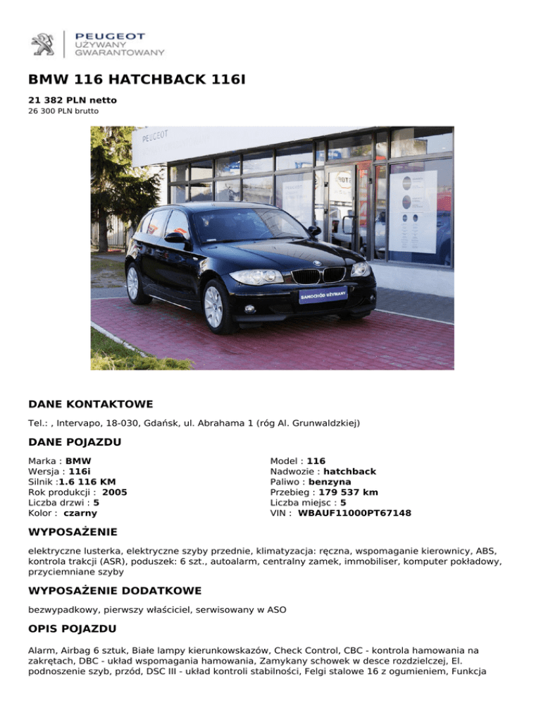 BMW 116 HATCHBACK 116I 21 382 PLN netto 26 300 PLN brutto DANE KONTAKTOWE Tel.: , Intervapo, 18-030, Gdańsk, ul. Abrahama 1 (róg Al. Grunwaldzkiej) DANE POJAZDU Marka : BMW Wersja : 116i Silnik :1.6 116 KM Rok produkcji : 2005 Liczba drzwi : 5 Kolor : czarny Model : 116 Nadwozie : hatchback Paliwo : benzyna Przebieg : 179 537 km Liczba miejsc : 5 VIN : WBAUF11000PT67148 WYPOSAŻENIE elektryczne lusterka, elektryczne szyby przednie, klimatyzacja: ręczna, wspomaganie kierownicy, ABS, kontrola trakcji (ASR), poduszek: 6 szt., autoalarm, centralny zamek, immobiliser, komputer pokładowy, przyciemniane szyby WYPOSAŻENIE DODATKOWE bezwypadkowy, pierwszy właściciel, serwisowany w ASO OPIS POJAZDU Alarm, Airbag 6 sztuk, Białe lampy kierunkowskazów, Check Control, CBC - kontrola hamowania na zakrętach, DBC - układ wspomagania hamowania, Zamykany schowek w desce rozdzielczej, El. podnoszenie szyb, przód, DSC III - układ kontroli stabilności, Felgi stalowe 16 z ogumieniem, Funkcja oświetlania drogi do domu, Immobilizer, Wycieraczka szyby tylnej, Zamek centralny, Wykończenie wnętrza 'Chrome matt', Wspomaganie układu kierowniczego, Szyby barwione, Trzecie światło stop, System kontroli trakcji, Popielniczka + zapalniczka, Napinacze pasów bezpieczeństwa, Lusterka zewnętrzne barwione -niebieskie, Lusterka boczne regulowane elektrycznie, Lusterka zewnętrzne asferyczne, Klakson - dźwięk dwutonowy, Komputer pokładowy, Kontrola ciśnienia w oponach, ABS, Klimatyzacja, Kierownica sportowa - skórzana, Lakier metalik, Radio BMW Business CD Pierwszy właściciel, Bezwypadkowy, Kupiony w ASO w Polsce, Pojazd regularnie serwisowany QR CODE DLA OGŁOSZENIA W SERWISIE UZYWANYGWARANTOWANY.PL Powered by TCPDF (www.tcpdf.org)