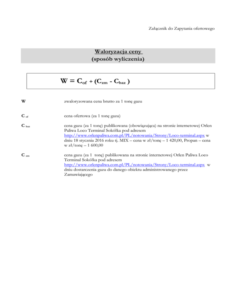 Załącznik do Zapytania ofertowego Waloryzacja ceny (sposób wyliczenia) W = Cof + (Czm - Cbaz ) W zwaloryzowana cena brutto za 1 tonę gazu C of cena ofertowa (za 1 tonę gazu) C baz cena gazu (za 1 tonę) publikowana (obowiązująca) na stronie internetowej Orlen Paliwa Loco Terminal Sokółka pod adresem http://www.orlenpaliwa.com.pl/PL/notowania/Strony/Loco-terminal.aspx w dniu 18 stycznia 2016 roku tj. MIX – cena w zł/tonę – 1 420,00, Propan – cena w zł/tonę – 1 600,00 C zm cena gazu (za 1 tonę) publikowana na stronie internetowej Orlen Paliwa Loco Terminal Sokółka pod adresem http://www.orlenpaliwa.com.pl/PL/notowania/Strony/Loco-terminal.aspx w dniu dostarczenia gazu do danego obiektu administrowanego przez Zamawiającego
