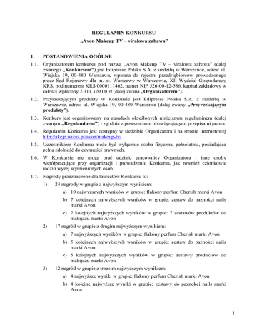 REGULAMIN KONKURSU „Avon Makeup TV – viralowa zabawa” 1. POSTANOWIENIA OGÓLNE 1.1. Organizatorem konkursu pod nazwą „Avon Makeup TV – viralowa zabawa” (dalej zwanego „Konkursem”) jest Edipresse Polska S.A. z siedzibą w Warszawie, adres: ul. Wiejska 19, 00-480 Warszawa, wpisana do rejestru przedsiębiorców prowadzonego przez Sąd Rejonowy dla m. st. Warszawy w Warszawie, XII Wydział Gospodarczy KRS, pod numerem KRS 0000111462, numer NIP 526-00-12-586, kapitał zakładowy w całości wpłacony 2.311.320,00 zł (dalej zwana „Organizatorem”). 1.2. Przyrzekającym produkty w Konkursie jest Edipresse Polska S.A. z siedzibą w Warszawie, adres: ul. Wiejska 19, 00-480 Warszawa (dalej zwany „Przyrzekającym produkty”). 1.3. Konkurs jest organizowany na zasadach określonych niniejszym regulaminem (dalej zwanym „Regulaminem”) i zgodnie z powszechnie obowiązującymi przepisami prawa. 1.4. Regulamin Konkursu jest dostępny w siedzibie Organizatora i na stronie internetowej http://akcje.wizaz.pl/avon/makeup-tv/ 1.5. Uczestnikiem Konkursu może być wyłącznie osoba fizyczna, pełnoletnia, posiadająca pełną zdolność do czynności prawnych. 1.6. W Konkursie nie mogą brać udziału pracownicy Organizatora i inne osoby współpracujące przy organizacji i prowadzeniu Konkursu, jak również członkowie rodzin wyżej wymienionych osób. 1.7. Nagrody przeznaczone dla laureatów Konkursu to: 1) 24 nagrody w grupie z najwyższym wynikiem: a) 10 najwyższych wyników w grupie: flakony perfum Cherish marki Avon b) 7 kolejnych najwyższych wyników w grupie: zestaw do paznokci nails marki Avon c) 7 kolejnych najwyższych wyników w grupie: 7 zestawów produktów do makijażu marki Avon 2) 17 nagród w grupie z drugim najwyższym wynikiem: a) 7 najwyższych wyników w grupie: flakony perfum Cherish marki Avon b) 5 kolejnych najwyższych wyników w grupie: zestaw do paznokci nails marki Avon c) 5 kolejnych najwyższych wyników w grupie: zestawy produktów do makijażu marki Avon 3) 12 nagród w grupie z trzecim najwyższym wynikiem: a) 4 najwyższe wyniki w grupie: flakony perfum Cherish marki Avon b) 4 kolejne najwyższe wyniki w grupie: zestawy do paznokci nails marki Avon 1 c) 4 kolejne najwyższe wyniki w grupie: zestawy produktów do makijażu marki Avon 4) 9 nagród w grupie z czwartym najwyższym wynikiem: a) 3 najwyższe wyniki w grupie: flakony perfum Cherish marki Avon b) 3 najwyższe wyniki w grupie: zestawy do paznokci nails marki Avon c) 3 najwyższe wyniki w grupie: zestawy produktów do makijażu marki Avon 5) 3 nagrody w grupie z piątym najwyższym wynikiem: a) 1 najwyższy wynik w grupie – flakon perfum Cherish marki Avon b) 1 najwyższy wynik w grupie – zestaw do paznokci nails marki Avon c) 1 najwyższy wynik w grupie - zestaw produktów do makijażu marki Avon 1.8. Organizator powoła trzyosobową komisję (zwaną dalej „Komisją”), w skład której wejdzie trzech przedstawicieli Organizatora. Komisja zobowiązana będzie do pełnienia nadzoru nad przestrzeganiem postanowień Regulaminu przez uczestników i podejmowania innych czynności, wskazanych w Regulaminie. W razie braku porozumienia wszystkich członków Komisji, decyzje Komisji zapadają większością głosów. 2. ZAŁOŻENIA KONURSU 2.1. Konkurs będzie przeprowadzony na stronach serwisu internetowego http://akcje.wizaz.pl/avon/makeup-tv/ Ogłoszenie o Konkursie ukaże się w dniu 30.06.2016 na stronie internetowej http://akcje.wizaz.pl/avon/makeup-tv/ 2.2. Konkurs będzie trwał w dniach od 30.06.2016 do 13.07.2016 r. 2.3 Wyniki Konkursu i lista Laureatów zostaną ogłoszone na stronie internetowej http://akcje.wizaz.pl/avon/makeup-tv/ w terminie nie później niż do dnia 20.07.2016 r. 3. ZASADY PROWADZENIA KONKUSU 3.1. W celu wzięcia udziału w Konkursie uczestnik powinien: 1) posiadać swoje konto w serwisie wizaz.pl 2) zalogować się na swoim koncie w serwisie wizaz.pl 3) wybrać ulubiony styl makijażu zaprezentowany w formie wideo 4) wpisać dane teleadresowe niezbędne do wysyłki nagród 5) zaakceptować treść Regulaminu 2 6) zamieścić w swoim podpisie na forum wizaz.pl lub na innych stronach internetowych poza wizaz.pl baner bądź link konkursowy oraz zebrać jak największą ilość kwalifikowanych kliknięć 3.2. Kliknięcia kwalifikowane to takie, które oprogramowanie rozpoznaje jako kliknięcia nowych osób; kliknięciem kwalifikowanym jest tylko takie, które nastąpiło gdziekolwiek na stronach internetowych www. Uwaga! Klikanie za pomocą komunikatorów, maili jak też odświeżanie ekranu głosowania nie są zdarzeniami, które system zakwalifikuje. Aby system zakwalifikował zdarzenie: a) Należy przejść na stronę konkursową za pomocą banera, za pomocą kliknięcia w baner, b) Tylko jedno kliknięcie w banner z danego IP dziennie powoduje dodanie punktu 3.3. Laureatami Konkursu w liczbie 65 zostaną osoby, które w dniu 20.07.2016 spełnią warunki opisane w punkcie 3.4. Ranking laureatów będzie dostępny on-line pod adresem: http://akcje.wizaz.pl/avon/makeup-tv/ 3.4. Jedna osoba może wziąć udział w Konkursie jeden raz. 3.5. Przystąpienie do Konkursu, zgodnie z postanowieniami niniejszego Regulaminu jest równoznaczne ze złożeniem przez uczestnika oświadczenia w przedmiocie akceptacji niniejszego Regulaminu. 3.6. Organizator zastrzega sobie prawo do korekcji wyników w przypadku uzasadnionych prób oszustwa. Manipulowanie wynikami konkursu rozumiane jako oszukiwanie programu kwalifikującego kliknięcia będzie karane usunięciem uczestnika z konkursu bez ostrzeżenia. Odpowiedzi na pytanie otwarte nie spełniające wymogów Regulaminu będą wykluczane z Konkursu przez Organizatora. 3.7. Organizator oświadcza, że dane osobowe uczestnika w zakresie: imię i nazwisko, adres email, numer telefonu komórkowego i adres zamieszkania, będą przetwarzane przez Organizatora w celu realizacji umowy przystąpienia do Konkursu i jego prawidłowego 
