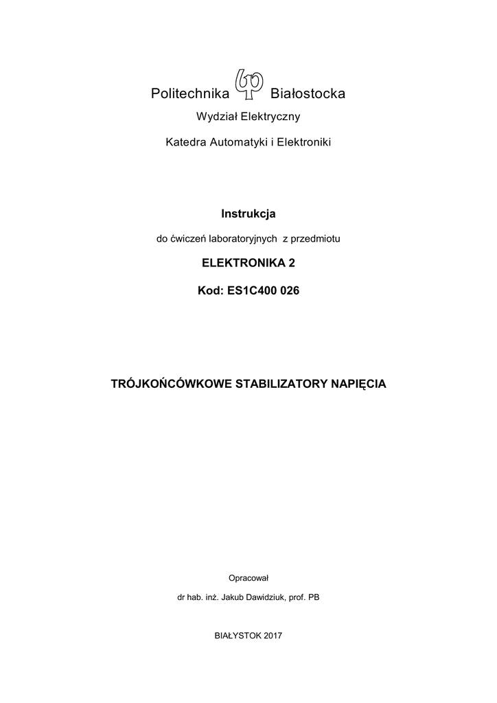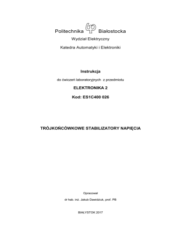 Politechnika Białostocka Wydział Elektryczny Katedra Automatyki i Elektroniki Instrukcja do ćwiczeń laboratoryjnych z przedmiotu ELEKTRONIKA 2 Kod: ES1C400 026 TRÓJKOŃCÓWKOWE STABILIZATORY NAPIĘCIA Opracował dr hab. inż. Jakub Dawidziuk, prof. PB BIAŁYSTOK 2017 Program szczegółowy laboratorium 1. Wprowadzenie – przepisy BHP, regulamin laboratorium, zapoznanie studentów ze stanowiskami laboratoryjnymi i aparaturą pomiarową. (2 godz.) 2. 3. 4. 5. 6. 7. 8. 9. 10. 11. 12. 13. 14. 15. Badanie diod i tranzystorów. (2 godz.) Optoizolacja cyfrowa. (2 godz.) Układ różnicowy. (2 godz.) Tranzystory jako układy dwustanowe. (2 godz.) Zastosowania wzmacniaczy operacyjnych w układach liniowych. (2 godz.) Trójkońcówkowe stabilizatory napięcia. (2 godz.) Zastosowania wzmacniaczy operacyjnych w układach nieliniowych. (2 godz.) Stabilizator impulsowy. (2 godz.) Podstawowe bramki logiczne. (2 godz.) Układy formowania impulsów. (2 godz.) Przetworniki cyfrowo – analogowe i analogowo – cyfrowe. (2 godz.) Układy uzależnień czasowych. (2 godz.) Zastosowania wybranych układów scalonych. (2 godz. ) Zaliczenie. Odrabianie zaległości. (2 godz.) Literatura podstawowa 1. 2. 3. 4. 5. 6. 7. 8. 9. Tietze U., Schenk Ch. Układy półprzewodnikowe. WNT, 2009. Horowitz P., Hill W. Sztuka elektroniki, cz. I i II. WKiŁ, 2006. Stepowicz W., Elementy półprzewodnikowe i układy scalone. Gdańsk1999. Filipkowski A. Układy elektroniczne analogowe i cyfrowe. WNT, 2007. Nosal Z., Baranowski J. Układy elektroniczne cz.I - Układy analogowe liniowe. WNT, 2003. Antoszkiewicz K., Z.Nosal Z., Zbiór zadań z układów elektronicznych liniowych. WNT, 1998. Górecki P., Wzmacniacze operacyjne. Wydaw. BTC, 2002. Platt Ch., Elektronika. Od praktyki do teorii (ebook). 2012. Barlik R., Nowak M., Energoelektronika. Elementy, podzespoły, układy. WPW, Warszawa, 2014. Literatura specjalistyczna oraz piśmiennictwo pomocnicze podane są w instrukcjach do ćwiczeń laboratoryjnych. 2 Wydział Elektryczny INSTRUKCJA STANOWISKOWA BHP Katedra Automatyki i Elektroniki dotyczy zasad użytkowania stanowiska do ćwiczeń laboratoryjnych z zakresu elektroniki. Dotyczy zasad użytkowania następujących urządzeń: Lp. 1. 2. 3. Nazwa urządzenia Oscyloskop cyfrowy Tektronix Generator funkcyjny Zasilacz stabilizowany Oznaczenie Aby uniknąć obrażeń, porażenia prądem elektrycznym lub uszkodzenia użytkowanych urządzeń, zaleca się uważne przeczytanie i przestrzeganie poniższych uwag eksploatacyjnych z zakresu bezpieczeństwa pracy. Użytkowanie urządzenia lub stanowiska powinno być zgodne z jego instrukcją obsługi oraz odrębnymi instrukcjami obsługi elementów składowych, jeżeli takie występują. Wszelkie czynności serwisowe (naprawy, regulacje, wymiany bezpieczników, itp.) powinny być wykonywane jedynie przez odpowiednio wykwalifikowane osoby. Przed przystąpieniem do pracy na stanowisku należy: Zapoznać się z instrukcją obsługi wykorzystywanych urządzeń. Zapewnić poprawne uziemienie przyrządu, poprzez połączenie przewodu ochronnego kabla sieciowego do sprawnego gniazdka sieciowego z kołkiem uziemiającym. Używać właściwego kabla sieciowego zaprojektowanego dla danego urządzenia, spełniającego odpowiednie normy krajowe. Przed wykonaniem jakichkolwiek połączeń wyjść i wejść urządzenia należy upewnić się, czy urządzenie jest prawidłowo uziemione. Zapewnić wymagane chłodzenie przyrządu poprzez prawidłowy obieg powietrza chłodzącego przyrząd. Aby uniknąć ryzyka pożaru lub porażenia prądem, należy zwracać uwagę na wszelkie ostrzeżenia na obudowie przyrządu oraz nie przekraczać podanych w instrukcji i na obudowie maksymalnych dopuszczalnych wartości napięcia i prądu w gniazdach urządzenia. Podczas pracy na stanowisku laboratoryjnym należy: Zachować ład i porządek. Przyrządy powinny być tak ustawione, aby nie mogły spaść. Wykonywać połączenia tak, aby nie zagrażały użytkownikom stanowiska. Połączenia wykonywać możliwie najkrótszymi przewodami, unikać połączeń przewodami zwisającymi. Nie należy podłączać lub odłączać sond lub przewodów pomiarowych, gdy one lub punkt podłączenia są pod napięciem. Nie pracować ze zdjętymi elementami obudowy lub zdemontowanymi panelami. Nie dotykać metalowych elementów obwodu (gniazd, styków, podzespołów, nieizolowanych przewodów mogących znaleźć się pod napięciem, itp.), gdy włączone jest zasilanie urządzenia. Jeżeli zachodzi podejrzenie uszkodzenia urządzenia lub jego nieprawidłowej pracy, należy wyłączyć zasilanie i fakt ten zgłosić osobie prowadzącej zajęcia. Przed przystąpieniem do 3 dalszej pracy urządzenie takie powinno być sprawdzone przez odpowiednio wykwalifikowaną osobę. Nie używać przyrządu w miejscach o dużej wilgotności, w atmosferze zawierającej gazy wybuchowe i agresywne korozyjnie. Dbać, aby powierzchnia przyrządu była zawsze czysta i sucha. Po skończeniu pracy na stanowisku należy: Wyłączyć urządzenia zasilane energią elektryczną. Uporządkować stanowisko. Czynności zabronione: Używanie urządzeń niezgodnie z ich przeznaczeniem i instrukcją obsługi. Łączenie elektrycznych obwodów pomiarowych znajdujących się pod napięciem. Samowolne otwieranie obudów i naprawianie urządzeń zasilanych energią elektryczną. Pierwsza pomoc: W przypadku porażenia prądem elektrycznym należy uwolnić osobę porażoną spod działania prądu elektrycznego przez natychmiastowe wyłączenie napięcia za pomocą przycisku bezpieczeństwa na tablicy zasilającej. Udzielić pomocy przedlekarskiej osobom poszkodowanym. Przy nieszczęśliwych wypadkach należy bezzwłocznie wezwać Pogotowie Ratunkowe (tel. 999, kom. 112). W przypadku pożaru: Odłączyć zasilanie urządzeń, rozpocząć ewakuację ludzi z zagrożonego obszaru. Gasić urządzenia dostępnymi środkami ochrony p.poż., a w koniecznym przypadku wezwać Straż