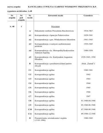 nazwa zespołu: KANCELARIA CYWILNA I GABINET WOJSKOWY PREZYDENTA R.P. sygnatura archiwalna: A.48 Nr zespołu Nr pod zespołu A. 48 1 Nr teczki Zawartość teczki Czasokres Prezydent A Dokumenty osobiste Prezydenta Raczkiewicza 1918-1967 A1 Korespondencja z Ignacym Paderewskim 1939-1941 A2 Korespondencja z gen. Władysławem Sikorskim 1941-1943 A3 Korespondencja z ważnymi osobistościami polskimi 1939-1945 A4 Korespondencja z ks. Metropolitą Krakowskim Adamem Sapiehą 1940-1950 A5 Korespondencja z ks. Kardynałem Augustem Hlondem 1939-1945; 1950 B Korespondencja z przedstawicielami państw obcych (brak „Zamek”) C1 Korespondencja ogólna 1940-1941 C2 Korespondencja ogólna 1942 C3 Korespondencja ogólna 1943 C4 Korespondencja ogólna 1944 C5 Korespondencja ogólna 1945 C6 Korespondencja ogólna 1946 C7 Korespondencja ogólna 1947 C8 Korespondencja ogólna 01.1948-04.1948 C9 Korespondencja ogólna 05.1948-06.1948 C10 Korespondencja ogólna 07.1948-08.1948 C11 Korespondencja ogólna 09.1948-12.1948 D Przemówienia, oświadczenia i orędzia (15.01.1996) 1940-1945 nazwa zespołu: KANCELARIA CYWILNA I GABINET WOJSKOWY PREZYDENTA R.P. sygnatura archiwalna: A.48 Zawartość teczki Nr zespołu Nr pod zespołu Nr teczki A.48 1 E1 Sprawa następstwa prezydentów RP 1940 E2 Sprawa następstwa prezydentów RP 1941 E3 Sprawa następstwa prezydentów RP 1942 E4 Sprawa następstwa prezydentów RP 1944 E5 Sprawa następstwa prezydentów RP 1947 E6 Sprawa następstwa prezydentów RP 1951 E7 Sprawa następstwa prezydentów RP 1953 E8 Sprawa następstwa prezydentów RP 1954 E9 Sprawa następstwa prezydentów RP 1959 E10 Sprawa następstwa prezydentów RP 1966 E11 Sprawa następstwa prezydentów RP 1971-1972 Generał Bolesław Wieniawa-Długoszewski 1939-1961 F Czasokres H1 Zgon Prezydenta Ignacego Mościckiego (brak „Zamek”) H2 Zgon Generała Władysława Sikorskiego 1943 H3 Zgon Prezydenta Władysława Raczkiewicza (brak „Zamek”) 1947 I Objęcie stanowiska Prezydenta RP przez Augusta Zaleskiego (brak „Zamek”) J Dekrety Prezydenta RP (brak „Zamek”) K1 Odznaczenia teczka ogólna L1 Protokół dyplomatyczny – ratyfikacje głów państw obcych 1941-1944 nazwa zespołu: KANCELARIA CYWILNA I GABINET WOJSKOWY PREZYDENTA R.P. sygnatura archiwalna: A.48 Nr zespołu Nr pod zespołu Nr teczki Zawartość teczki Czasokres A.48 1 L2 Protokół dyplomatyczny – potwierdzenie odbioru listów uwierzytelniających Prezydenta Władysława Raczkiewicza 1940 L3 Protokół dyplomatyczny – potwierdzenie odbioru listów uwierzytelniających dyplomatów polskich 1943-1944 L4 Listy uwierzytelniające dyplomatów akredytowanych przy Rządzie RP 1941-1944 L5 Odwołania dyplomatów akredytowanych przy Rządzie RP 1940-1943 L6 Odwołania dyplomatów RP akredytowanych przy rządach obcych 1942-1944 L7 Protokół dyplomatyczny - różne 1937-1944 Ł Protokóły posiedzeń Rady Gabinetowej (brak „Zamek”) M Protokóły posiedzeń Rady Obrony Państwa (brak „Zamek”) N Przesilenie państwowe 09.1939 O Przesilenie rządowe 07.1940 P Przesilenie rządowe 11.1944 R Przesilenie rządowe 07.1947 R1 Przesilenie rządowe 1948 R2 Przesilenie rządowe 02.1949 S Sprawozdanie dr. Alfonsa Kuca o ewakuacji mienia i akt Kancelarii Cywilnej we wrześniu 1939 (brak „Zamek”) T Sprawy personalne Kancelarii Cywilnej (brak „Zamek”) U Sprawy kresowe Kancelarii Cywilnej (brak „Zamek”) W Sprawa nadania VM gen. Tadeuszowi BórKomorowskiemu 1944 nazwa zespołu: KANCELARIA CYWILNA I GABINET WOJSKOWY PREZYDENTA R.P. sygnatura archiwalna: A.48 Nr zespołu Nr pod zespołu A.48 2 Nr teczki Zawartość teczki Czasokres Premier i Rząd A1 Korespondencja polityczna i ogólna 1940 A2 Korespondencja polityczna i ogólna 1941 A3 Korespondencja polityczna i ogólna 1942 A4 Korespondencja polityczna i ogólna 1943 A5 Korespondencja polityczna i ogólna 1943-1948 B Przemówienia i exposes Premiera 1943-1947 C1 Dokumenty dotyczące podpisania umowy polsko-sowieckiej i kryzysu w Rządzie RP 1941 C2 Kopie dokumentów dotyczących podpisania umowy polsko-sowieckiej 1941 C3 Sprawa podpisania umowy polsko-sowieckiej, teczka min. A. Zaleskiego 1941 C4 Pierwsza podróż Mikołajczyka do Moskwy C5 Druga podróż Mikołajczyka do Moskwy C6 Stosunki polsko-sowieckie – ogólne 1941-1945 C7 Stosunki polsko-sowieckie – protesty 1943 C8 Stosunki polsko-sowieckie – zbiór dokumentów 1939-1943 (brak „Zamek”) C9 Stosunki polsko-sowieckie – zbiór dokumentów 1943-1946 (brak „Zamek”) D Korespondencja Prezydenta RP z członkami b. Rządu RP 09.1939 E Dekret o powołaniu Komisji z Związku z Wynikami Kampanii Wrześniowej 1939 07.1944-08.1944 10.1944 (brak „Zamek”) nazwa zespołu: KANCELARIA CYWILNA I GABINET WOJSKOWY PREZYDENTA R.P. sygnatura archiwalna: A.48 Zawartość teczki Nr zespołu Nr pod zespołu Nr teczki Czasokres A.48 2 F Stosunki polsko-czechosłowackie G Delegat Rządu RP na terenie Belgii i Holandii p. Konrad Krupski H Protokóły posiedzeń Rady Ministrów (patrz PRM.K.102) 1939-1946 I Konferencja Paryska 29.07.1946 Naczelny Wódz, MSW, MON 3 A Korespondencja ogólna 1940-1947 B Meldunki z podróży i inspekcji 1943-1944 C Notatki prasowe 1943-1944 D Przemówienia 1943-1945 E Meldunki i raporty polityczne z zagranicy 1943-1945 F Wyroki sądowe F1 Sprawa S. Mikicińskiego i mjr. J. Żychona (wyrok) G Korespondencja z gen. Sosnkowskim H Korespondencja z gen. Andersem I Organizacja Naczelnych Władz Wojskowych (brak „Zamek”) Patrz A.48.Z.VIII/6 (brak „Zamek”) J1 PKPR 1945-1946 J2 PKPR 1946-1947 K Sprawa Katynia (brak „Zamek”) L1 Sprawa likwidacji PSZ 1947 L2 PKPR 1946 nazwa zespołu: KANCELARIA CYWILNA I GABINET WOJSKOWY PREZYDENTA R.P. sygnatura archiwalna: A.48 Nr zespołu Nr pod zespołu Nr teczki A.48 3 M Zawartość teczki Czasokres Sprawozdania Ministerstwa Obrony Narodowej Kraj 4 A1 Sprawy ogólno polityczne 1940-1941 A2 Sprawy ogólno polityczne 1942 A3 Sprawy ogólno polityczne 1943-1947 A4 Sprawy o