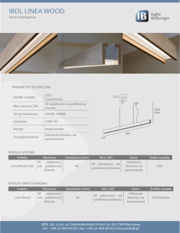 IBDL LINEA WOOD Karta katalogowa PARAMETRY TECHNICZNE Źródło światła: Moc oprawy [W]: LED, Świetlówka W zależności od preferencji klienta Temp. barwowa: 3000K, 4000K Zasilanie: 230V-AC Rozsył: Bezpośredni Dostępne kolory: Odcienie drewna, na zamówienie WERSJA LEDOWA Indeks Line Wood LED Wymiary Szerokość [mm] Moc [W] W zależności W zależności od od preferencji 45 preferencji klienta klienta kolor Odcienie drewna, na zamówienie Żódło światła LED WERSJA ŚWIETLÓWKOWA Indeks Line Wood Wymiary W zależności od preferencji klienta Szerokość [mm] Moc [W] 45 W zależności od preferencji klienta kolor Odcienie drewna, na zamówienie IBDL Sp. z o.o., ul. Dominikańska 9 bud. 5c, 02-738 Warszawa tel: +48 22 464 84 63, fax: +48 22 464 84 63 | [email protected] Żródło światła Świetlówka