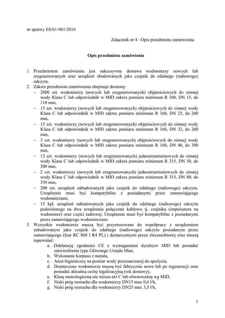 nr sprawy ES/61-961/2016 Załącznik nr 4 –Opis przedmiotu zamówienia Opis przedmiotu zamówienia 1. Przedmiotem zamówienia jest sukcesywna dostawa wodomierzy nowych lub zregenerowanych oraz urządzeń zbudowanych jako czujnik do zdalnego (radiowego) odczytu. 2. Zakres przedmiotu zamówienia obejmuje dostawę: − 2800 szt. wodomierzy (nowych lub zregenerowanych) objętościowych do zimnej wody Klasa C lub odpowiednik w MID zakres pomiaru minimum R 160, DN 15, do 110 mm, − 15 szt. wodomierzy (nowych lub zregenerowanych) objętościowych do zimnej wody Klasa C lub odpowiednik w MID zakres pomiaru minimum R 160, DN 25, do 260 mm, − 15 szt. wodomierzy (nowych lub zregenerowanych) objętościowych do zimnej wody Klasa C lub odpowiednik w MID zakres pomiaru minimum R 160, DN 32, do 260 mm, − 3 szt. wodomierzy (nowych lub zregenerowanych) objętościowych do zimnej wody Klasa C lub odpowiednik w MID zakres pomiaru minimum R 160, DN 40, do 300 mm, − 13 szt. wodomierzy (nowych lub zregenerowanych) jednostrumieniowych do zimnej wody Klasa C lub odpowiednik w MID zakres pomiaru minimum R 315, DN 50, do 300 mm, − 2 szt. wodomierzy (nowych lub zregenerowanych) jednostrumieniowych do zimnej wody Klasa C lub odpowiednik w MID zakres pomiaru minimum R 315, DN 80, do 350 mm, − 200 szt. urządzeń zabudowanych jako czujnik do zdalnego (radiowego) odczytu. Urządzenie musi być kompatybilne z posiadanymi przez zamawiającego wodomierzami, − 15 kpl. urządzeń zabudowanych jako czujnik do zdalnego (radiowego) odczytu podzielonego na dwa urządzenia połączone kablowo tj. czujnika (impulsatora na wodomierz) oraz części radiowej. Urządzenie musi być kompatybilne z posiadanymi przez zamawiającego wodomierzami. 3. Wszystkie wodomierze muszą być przystosowane do współpracy z urządzeniem zabudowanym jako czujnik do zdalnego (radiowego) odczytu posiadanym przez zamawiającego (Izar RC 868 I R4 PL) i dostarczonymi przez zleceniobiorcę oraz muszą zapewniać: a. Deklarację zgodności CE z wymaganiami dyrektyw MID lub posiadać zatwierdzenie typu Głównego Urzędu Miar, b. Wykonanie korpusu z metalu, c. Atest higieniczny na pomiar wody przeznaczonej do spożycia, d. Dostarczone wodomierze muszą być fabrycznie nowe lub po regeneracji oraz posiadać aktualną cechę legalizacyjną (rok dostawy), e. Klasę metrologiczną nie niższa niż C lub równoważną wg MID, f. Niski próg rozruchu dla wodomierzy DN15 max 0,6 l/h, g. Niski próg rozruchu dla wodomierzy DN25 max 3,5 l/h, 1 h. i. j. k. l. m. n. Niski próg rozruchu dla wodomierzy DN32 max 3,5 l/h, Niski próg rozruchu dla wodomierzy DN40 max 3,5 l/h, Niski próg rozruchu dla wodomierzy DN50 max 16 l/h, Niski próg rozruchu dla wodomierzy DN65 max 26 l/h, Niski próg rozruchu dla wodomierzy DN80 max 26 l/h, Niski próg rozruchu dla wodomierzy DN100 max 42 l/h, Umieszczenie numeru fabrycznego i cechy legalizacyjnej trwale na tarczy liczydła lub obudowie, o. Hermetycznie zamknięte liczydło, odporne na zaparowania, p. Zdejmowalne obrotowe flansze wodomierzy od DN 50 do DN 100, q. Zespół liczydła musi posiadać możliwość obrotu o minimum 355O oraz blokadę pełnego obrotu, r. Magnetyczną transmisję z oddzieleniem liczydła od części hydraulicznej, s. Możliwość montażu we wszystkich pozycjach dla wodomierzy DN 15 z zachowaniem współczynnika R 160, t. Konstrukcję umożliwiającą montaż w sieci bez konieczności stosowania prostych odcinków przed i za wodomierzem, u. Kody kreskowe z numerem wodomierza w formie naklejki, v. Zabezpieczenie przed ściskaniem wodomierza, w. Niezmienna pracę w warunkach 100% wilgotności otoczenia, x. Maksymalne ciśnienie robocze 16 bar, y. Minimum 36 miesiące gwarancji. Ponadto każdy wodomierz winien posiadać: kartę gwarancyjną. Każdy typoszereg wodomierzy winien posiadać Dokumentację Techniczno Ruchową, zatwierdzenie Głównego Urzędu Miar oraz kartę katalogową. Ww. dokumenty (wraz ze wzorem karty gwarancyjnej) należy dołączyć do oferty. 4. Wszystkie urządzenia zabudowane jako czujnik do zdalnego (radiowego) odczytu muszą być fabrycznie nowe, kompatybilne z posiadanymi przez zamawiającego wodomierzami oraz systemem radiowego odczytu obecnie użytkowanym przez Zamawiającego oraz zapewniać: a. Bezpośredni montaż i demontaż na wodomierzu bez naruszania cech legalizacyjnych, b. Szczelność obudowy w klasie IP68, możliwość pracy w warunkach 100% wilgotności otoczenia, c. Transmisję radiową w paśmie częstotliwości 868 MHz, d. Jednokierunkowy radiowy system komunikacji pomiędzy urządzeniem zabudowanym jako czujnik do zdalnego (radiowego) odczytu a urządzeniem odczytującym, e. Zdalne przekazywanie informacji o aktualnym stanie wodomierza oraz co najmniej jednym stanie wodomierza ustalonym na dany dzień (np. ostatni, kalendarzowy dzień miesiąca) wraz z datą, godzinę z minutami odczytu, f. Nieprzerwaną pracę baterii zasilającej, co najmniej 10 lat z zabezpieczeniem przed możliwością jej nieuprawnionego demontażu. W razie wyczerpania się baterii przed upływem tego czasu, Wykonawca w ramach gwarancji dostarczy nowy moduł radiowy, g. Minimum 24 miesięcy gwarancji, h. Możliwość przeprogramowania urządzenia w przypadku zmiany wodomierza, i. Możliwość pracy w temperaturach od -15°C do 50°C j. Rejestracja i przekazywanie radiowo informacji o: − Pozostałym czasie działania baterii zasilającej, 2 − Mechanicznym naruszeniu (demontaż) urządzenia, − Próbie zakłócenia pracy wodomierza i urządzenia zewnętrznym polem magnetycznym, − Przepływie wstecznym, wycieku względem wcześniej ustalonych parametrów, − Zatrzymaniu wodomierza względem wcześniej ustalonych parametrów, Ponadto urządzenie zabudowane jako czujnik do zdalnego (radiowego) odczytu winien posiadać: Certyfikat CE, kartę gwarancyjną. 5. Regeneracja wodomierza polega na wytrawieniu metalowego korpusu wodomierza oraz zamontowanie fabrycznie nowych elementów
