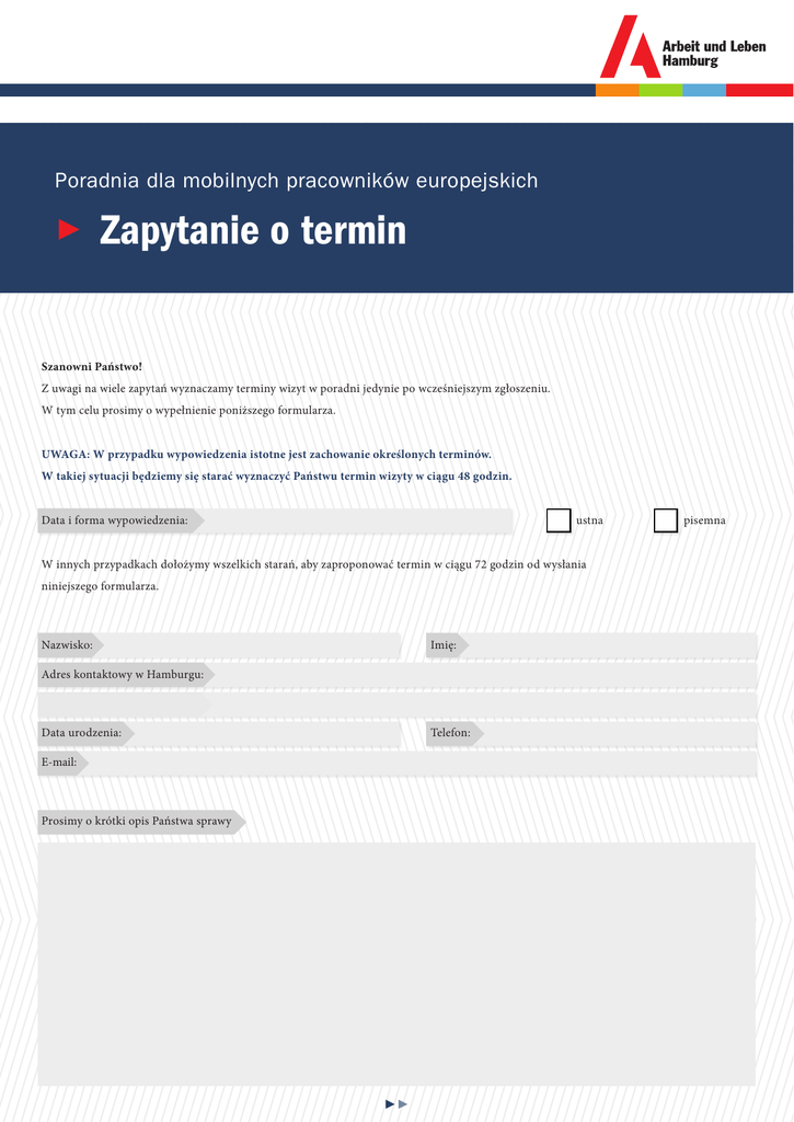 Poradnia dla mobilnych pracowników europejskich 3 Zapytanie o termin Szanowni Państwo! Z uwagi na wiele zapytań wyznaczamy terminy wizyt w poradni jedynie po wcześniejszym zgłoszeniu. W tym celu prosimy o wypełnienie poniższego formularza. UWAGA: W przypadku wypowiedzenia istotne jest zachowanie określonych terminów. W takiej sytuacji będziemy się starać wyznaczyć Państwu termin wizyty w ciągu 48 godzin. Data i forma wypowiedzenia: ustna W innych przypadkach dołożymy wszelkich starań, aby zaproponować termin w ciągu 72 godzin od wysłania niniejszego formularza. Nazwisko: Imię: Adres kontaktowy w Hamburgu: Data urodzenia: Telefon: E-mail: Prosimy o krótki opis Państwa sprawy 33 pisemna Zapytanie o termin 2/2 Prosimy o dodatkowe zaznaczenie tematów, które wymagają omówienia podczas wizyty w poradni: A. Stosunek pracy B. Samodzielna działalność/działalność gospodarcza Chciałbym/-ałabym uzyskać ogólne informacje na temat pracy w Niemczech (umowa o pracę, działalność gospodarcza, praca w niepełnym wymiarze godzin (tzw. minijob), ubezpieczenia społeczne, podatki) Rejestracja działalności gospodarczej (rejestracja w wydziale gospodarczym urzędu miasta i urzędzie skarbowym) Wypowiedzenie Nie otrzymałem/-łam należnego wynagrodzenia Problemy z dokumentacją firmową (potwierdzenie zlecenia, umowa o dzieło, faktury) Mam pytania dotyczące mojej umowy o pracę Nie zapłacono mojej faktury Mam pytania dotyczące mojego wynagrodzenia i płacy minimalnej Problemy z podatkiem Praca w systemie akordowym Ubezpieczenie od następstw nieszczęśliwych wypadów i wypadek podczas pracy Problemy z numerem podatkowym Ubezpieczenie zdrowotne Mam pytania dotyczące zasiłku dla bezrobotnych I Ubezpieczenie emerytalno-rentowe Nie mam żadnych przerw i czasu wyznaczonego na odpoczynek Dodatek do pensji, uzyskiwany z Jobcenter, wyrównujący do poziomu minimum socjalnego Pracuję więcej niż osiem godzin dziennie Inne – prosimy opisać na pierwszej stronie Chciał(-a)bym wyjaśnić kwestię moich roszczeń urlopowych Nie otrzymałem/-łam ekwiwalentu za urlop wypoczynkowy Pracodawca nie przekazał mi dokumentacji związanej z moją pracą (umowa o pracę, rozliczenie wynagrodzenia) Pracodawca nie zgłosił mnie do ubezpieczenia społecznego Mam problemy związane z urzędem skarbowym / z podatkami Mam problemy związane z ubezpieczeniem zdrowotnym Mam problemy związane z płatnym zwolnieniem chorobowym Miałem/-łam wypadek przy pracy Mam pytania dotyczące ochrony macierzyństwa (zapewnienie pracy i ochrona przed zwolnieniem w czasie ciąży) Potrzebuję pomocy w postępowaniu sądowym przeciwko pracodawcy Inne – prosimy opisać na pierwszej stronie Wyślij formularz do poradni dla mobilnych pracowników europejskich 33