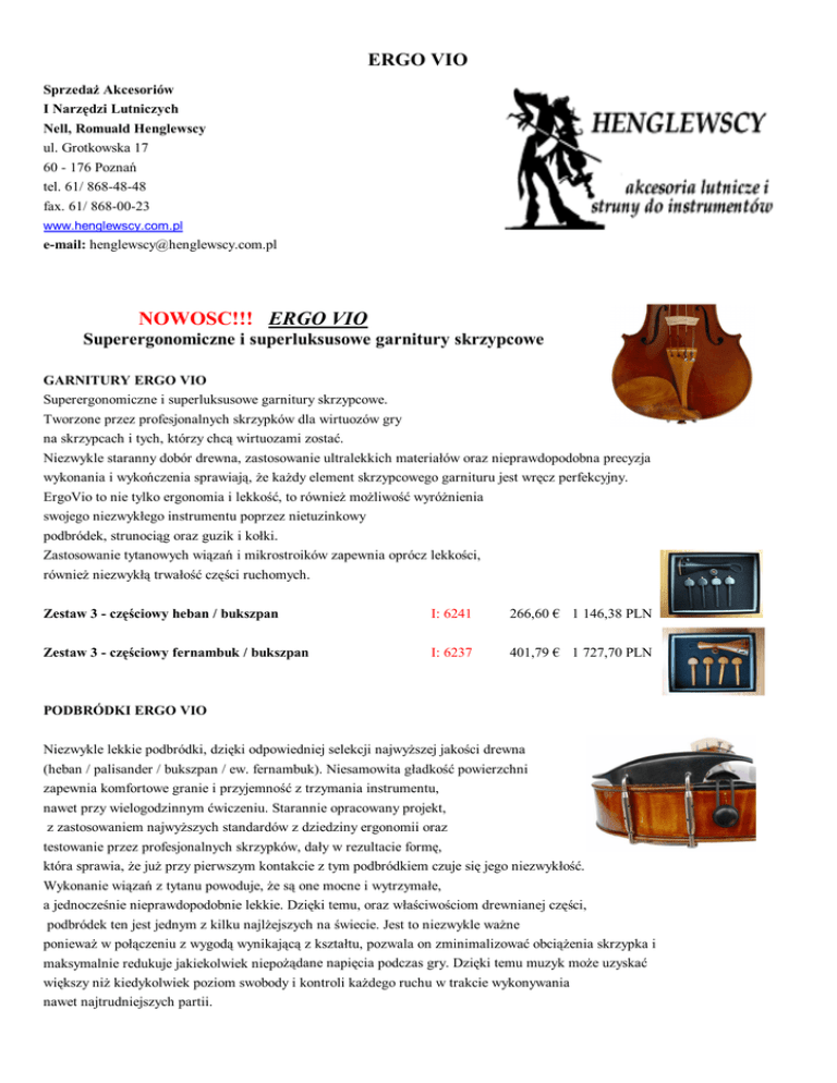 ERGO VIO Sprzedaż Akcesoriów I Narzędzi Lutniczych Nell, Romuald Henglewscy ul. Grotkowska 17 60 - 176 Poznań tel. 61/ 868-48-48 fax. 61/ 868-00-23 www.henglewscy.com.pl e-mail: [email protected] NOWOŚĆ!!! ERGO VIO Superergonomiczne i superluksusowe garnitury skrzypcowe GARNITURY ERGO VIO Superergonomiczne i superluksusowe garnitury skrzypcowe. Tworzone przez profesjonalnych skrzypków dla wirtuozów gry na skrzypcach i tych, którzy chcą wirtuozami zostać. Niezwykle staranny dobór drewna, zastosowanie ultralekkich materiałów oraz nieprawdopodobna precyzja wykonania i wykończenia sprawiają, że każdy element skrzypcowego garnituru jest wręcz perfekcyjny. ErgoVio to nie tylko ergonomia i lekkość, to również możliwość wyróżnienia swojego niezwykłego instrumentu poprzez nietuzinkowy podbródek, strunociąg oraz guzik i kołki. Zastosowanie tytanowych wiązań i mikrostroików zapewnia oprócz lekkości, również niezwykłą trwałość części ruchomych. Zestaw 3 - częściowy heban / bukszpan I: 6241 266,60 € 1 146,38 PLN Zestaw 3 - częściowy fernambuk / bukszpan I: 6237 401,79 € 1 727,70 PLN PODBRÓDKI ERGO VIO Niezwykle lekkie podbródki, dzięki odpowiedniej selekcji najwyższej jakości drewna (heban / palisander / bukszpan / ew. fernambuk). Niesamowita gładkość powierzchni zapewnia komfortowe granie i przyjemność z trzymania instrumentu, nawet przy wielogodzinnym ćwiczeniu. Starannie opracowany projekt, z zastosowaniem najwyższych standardów z dziedziny ergonomii oraz testowanie przez profesjonalnych skrzypków, dały w rezultacie formę, która sprawia, że już przy pierwszym kontakcie z tym podbródkiem czuje się jego niezwykłość. Wykonanie wiązań z tytanu powoduje, że są one mocne i wytrzymałe, a jednocześnie nieprawdopodobnie lekkie. Dzięki temu, oraz właściwościom drewnianej części, podbródek ten jest jednym z kilku najlżejszych na świecie. Jest to niezwykle ważne ponieważ w połączeniu z wygodą wynikającą z kształtu, pozwala on zminimalizować obciążenia skrzypka i maksymalnie redukuje jakiekolwiek niepożądane napięcia podczas gry. Dzięki temu muzyk może uzyskać większy niż kiedykolwiek poziom swobody i kontroli każdego ruchu w trakcie wykonywania nawet najtrudniejszych partii. ERGO VIO Podbródek skrzypcowy Heifetz - palisander I: 6236p 193,00 € 829,90 PLN Dokładny montaż na dolnym klocku ( pienku ), lekki 35 - 42g Minimalna powierzchnia na wiązanie. Do wyboru wiązanie w wersji tytan standard polerowany lub wiązanie typu Hill tytanowe ( patent producenta ), długość wiązania 28mm, powierzchnia podbródka wersja : szlifowana super delikatna, olejowana i polerowana, specjalny korek. Altówka waga 40 - 47g, wiązanie standard 36mm, na życzenie klienta 32 i 40mm Podbródek skrzypcowy Auer - heban I: 6262 193,00 € 829,90 PLN Podbródek skrzypcowy Auer - palisander I: 6262p 193,00 € Umieszcza się na lewo od strunociąga, waga 32 - 37g. Altówka waga 37 - 43g, wiązanie 36mm standard, na życzenie klienta 32 - 40mm 829,90 PLN PODBRÓDKI ERGO VIO - z zastosowanie wiązań typu Hill Zastosowanie wiązań typu Hill pozwala na zredukowanie do minimum ilość metalu zakładanego na instrument. To skutkuje jeszcze mniejszą wagą skrzypiec, ale przede wszystkim pozwala uwolnić najwięcej naturalnych drgań instrumentu. Dzięki temu skrzypce, niczym nieskrępowane, ukażą pełnię swego pięknego brzmienia. Podbródek skrzypcowy Heifetz wiązanie Hill - heban I: 6261 260,00 € 1 118,00 PLN Podbródek skrzypcowy Heifetz wiązanie Hill - palisander I: 6261p 260,00 € 1 118,00 PLN STRUNOCIĄGI SKRZYPCOWE ERGO VIO Niezwykle lekki i mocny strunociąg dzięki starannej selekcji drewna spośród najlepszych fernambuku). kawałków hebanu / palisandru / bukszpanu. Tytanowy, niewielki mikrostroik, który prawie nic nie waży, praktycznie pozwala uzyskać brzmienie takie jakby go nie było. Jednocześnie jest to bardzo wytrzymały mikrostroik, o większym niż standardowy skoku gwintu, co pozwala na szybkie dostrojenie instrumentu przy mniejszej niż zwykle ilości obrotów śrubki. Strunociąg ten jest wykonany niezwykle starannie, co przejawia się w jego nieprawdopodobnej gładkości uzyskanej dzięki długiemu polerowaniu. Tytanowe mikrostroiki ważą : 0,9g skrzypce, 1,0g altówka, 3,7g wiolonczela Wykonane są z antyalergicznego tytanu 2 stopnia. Zalety dla brzmienia : wbudowane mikrostroiki skracają nie rezonującą cześć struny, między podstawkiem a strunociągiem. Kąt zawieszenia strun na podstawku pozostaje niezmieniony. Dzięki powiększonemu otworowi w strunociągu, kąt struny od podstawka do strunociągu jest znikomy. Strunociągi mogą mieć 1,2 i 4 mikrostroiki w przypadku skrzypiec, altówka 1 lub 4, wiolonczela waga 50g, dostępne tylko z 4 mikrostroikami. Strunociąg skrzypcowy Hill bukszpan / heban 1 mikrostroik I: 6247 177,99 € 765,36 PLN Strunociąg skrzypcowy bukszpan / heban - 1 mikrostroik I: 6248 177,99 € 765,36 PLN ERGO VIO FOLGA HI - TECH ERGO VIO Folgi typu HI - TECH, zapewniają niezwykłą wytrzymałość przy nieprawdopodobnie małej wadze. Są one wykonane z zaawansowanych technologicznie materiałów, które zostały zastosowane dopiero po przetestowaniu przez profesjonalnych skrzypków. Folga skrzypcowa / altówkowa HI - TECH SPECYFIKACJA : długość około 220mm średnica 1,5mm obciążenie około 122kg naciąg strun około 30 - 31kg I: 6259 4,80 € 20,64 PLN Folga wiolonczelowa HI - TECH SPECYFIKACJA : długość około 450mm średnica 2,0mm obciążenie około 250kg naciąg strun około 60kg I: 6260 7,20 € 30,96 PLN