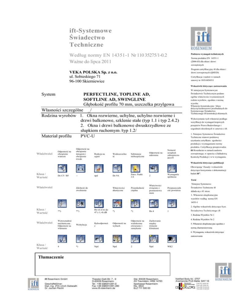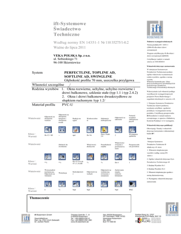 ift-Systemowe Świadectwo Techniczne Podstawa wymagań technicznych Według normy EN 14351-1 Nr 110 35275/1-0.2 Ważne do lipca 2011 Norma produktu EN 14351-1 (2006-03) dla okien i drzwi zewnętrznych Program certyfikacyjny ift dla okien i drzwi zewnętrznych (QM320) VEKA POLSKA Sp. z o.o. ul. Sobieskiego 71 96-100 Skierniewice Certyfikacja i nadzór w ramach umowy nr 181S 6034311 Wskazówki dotyczące zastosowania System PERFECTLINE, TOPLINE AD, SOFTLINE AD, SWINGLINE Głębokość profilu 70 mm, uszczelka przylgowa Własności szczególne _/ Rodzina wyrobów 1. Okna rozwierne, uchylne, uchylno rozwierne i drzwi balkonowe, szklenie stałe (typ 1.1 i typ 2.4.2) 2. Okna i drzwi balkonowe dwuskrzydłowe ze słupkiem ruchomym /typ 1.2/ Materiał profilu PVC-U W niniejszym Systemowym Świadectwie Technicznym podano ogólne właściwości wymienionych rodzin wyrobów, zgodnie z normą wyrobu. Własności konstrukcyjne / klasy dotyczą każdorazowo przebadanych do Systemowego Świadectwa Technicznego ift konstrukcji okiennych. Wykorzystanie tych własności podlega weryfikacji do wymagań krajowych przepisów Prawa Budowlanego i uzgodnień określonych w umowie z ift. 1. Niniejsze Systemowe Świadectwo Techniczne stanowi podstawę uzyskania certyfikatu zgodności produkcji z wymaganiami normy Właściwości Odporność na obciążenie wiatrem Odporność na obciążanie śniegiem i obciążenie trwałe produktu. Certyfikację przeprowadza Reakcja na ogień Wodoszczelno ść Substancje niebezpieczne Odporność na uderzenie Nośność urządzeń zabezpieczających ift Rosenheim w ramach nadzoru zewnętrznego, w oparciu o Zakładową Kontrolę Produkcji i w/w wymagania. Wskazówki dotyczące publikacji Obowiązują “Zasady i wskazówki dotyczące korzystania z dokumentacji Klasa / Wartość Do C5 / B5 -- npd Do 9A Patrz: Punkt 2.6 2 Wymagania spełnione badań ift”. Treść Właściwości Zdolność do zwolnienia Właściwości akustyczne Przenikalność cieplna Właściwości związane z promieniowa niem Niniejsze Systemowe Przepuszczaln ość powietrza Świadectwo Techniczne ift składa się z 41 stron: 1. Własności eksploatacyjne wyrobów według normy EN 14351-1 2. Ogólne wskazówki dotyczące Syst. Klasa / Wartość Właściwości **) **) Rw (C;Ctr) do 47 (-1;-4) dB *) *) Do 4 1 Świadectwa Technicznego ift 3. Rodzina Wyrobów Nr 1 Wytrzymałość mechaniczna . Odporność na włamanie Wentylacja Kuloodpornoś ć Odporność na wybuch Odporność na wielokrotne otwieranie i zamykanie 4. Rodzina Wyrobów Nr 2 Zachowanie między różnymi klimatami 5. Własności eksploatacyjne zgodnie z normą zharmonizowaną 6. Wymagania, wskazówki dotyczące zastosowania Klasa / Wartość 4 Tłumaczenie *) Npd Npd 2 Npd WK2 ift-Systemowe Świadectwo Techniczne, według normy EN 14351-1 Strona 2 z 41 Zleceniodawca: VEKA POLSKA Sp. z o.o., 96-100 Skierniewice 1 Własności eksploatacyjne wyrobów według normy EN 14351-1 Właściwości zgodnie z EN 14351-1 Rodzina wyrobów, typoszereg 1 Rodzina wyrobów, typoszereg 2 m.in. okna uchylno - rozwierne dwuskrzydłowe okna i drzwi balkonowe ze słupkiem ruchomym Odporność na obciążenie wiatrem do C5 /B5 do C3 / B5 Odporność na obciążanie śniegiem i obciążenie trwałe nie określone nie określone Reakcja na ogień ___ ___ Wodoszczelność 9A do 9A patrz 2.6 patrz 2.6 2 Patrz: Punkt 4.7 w Tablicy, Rozdział 3.1.1 Wymagania spełnione Wymagania spełnione Wysokość i szerokość (tylko drzwi zewnętrzne) __ __ Zdolność do zwolnienia (tylko drzwi zewnętrzne) __ __ Właściwości akustyczne (2) (4) Rw (C · Ctr) do 47 (-1;-4) dB Rw (C; Ctr) do 45 (-1;-4) dB Substancje niebezpieczne Odporność na uderzenie Nośność urządzeń zabezpieczając Przenikalność cieplna Wartość Uw odpowiada konstrukcji 1,23m x 1,48m lub 1,48 m x 2,18m albo danej konstrukcji na podstawie obliczeń lub badań Właściwości związane z promieniowaniem Przepuszczalność energii i światło odpowiada własnościom przeszklenia zgodnie z własnościami szyby do znaku CE Przepuszczalność powietrza do 4 do 4 Siły operacyjne 1 1 Wytrzymałość mechaniczna 4 4 Wentylacja Odpowiada danej konstrukcji Odpowiada danej knostrukcji Kuloodporność __ __ Odporność na wybuch __ __ Odporność na wielokrotne otwieranie i zamykanie 2 2 Zachowanie się między różnymi klimatami __ __ Odporność na włamanie WK 2 WK 2 Uwaga: Podane własności eksploatacyjne, reprezentatywne dla danego typoszeregu, odpowiadają własnościom przebadanych konstrukcji okiennych. Wykorzystanie przebadanych własności w możliwych kombinacjach wymaga zawsze sprawdzenia. Zalecenia, uwagi, wymagania i wskazówki dotyczące zastosowania – patrz Rozdział 6 * Dokładne Dowody zostały wyszczególnione w macierzy poszczególnych Rodzin Wyrobów lub należących do nich sprawozdań z badania ift-Systemowe Świadectwo Techniczne, według normy EN 14351-1 Strona 3 z 41 Nr 110 35275/1-0.1 z dnia 28 lipca 2008 Zleceniodawca: VEKA POLSKA Sp. z o.o., 96-100 Skierniewice 2. Ogólne wskazówki dotyczące Systemowego Świadectwa Technicznego ift 2.1 Wymienione właściwości według normy wyrobu Wszystkie wymienione właściwości wyrobów zostały zbadane i ocenione według norm badawczych i klasyfikacyjnych zawartych w normie EN 14351-1. Podstawę stanowią dostarczone przez Zleceniodawcę dokumenty opisujące i potwierdzające właściwości wyrobu. W celu uzyskania szczegółowych informacji należy posłużyć się odpowiednimi dowodami/sprawozdaniami z badań, które zostały nazwane w Rozdziałach: 1 względnie 3 i 4. 2.2 Podstawy Systemowego Świadectwa Technicznego ift • program certyfikacyjny dla okien i drzwi zewnętrznych według normy EN 14351-1 (QM 320 / V07-04), • zawarta umowa na certyfikację pomiędzy ift i Zleceniodawcą, • ciągły nadzór Zleceniodawcy, • wprowadzony i utrzymywany, odpowiadający normom, system zarządzania jakością produkcji i przekazywania informacji techni