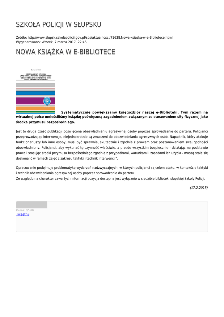SZKOŁA POLICJI W SŁUPSKU Źródło: http://www.slupsk.szkolapolicji.gov.pl/sps/aktualnosci/71638,Nowa-ksiazka-w-e-Bibliotece.html Wygenerowano: Wtorek, 7 marca 2017, 22:46 NOWA KSIĄŻKA W E-BIBLIOTECE Systematycznie powiększamy księgozbiór naszej e-Biblioteki. Tym razem na wirtualnej półce umieściliśmy książkę poświęconą zagadnieniem związanym ze stosowaniem siły fizycznej jako środka przymusu bezpośredniego. Jest to druga część publikacji poświęcona obezwładnianiu agresywnej osoby poprzez sprowadzanie do parteru. Policjanci przeprowadzając interwencje, niejednokrotnie są zmuszeni do obezwładniania agresywnych osób. Napastnik, który atakuje funkcjonariuszy lub inne osoby, musi być sprawnie, skutecznie i zgodnie z prawem oraz poszanowaniem swej godności obezwładniony. Policjanci, aby wykonać tę czynność właściwie, a przede wszystkim bezpiecznie - działając na podstawie prawa i stosując środki przymusu bezpośredniego zgodnie z przypadkami, warunkami i zasadami ich użycia - muszą stale się doskonalić w ramach zajęć z zakresu taktyki i technik interwencji”. Opracowanie podejmuje problematykę wydarzeń nadzwyczajnych, w których policjanci są celem ataku, w kontekście taktyki i technik obezwładniania agresywnej osoby poprzez sprowadzanie do parteru. Ze względu na charakter zawartych informacji pozycja dostępna jest wyłącznie w siedzibie biblioteki słupskiej Szkoły Policji. (17.2.2015) Ocena: 0/5 (0) Tweetnij