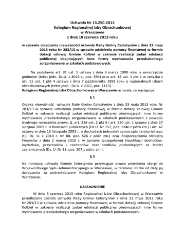 Uchwała Nr 13.250.2013 Kolegium Regionalnej Izby Obrachunkowej w Warszawie z dnia 18 czerwca 2013 roku w sprawie orzeczenia nieważności uchwały Rady Gminy Celestynów z dnia 23 maja 2013 roku Nr 283/13 w sprawie udzielenia pomocy finansowej w formie dotacji celowej Gminie Kołbiel w zakresie realizacji zadań edukacji publicznej obejmujących inne formy wychowania przedszkolnego zorganizowane w szkołach podstawowych. Na podstawie art. 91 ust. 1 ustawy z dnia 8 marca 1990 roku o samorządzie gminnym (tekst jedn. Dz.U. z 2013 r., poz. 594) oraz art. 18 ust. 1 pkt 1 w związku z art. 11 ust. 1 pkt 4 ustawy z dnia 7 października 1992 roku o regionalnych izbach obrachunkowych (tekst jedn.: Dz.U. z 2012, poz. 1113) – Kolegium Regionalnej Izby Obrachunkowej w Warszawie uchwala, co następuje: §1 Orzeka nieważność uchwały Rady Gminy Celestynów z dnia 23 maja 2013 roku Nr 283/13 w sprawie udzielenia pomocy finansowej w formie dotacji celowej Gminie Kołbiel w zakresie realizacji zadań edukacji publicznej obejmujących inne formy wychowania przedszkolnego zorganizowane w szkołach podstawowych z powodu istotnego naruszenia prawa, tj. art. 216 ust. 2 pkt 5 i art. 220 ust. 1 ustawy z dnia 27 sierpnia 2009 r. o finansach publicznych (Dz.U. Nr 157, poz. 1240 z późn.zm.) i art. 47 ustawy w dnia 13 listopada 2003 r. o dochodach jednostek samorządu terytorialnego (t.j. Dz. U. z 2010 r. Nr 80, poz. 526 z późn zm.) oraz Rozporządzenia Ministra Finansów z dnia 2 marca 2010 r. w sprawie szczegółowej klasyfikacji dochodów, wydatków, przychodów i rozchodów oraz środków pochodzących ze źródeł zagranicznych (Dz. U. Nr 38, poz. 207 z późn. zm.). §2 Na niniejszą uchwałę Gminie Celestynów przysługuje prawo wniesienia skargi do Wojewódzkiego Sądu Administracyjnego w Warszawie, w terminie 30 dni od daty jej doręczenia za pośrednictwem Kolegium Regionalnej Izby Obrachunkowej w Warszawie. UZASADNIENIE W dniu 3 czerwca 2013 roku Regionalnej Izbie Obrachunkowej w Warszawie przedłożona została uchwała Rady Gminy Celestynów z dnia 23 maja 2013 roku Nr 283/13 w sprawie udzielenia pomocy finansowej w formie dotacji celowej Gminie Kołbiel w zakresie realizacji zadań edukacji publicznej obejmujących inne formy wychowania przedszkolnego zorganizowane w szkołach podstawowych. Stosownie do art. 11 ust. 1 pkt 4 ustawy o regionalnych izbach obrachunkowych w/w uchwała podlega nadzorowi Regionalnej Izby Obrachunkowej. W podstawie prawnej uchwały powołano przepisy art. 10 ust. 2 ustawy z dnia 8 marca 1990 r. o samorządzie gminnym, art. 5 ust. 5, art. 14 ust. 4 ustawy z dnia 7 września 1991 r. o systemie oświaty oraz art. 220 ustawy z dnia 27 sierpnia 2009 r. o finansach publicznych i art. 46 ustawy z dnia 13 listopada 2003 r. o dochodach jednostek samorządu terytorialnego. Cyt. przepisy ustawy o samorządzie gminnym oraz ustawy o finansach publicznych stanowią o możliwości udzielania sobie przez jednostki samorządu terytorialnego pomocy finansowej i rzeczowej, natomiast z art. 46 ustawy o dochodach j.s.t. wynika możliwość realizacji zadań z zakresu działania innych j.s.t., na mocy porozumień zawartych z tymi jednostkami, przy czym jednostka samorządowa wykonująca zadania otrzymuje dotacje celowe w kwocie wynikającej z zawartego porozumienia. W treści badanej uchwały Rada Gminy Celestynów postanowiła „udzielić pomocy finansowej Gminie Kołbiel z przeznaczeniem na realizację edukacji publicznej dzieci z Gminy Celestynów obejmujących inne formy wychowania przedszkolnego zorganizowane w szkołach podstawowych Gminy Kołbiel” (§ 1). Pomoc ta zgodnie z § 2, będzie udzielona w formie dotacji celowej ze środków budżetu w 2013 r. w wysokości 25.000,00 zł i „zostanie przeznaczona na zapewnienie wychowania przedszkolnego dzieciom zamieszkałym na terenie Gminy Celestynów w miejscowościach, w których Gmina Celestynów nie ma możliwości zapewnienia wychowania przedszkolnego w przedszkolach i punktach przedszkolnych prowadzonych przez Gminę Kołbiel” (§ 3). Szczegółowe warunki pomocy finansowej, jej przeznaczenia i zasady rozliczania środków zostaną określone w umowie zawartej pomiędzy Gminą Kołbiel, a Gminą Celestynów (§ 4). Jak ustaliło Kolegium, w podjętej na tej samej sesji uchwale Nr 276/13 zmieniającej uchwałę budżetową Gminy Celestynów na 2013 rok sklasyfikowano wydatki na powyższy cel w dziale 801, rozdział 80106 „Inne formy wychowania przedszkolnego” w § 231 „Dotacje celowe przekazane gminie na zadania bieżące realizowane na podstawie porozumień (umów) miedzy jednostkami samorządu terytorialnego”. Ze złożonych przez Wójta, na prośbę Izby wyjaśnień (pismo Nr SKG300.3.2013 z 13.06.2013 r.) wynika, iż ujęty w w/w podziałkach klasyfikacji budżetowej wydatek w kwocie 25.000 zł „dotyczy udzielenia Gminie Kołbiel przez Gminę Celestynów dotacji celowej na zadania bieżące z zakresu działania Gminy Celestynów”. Dotacja zostanie przeznaczona na zapewnienie wychowania przedszkolnego dzieciom zamieszkałym na terenie Gminy Celestynów w miejscowościach, w których Gmina Celestynów nie ma możliwości zapewnienia wychowania przedszkolnego – w przedszkolach i punktach przedszkolnych prowadzonych przez Gminę Kołbiel. 2 Z poczynionych ustaleń wynika, iż Rada Gminy Celestynów zamierza udzielić dotacji celowej Gminie Kołbiel na realizację przez nią zadania własnego Gminy Celestynów, a nie na pomoc finansową jak określiła w badanej uchwale. Badana uchwała narusza zatem przepisy art. 216 ust. 2 pkt 5 i art. 220 ust. 1 ustawy o finansach publicznych oraz cyt. Rozporządzenia Ministra Finansów w sprawie szczegółowej klasyfikacji dochodów, wydatków, przychodów i rozchodów oraz środków pochodzących ze źródeł zagranicznych. Z art. 216 ust. 2 pkt 5 i art. 220 ust. 1 cyt. ustawy o finansach publicznych wynika możliwość udzielania z budżetu jednostki samorządu terytoria