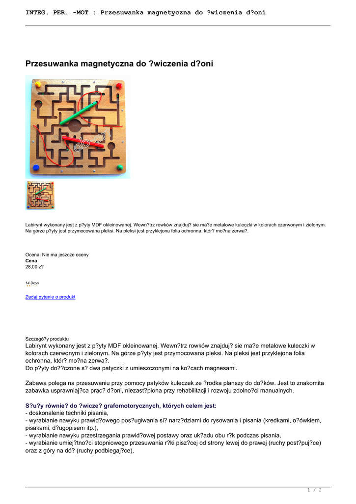 INTEG. PER. -MOT : Przesuwanka magnetyczna do ?wiczenia d?oni Przesuwanka magnetyczna do ?wiczenia d?oni Labirynt wykonany jest z p?yty MDF okleinowanej. Wewn?trz rowków znajduj? sie ma?e metalowe kuleczki w kolorach czerwonym i zielonym. Na górze p?yty jest przymocowana pleksi. Na pleksi jest przyklejona folia ochronna, któr? mo?na zerwa?. Ocena: Nie ma jeszcze oceny Cena 28,00 z? Zadaj pytanie o produkt Szczegó?y produktu Labirynt wykonany jest z p?yty MDF okleinowanej. Wewn?trz rowków znajduj? sie ma?e metalowe kuleczki w kolorach czerwonym i zielonym. Na górze p?yty jest przymocowana pleksi. Na pleksi jest przyklejona folia ochronna, któr? mo?na zerwa?. Do p?yty do??czone s? dwa patyczki z umieszczonymi na ko?cach magnesami. Zabawa polega na przesuwaniu przy pomocy patyków kuleczek ze ?rodka planszy do do?ków. Jest to znakomita zabawka usprawniaj?ca prac? d?oni, niezast?piona przy rehabilitacji i rozwoju zdolno?ci manualnych. S?u?y równie? do ?wicze? grafomotorycznych, których celem jest: - doskonalenie techniki pisania, - wyrabianie nawyku prawid?owego pos?ugiwania si? narz?dziami do rysowania i pisania (kredkami, o?ówkiem, pisakami, d?ugopisem itp.), - wyrabianie nawyku przestrzegania prawid?owej postawy oraz uk?adu obu r?k podczas pisania, - wyrabianie umiej?tno?ci stopniowego przesuwania r?ki pisz?cej od strony lewej do prawej (ruchy post?puj?ce) oraz z góry na dó? (ruchy podbiegaj?ce), 1 / 2 INTEG. PER. -MOT : Przesuwanka magnetyczna do ?wiczenia d?oni - wyrabianie p?ynno?ci i precyzji ruchów r?ki u?o?onej w pozycji jak przy pisaniu, - doskonalenie koncentracji uwagi, - rozwijanie spostrzegawczo?ci wzrokowej, - doskonalenie pami?ci ruchowej oraz wzrokowej, - usprawnianie koordynacji wzrokowo-ruchowej. Dziecko mo?e bawi? si? samo trzymaj?c patyczki w obu r?kach, ale tak?e mo?e bawi? si? jednocze?nie dwójka dzieci, np. robi?c zawody, kto pierwszy przesunie wszystkie kóleczki w odpowiednie miejsce. Jako?? wykonania zabawki jest dobra, zapakowana jest w br?zowy ekologiczny kartonik. Cena przesy?ki ustalana indywidualnie. Przed zamówieniem Ten adres pocztowy jest chroniony przed spamowaniem. Aby go zobaczy?, konieczne jest w??czenie w przegl?darce obs?ugi JavaScript. // Termin realizacji zamówienia od 24 h do 14 dni roboczych. Opinie Nikt jeszcze nie ocenia? tego produktu. 2 / 2 Powered by TCPDF (www.tcpdf.org)