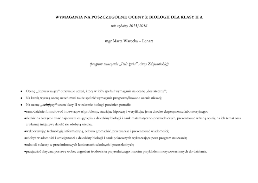 WYMAGANIA NA POSZCZEGÓLNE OCENY Z BIOLOGII DLA KLASY II A rok szkolny 2015/2016 mgr Marta Warecka – Lenart (program nauczania „Puls życia” Anny Zdziennickiej) Ocenę „dopuszczający” otrzymuje uczeń, który w 75% spełnił wymagania na ocenę „dostateczny”; Na każdą wyższą ocenę uczeń musi także spełnić wymagania przyporządkowane ocenie niższej; Na ocenę „celujący” uczeń klasy II w zakresie biologii powinien potrafić: samodzielnie formułować i rozwiązywać problemy, stawiając hipotezy i weryfikując je na drodze eksperymentu laboratoryjnego; śledzić na bieżąco i znać najnowsze osiągnięcia z dziedziny biologii i nauk matematyczno-przyrodniczych, prezentować własną opinię na ich temat oraz z własnej inicjatywy dzielić się zdobytą wiedzą; wykorzystując technologię informacyjną, celowo gromadzić, przetwarzać i prezentować wiadomości; zdobyć wiadomości i umiejętności z dziedziny biologii i nauk pokrewnych wykraczające poza program nauczania; odnosić sukcesy w przedmiotowych konkursach szkolnych i pozaszkolnych; przejawiać aktywną postawę wobec zagrożeń środowiska przyrodniczego i swoim przykładem motywować innych do działania. WYMAGANIA SZCZEGÓŁOWE Z PODSTAWY PROGRAMOWEJ DLA III ETAPU EDUKACYJNEGO: ORGANIZM CZŁOWIEKA. SKÓRA – POWŁOKA ORGANIZMU. Uczeń: VI.1.1. Opisuje hierarchiczną budowę organizmu człowieka (tkanki, narządy, układy narządów) VI.1.3. Opisuje budowę, funkcje i współdziałanie poszczególnych układów: ruchu, pokarmowego, oddechowego, krążenia, wydalniczego, nerwowego, dokrewnego i rozrodczego VI.11.1. Podaje funkcje skóry, rozpoznaje elementy jej budowy (na schemacie, modelu, rysunku, według opisu itp.) oraz przedstawia jej cechy adaptacyjne do pełnienia funkcji ochronnej, zmysłowej (receptory bólu, dotyku, ciepła, zimna) i termoregulacyjnej VI.11.2.Opisuje stan zdrowej skóry oraz rozpoznaje niepokojące zmiany na skórze, które wymagają konsultacji lekarskiej dostateczny (2+3) dobry (2+3+4) bardzo dobry (2+3+4+5) ORGANIZM CZŁOWIEKA. SKÓRA – POWŁOKA ORGANIZMU. wymienia dziedziny biologii zajmujące się budową i funkcjonowaniem człowieka klasyfikuje człowieka do królestwa zwierząt wskazuje komórki jako podstawowy element budulcowy podaje przykłady tkanek wylicza układy narządów i opisuje ich podstawowe funkcje wymienia funkcje i warstwy skóry wymienia wytwory naskórka wskazuje melaninę jako czynnik decydujący o kolorze skóry wymienia choroby skóry opisuje cechy różniące człowieka od innych naczelnych wyjaśnia, na czym polega homeostaza wymienia funkcje poszczególnych warstw skóry wykazuje zależność funkcji skóry od jej budowy klasyfikuje gruczoły opisuje funkcje poszczególnych wytworów naskórka wymienia pasożyty skóry określa zasady pierwszej pomocy w przypadku oparzenia i odmrożenia określa zasady pielęgnacji skóry (zwłaszcza w okresie dojrzewania) wykazuje stopniowe komplikowanie się budowy człowieka wyjaśnia zależności między układami narządów analizuje budowę naskórka i skóry właściwej dowodzi, ze odcień skóry zależy od zawartości barwnika w skórze klasyfikuje stopnie oparzeń skóry proponuje środki do pielęgnacji skóry młodzieńczej ocenia wpływ promieni słonecznych na skórę demonstruje zasady udzielania pierwszej pomocy w przypadku urazów skóry WYMAGANIA SZCZEGÓŁOWE Z PODSTAWY PROGRAMOWEJ DLA III ETAPU EDUKACYJNEGO: UKŁAD WYDALNICZY. Uczeń: VI.7.1. Podaje przykłady substancji, które są wydalane z organizmu człowieka oraz wymienia narządy biorące udział w wydalaniu VI.7.2. Opisuje budowę i funkcje głównych struktur układu wydalniczego (nerki, moczowody, pęcherz moczowy, cewka moczowa) dostateczny (2+3) dobry (2+3+4) bardzo dobry (2+3+4+5) UKŁAD WYDALNICZY wymienia produkty przemiany materii i drogi ich usuwania wskazuje położenie nerek, pęcherza moczowego opisuje elementy nerki na jej przekroju wymienia właściwości moczu ostatecznego wymienia przyczyny 2-3 chorób układu moczowego określa, w jaki sposób można zapobiegać chorobom układu moczowego wyjaśnia pojęcia: „wydalanie”, „nefron”, „przemiana materii” omawia rolę układu moczowego opisuje przebieg powstawania moczu wymienia objawy zapalenia pęcherza moczowego opisuje budowę warstwy korowej nerki wymienia funkcje pęcherza moczowego porównuje skład moczu pierwotnego i ostatecznego wyjaśnia, na czym polega dializa pozaustrojowa WYMAGANIA SZCZEGÓŁOWE Z PODSTAWY PROGRAMOWEJ DLA III ETAPU EDUKACYJNEGO: UKŁAD RUCHU. Uczeń: VI.2.1. Wykazuje spółdziałanie mięśni, ścięgien, kości i stawów w prawidłowym funkcjonowaniu układu ruchu VI.2.2. Wymienia i rozpoznaje (na schemacie, rysunku, modelu, według opisu itd.) elementy szkieletu osiowego, kończyn i obręczy VI.2.3. Przedstawia funkcje kości i wskazuje cechy budowy fizycznej i chemicznej umożliwiające ich pełnienie VI.2.4. Przedstawia znaczenie aktywności fizycznej dla prawidłowego funkcjonowania układu ruchu i gęstości masy kostnej oraz określa czynniki wpływające na prawidłowy rozwój muskulatury ciała dostateczny (2+3) dobry (2+3+4) bardzo dobry (2+3+4+5) UKŁAD RUCHU wskazuje na modelu zasadnicze elementy szkieletu określa funkcje szkieletu wskazuje mózgo- i trzewioczaszkę na modelu wymienia narządy chronione przez klatkę piersiową wymienia tkanki budujące szkielet rysuje kość długą i nazywa jej części wskazuje miejsce występowania szpiku kostnego wymienia rodzaje połączeń kości odróżnia staw zawiasowy od kulistego wskazuje położenie stawów kulistych i zawiasowych wymienia kości kończyn i obręczy rozpoznaje tkanki mięśniowe podaje przykłady występowania poszczególnych typów tkanki mięśniowej opisuje schemat budowy mięśnia określa rolę przepony wskazuje położenie najważniejszych mięśni wymienia naturalne krzywizny kręgosłupa opisuje przyczyny powstawania wad postawy wymienia 
