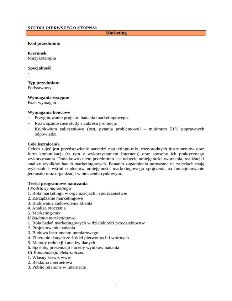 STUDIA PIERWSZEGO STOPNIA Marketing Kod przedmiotu Kierunek Muzykoterapia Specjalność Typ przedmiotu Podstawowy Wymagania wstępne Brak wymagań Wymagania końcowe Przygotowanie projektu badania marketingowego. Rozwiązanie case study z zakresu promocji. Kolokwium zaliczeniowe (test, pytania problemowe) – minimum 51% poprawnych odpowiedzi. Cele kształcenia Celem zajęć jest przedstawienie narzędzi marketingu-mix, różnorodnych instrumentów oraz form komunikacji (w tym z wykorzystaniem Internetu) oraz sposoby ich praktycznego wykorzystania. Dodatkowo celem przedmiotu jest nabycie umiejętności tworzenia, realizacji i analizy wyników badań marketingowych. Ponadto zagadnienia poruszane na zajęciach mają wykształcić wśród studentów umiejętności marketingowego spojrzenia na funkcjonowanie jednostki oraz organizacji w otoczeniu rynkowym. Treści programowe nauczania I Podstawy marketingu 1. Rola marketingu w organizacjach i społeczeństwie 2. Zarządzanie marketingowe 3. Budowanie zadowolenia klienta 4. Analiza otoczenia 5. Marketing-mix II Badania marketingowe 1. Rola badań marketingowych w działalności przedsiębiorstw 2. Projektowanie badania 3. Budowa instrumentu pomiarowego 4. Zbieranie danych ze źródeł pierwotnych i wtórnych 5. Metody redukcji i analizy danych 6. Sposoby prezentacji i oceny wyników badania III Komunikacja elektroniczna 1. Własny serwis www 2. Reklama internetowa 3. Public relations w Internecie 1 Efekty kształcenia (uczenia się) po ukończeniu przedmiotu - w zakresie wiedzy Posiada podstawową wiedzę w zakresie marketingowych, finansowych i prawnych aspektów zawodu muzykoterapeuty (K1_W13). Posiada wiedzę na temat zasad i narzędzi marketingu wspierających zawód muzykoterapeuty. Zna szeroką gamę nowoczesnych narzędzi (i zasady ich funkcjonowania) wykorzystywanych w budowaniu tożsamości organizacji w otoczeniu marketingowym. Posiada wiedzę umożliwiającą przygotowanie, przeprowadzenie i ocenę wyników podstawowych rodzajów badań marketingowych. - w zakresie umiejętności Posiada umiejętność określenia celów marketingowych. Posiada umiejętność poprawnego przygotowania briefu strony internetowej i zarządzania nią; umiejętność poprawnego przygotowania i zarządzania blogiem i mikroblogiem; umiejętność wykorzystania społeczności wirtualnych dla potrzeb promocji organizacji. Potrafi przygotować badanie marketingowe z wykorzystaniem kwestionariusza. - w zakresie kompetencji społecznych Rozumie zasady nowoczesnego marketingu i ich wpływ na funkcjonowanie współczesnych organizacji. Rozumie konieczność dbałości o prowadzenie działań komunikacyjnych w Internecie w oparciu o zasady netykiety; otwartości na stosowanie nowych technologii komunikacji rynkowej. Potrafi określić następstwa decyzji związanych z budowaniem tożsamości organizacji w otoczeniu marketingowym. Rozumie potrzebę interdyscyplinarnego podejścia do marketingu, w tym w szczególności do narzędzi wspierających komunikację z otoczeniem. Metody nauczania Prezentacje multimedialne, dyskusje, studia przypadków, zadania i ćwiczenia. Nakład pracy studenta potrzebny do osiągnięcia efektów uczenia się ROK SEMESTR Punkty ECTS Ilość godzin w semestrze Rodzaj zaliczenia LEGENDA I 1 II 2 3 III 4 1 15 Zs zal – zaliczony; zs – zaliczenie ze stopniem; egz – egzamin; ed – egzamin dyplomowy 2 5 6 Kryteria oceny Zaliczenie ze stopniem (sprawdzenie założonych efektów kształcenia): Przygotowanie rozwiązania studium przypadku z zakresu marketingu-mix. Przygotowanie projektu badania marketingowego. Kolokwium zaliczeniowe (test, pytania problemowe). Literatura (piśmiennictwo) 1. Armstrong G., Kotler Ph., Marketing. Wprowadzenie, Wolters Kluwer, Warszawa 2012. 2. Mazurek G., Promocja w Internecie – narzędzia, zarządzanie, praktyka, Ośrodek Doradztwa i Doskonalenia Kadr, Gdańsk 2008. 3. Kaczmarczyk G., Badania marketingowe. Podstawy metodyczne, PWE, Warszawa 2011. Język wykładowy Polski Imię i nazwisko wykładowcy mgr Mariusz Woźniakowski 3