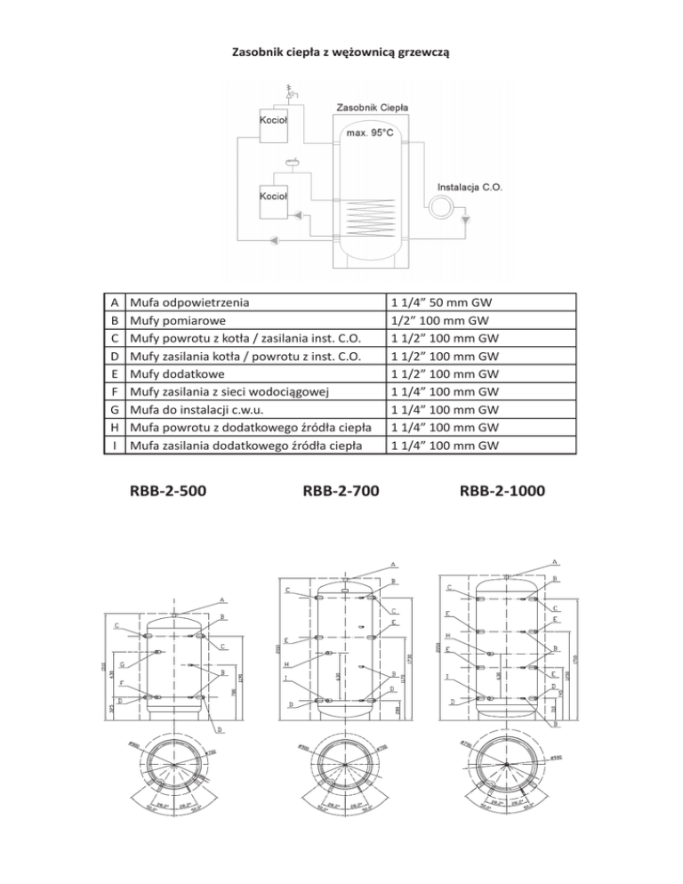 Zasobnik ciepła z wężownicą grzewczą A B C D E F G H I Mufa odpowietrzenia 1 1/4” 50 mm GW Mufy pomiarowe 1/2” 100 mm GW Mufy powrotu z kotła / zasilania inst. C.O. 1 1/2” 100 mm GW Mufy zasilania kotła / powrotu z inst. C.O. 1 1/2” 100 mm GW RBB-2-500 RBB-2-700 RBB-2-1000 Mufy dodatkowe 1 1/2” 100 mm GW Mufy zasilania z sieci wodociągowej 1 1/4” 100 mm GW Mufa do instalacji c.w.u. 1 1/4” 100 mm GW Mufa powrotu z dodatkowego źródła ciepła 1 1/4” 100 mm GW Mufa zasilania dodatkowego źródła ciepła 1 1/4” 100 mm GW RBB-2-500 RBB-2-700 RBB-2-1000
