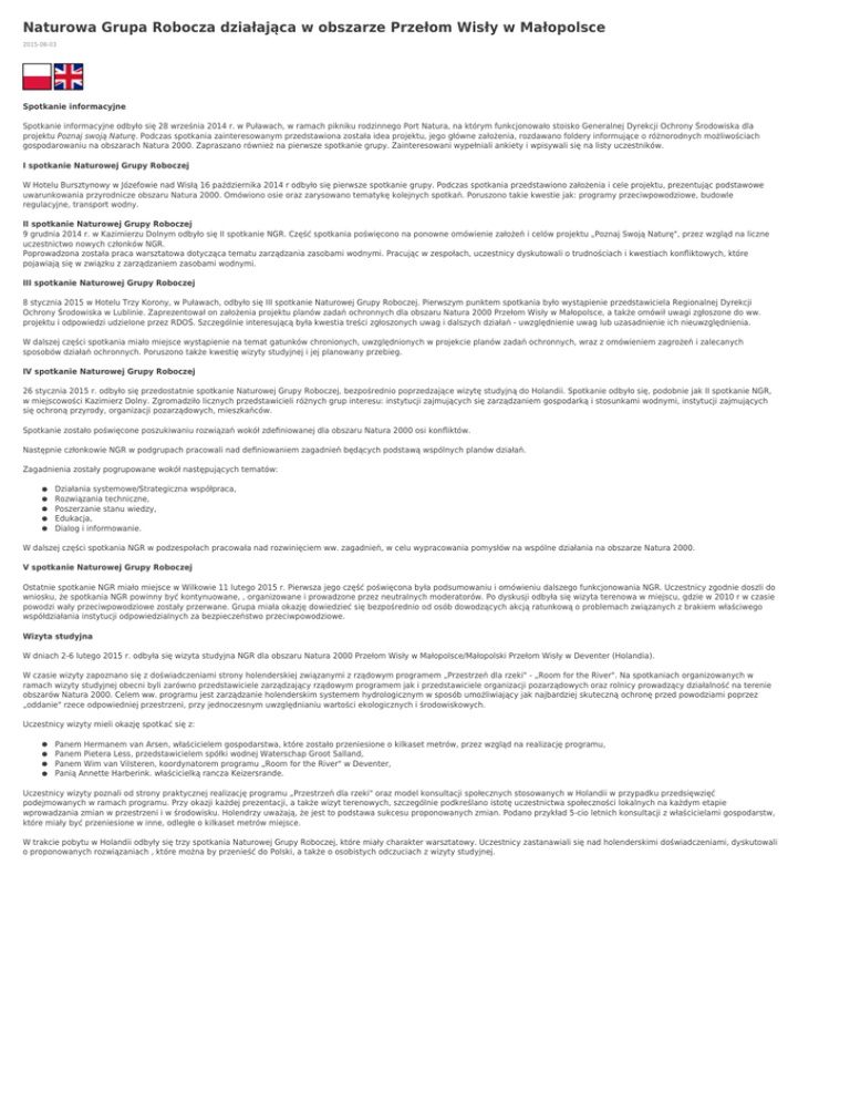 Naturowa Grupa Robocza działająca w obszarze Przełom Wisły w Małopolsce 2015-08-03 Spotkanie informacyjne Spotkanie informacyjne odbyło się 28 września 2014 r. w Puławach, w ramach pikniku rodzinnego Port Natura, na którym funkcjonowało stoisko Generalnej Dyrekcji Ochrony Środowiska dla projektu Poznaj swoją Naturę. Podczas spotkania zainteresowanym przedstawiona została idea projektu, jego główne założenia, rozdawano foldery informujące o różnorodnych możliwościach gospodarowaniu na obszarach Natura 2000. Zapraszano również na pierwsze spotkanie grupy. Zainteresowani wypełniali ankiety i wpisywali się na listy uczestników. I spotkanie Naturowej Grupy Roboczej W Hotelu Bursztynowy w Józefowie nad Wisłą 16 października 2014 r odbyło się pierwsze spotkanie grupy. Podczas spotkania przedstawiono założenia i cele projektu, prezentując podstawowe uwarunkowania przyrodnicze obszaru Natura 2000. Omówiono osie oraz zarysowano tematykę kolejnych spotkań. Poruszono takie kwestie jak: programy przeciwpowodziowe, budowle regulacyjne, transport wodny. II spotkanie Naturowej Grupy Roboczej 9 grudnia 2014 r. w Kazimierzu Dolnym odbyło się II spotkanie NGR. Część spotkania poświęcono na ponowne omówienie założeń i celów projektu „Poznaj Swoją Naturę", przez wzgląd na liczne uczestnictwo nowych członków NGR. Poprowadzona została praca warsztatowa dotycząca tematu zarządzania zasobami wodnymi. Pracując w zespołach, uczestnicy dyskutowali o trudnościach i kwestiach konfliktowych, które pojawiają się w związku z zarządzaniem zasobami wodnymi. III spotkanie Naturowej Grupy Roboczej 8 stycznia 2015 w Hotelu Trzy Korony, w Puławach, odbyło się III spotkanie Naturowej Grupy Roboczej. Pierwszym punktem spotkania było wystąpienie przedstawiciela Regionalnej Dyrekcji Ochrony Środowiska w Lublinie. Zaprezentował on założenia projektu planów zadań ochronnych dla obszaru Natura 2000 Przełom Wisły w Małopolsce, a także omówił uwagi zgłoszone do ww. projektu i odpowiedzi udzielone przez RDOŚ. Szczególnie interesującą była kwestia treści zgłoszonych uwag i dalszych działań - uwzględnienie uwag lub uzasadnienie ich nieuwzględnienia. W dalszej części spotkania miało miejsce wystąpienie na temat gatunków chronionych, uwzględnionych w projekcie planów zadań ochronnych, wraz z omówieniem zagrożeń i zalecanych sposobów działań ochronnych. Poruszono także kwestię wizyty studyjnej i jej planowany przebieg. IV spotkanie Naturowej Grupy Roboczej 26 stycznia 2015 r. odbyło się przedostatnie spotkanie Naturowej Grupy Roboczej, bezpośrednio poprzedzające wizytę studyjną do Holandii. Spotkanie odbyło się, podobnie jak II spotkanie NGR, w miejscowości Kazimierz Dolny. Zgromadziło licznych przedstawicieli różnych grup interesu: instytucji zajmujących się zarządzaniem gospodarką i stosunkami wodnymi, instytucji zajmujących się ochroną przyrody, organizacji pozarządowych, mieszkańców. Spotkanie zostało poświęcone poszukiwaniu rozwiązań wokół zdefiniowanej dla obszaru Natura 2000 osi konfliktów. Następnie członkowie NGR w podgrupach pracowali nad definiowaniem zagadnień będących podstawą wspólnych planów działań. Zagadnienia zostały pogrupowane wokół następujących tematów: Działania systemowe/Strategiczna współpraca, Rozwiązania techniczne, Poszerzanie stanu wiedzy, Edukacja, Dialog i informowanie. W dalszej części spotkania NGR w podzespołach pracowała nad rozwinięciem ww. zagadnień, w celu wypracowania pomysłów na wspólne działania na obszarze Natura 2000. V spotkanie Naturowej Grupy Roboczej Ostatnie spotkanie NGR miało miejsce w Wilkowie 11 lutego 2015 r. Pierwsza jego część poświęcona była podsumowaniu i omówieniu dalszego funkcjonowania NGR. Uczestnicy zgodnie doszli do wniosku, że spotkania NGR powinny być kontynuowane, , organizowane i prowadzone przez neutralnych moderatorów. Po dyskusji odbyła się wizyta terenowa w miejscu, gdzie w 2010 r w czasie powodzi wały przeciwpowodziowe zostały przerwane. Grupa miała okazję dowiedzieć się bezpośrednio od osób dowodzących akcją ratunkową o problemach związanych z brakiem właściwego współdziałania instytucji odpowiedzialnych za bezpieczeństwo przeciwpowodziowe. Wizyta studyjna W dniach 2-6 lutego 2015 r. odbyła się wizyta studyjna NGR dla obszaru Natura 2000 Przełom Wisły w Małopolsce/Małopolski Przełom Wisły w Deventer (Holandia). W czasie wizyty zapoznano się z doświadczeniami strony holenderskiej związanymi z rządowym programem „Przestrzeń dla rzeki" - „Room for the River". Na spotkaniach organizowanych w ramach wizyty studyjnej obecni byli zarówno przedstawiciele zarządzający rządowym programem jak i przedstawiciele organizacji pozarządowych oraz rolnicy prowadzący działalność na terenie obszarów Natura 2000. Celem ww. programu jest zarządzanie holenderskim systemem hydrologicznym w sposób umożliwiający jak najbardziej skuteczną ochronę przed powodziami poprzez „oddanie" rzece odpowiedniej przestrzeni, przy jednoczesnym uwzględnianiu wartości ekologicznych i środowiskowych. Uczestnicy wizyty mieli okazję spotkać się z: Panem Hermanem van Arsen, właścicielem gospodarstwa, które zostało przeniesione o kilkaset metrów, przez wzgląd na realizację programu, Panem Pietera Less, przedstawicielem spółki wodnej Waterschap Groot Salland, Panem Wim van Vilsteren, koordynatorem programu „Room for the River" w Deventer, Panią Annette Harberink. właścicielką rancza Keizersrande. Uczestnicy wizyty poznali od strony praktycznej realizację programu „Przestrzeń dla rzeki" oraz model konsultacji społecznych stosowanych w Holandii w przypadku przedsięwzięć podejmowanych w ramach programu. Przy okazji każdej prezentacji, a także wizyt terenowych, szczególnie podkreślano istotę uczestnictwa społeczności lokalnych na każdym etapie wpr
