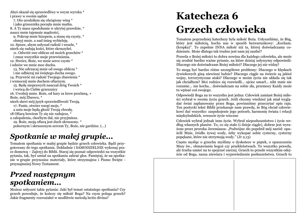 Abyś okazał się sprawiedliwy w swym wyroku * i prawy w swoim sądzie 7. Oto urodziłem się obciążony winą * i jako grzesznika poczęła mnie matka. 8. A Ty masz upodobanie w ukrytej prawdzie, * naucz mnie tajemnic mądrości, 9. Pokrop mnie hizopem, a stanę się czysty, * obmyj mnie. a nad śnieg wybieleję. 10. Spraw, abym usłyszał radość i wesele, * niech się radują kości, które skruszyłeś. 11. Odwróć swe oblicze od moich grzechów * i zmaz wszystkie moje przewinienia. 12. Stwórz, Boże, we mnie serce czyste * i odnów we mnie moc ducha. 13. Nie odrzucaj mnie od swego oblicza * i nie odbieraj mi świętego ducha swego. 14. Przywróć mi radość Twojego zbawienia * i wzmocnij mnie duchem ofiarnym. 15. Będę nieprawych nauczał dróg Twoich * i wrócą do Ciebie grzesznicy 16. Uwolnij mnie. Boże, od kary za krew przelaną, + Boże, mój Zbawco, * niech sławi mój język sprawiedliwość Twoją. 17. Panie, otwórz wargi moje, * a usta moje będą głosić Twoją chwałę. 18 Ofiarą bowiem Ty się nie radujesz, * a całopalenia, choćbym dał, nie przyjmiesz. 19. Boże, moją ofiarą jest duch skruszony. * pokornym i skruszonym sercem Ty, Boże, nie gardzisz. (...) Spotkanie w małej grupie... Tematem spotkania w małej grupie będzie grzech człowieka. Bądź przygotowany do tego spotkania. Dokładnie i SAMODZIELNIE wykonaj prace domową – Zajrzyj do Biblii. Staraj się poznać odpowiedzi na wszystkie pytania, tak, byś umiał na spotkaniu zabrać głos. Pamiętaj, że na spotkanie w grupie przynosisz materiały, które otrzymujesz i Pismo Święte przynajmniej Nowy Testament. Przed następnym spotkaniem... Możesz usłyszeć takie pytania: Jaki był temat ostatniego spotkania? Czy grzech powoduje, że kończy się miłość Boga? Na czym polega grzech? Jakie fragmenty rozważałeś w modlitwie metodą lectio divina? Katecheza 6 Grzech człowieka Tematem poprzedniej katechezy była miłość Boża. Usłyszeliśmy, że Bóg, który jest miłością, kocha nas w sposób bezwarunkowy: „Kocham. (kropka)”. To zupełnie INNA miłość niż ta, której doświadczamy codziennie. Może dlatego tak trudno jest nam jej zaufać? Prawda o Bożej miłości to dobra nowina dla każdego człowieka, ale może się zrodzić bardzo ważne pytanie, na które dzisiaj usłyszymy odpowiedź: Dlaczego nie doświadczam Bożej miłości? Dlaczego jej nie widzę? To mogą być bardzo różne szczegółowe problemy: Dlaczego w klęskach żywiołowych giną niewinni ludzie? Dlaczego ciągle na świecie są jakieś wojny, terrorystyczne ataki? Dlaczego w moim życiu nie układa się tak jak chciałbym? Moi rodzice się rozwiedli... ojciec umarł... nikt mnie nie rozumie... nie kocha… doświadczam na sobie zła, przemocy Każdy może tu wpisać coś swojego. Odpowiedź Boga na to wszystko jest jedna: Człowiek zamiast Bożej miłości wybrał w swoim życiu grzech. Jeśli chcemy wiedzieć jak miał wyglądać świat zaplanowany przez Boga, powinniśmy przeczytać opis raju. Ten poetycki tekst Biblii przekazuje nam prawdę, że Bóg chciał człowiekowi dać wszystko: zaspokojenie jego potrzeb, harmonię świata i relacji międzyludzkich, wreszcie życie wieczne Człowiek wybrał jednak inne życie. Wybrał nieposłuszeństwo i życie według własnych planów. To, co się stało (i dzieje ciągle), dobrze jest wyrażone przez proroka Jeremiasza: „Podwójne zło popełnił mój naród: opuścili Mnie, źródło żywej wody, żeby wykopać sobie cysterny, cysterny popękane, które nie utrzymują wody.” (Jr 2,13) Często myśląc o grzechu myślimy o dyskotece w piątek, o opuszczeniu Mszy św., obmawianiu kogoś czy przekleństwach. To wszystko prawda, ale trzeba umieć na to spojrzeć szerzej. Grzech to przede wszystkim odejście od Boga, nasza niewiara i wypowiedzenie posłuszeństwa. Grzech to nasze odejście od Źródła Życia, czyli nasza śmierć. Ludzie często myślą, że grzesząc krzywdzą Boga. Grzech jest obrazą Boga, ale jest to przede wszystkim krzywda jaką człowiek wyrządza sobie samemu. Grzeszący człowiek przypomina drzewo, które rosnąc nad bijącym źródłem postanawia przesadzić się w pustynię. Czyniąc to wydaje wyrok na siebie. Problemem współczesnego świata jest ślepota na grzech. Ludzie nie chcą. Nie potrafią uznać swojego grzechu. Nawet spowiadając się, tak naprawdę nie są przekonani o swojej winie, klepią wyuczone formułki. Tymczasem droga do prawdziwego pojednania prowadzi przez prawdziwą skruchę, prawdziwe uznanie swojego stanu i szczere (a nie sztuczne) przyjście do Boga. W Starym Testamencie czytamy historię grzechu króla Dawida - cudzołóstwo i morderstwo (2 Sm 11,1-12.13) Wielki grzech przebaczony przez Boga. Zobaczmy jednak jaka była pokuta Dawida. Jej świadectwo mamy w Psalmie 51. Takiej postawy powinniśmy się uczyć od Dawida. Spójrzmy teraz osobiście na grzech w naszym życiu. Czy przeżywam go jako odejście od Boga, odcięcie się od Jego miłości, od Źródła Życia? Jak przeżywam swój powrót, swój sakrament pojednania? Jak wyglądają moje spowiedzi? Jak się do nich przygotowuję? Czy spowiedź jest moim spotkaniem z Bogiem czy też „odbębnieniem” pustego rytuału? Zajrzyj do Biblii Przeczytaj tekst, który już znasz: Łk 15,11-24. Odpowiedz na pytania: 1. Na czym polegał grzech syna marnotrawnego? ……………………………….. ……………………………………………………………………………………………………….. ……………………………………………………………………………………………………….. 2. Jakie były skutki jego grzechu? Opisz stan, w jakim znajdował się syn. ....................................................................................................................... ……………………………………………………………………………………………………….. 3. Spróbu