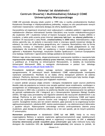 Dziesięć lat działalności Centrum Otwartej i Multimedialnej Edukacji COME Uniwersytetu Warszawskiego COME UW powstało decyzją władz uczelni w 1999 roku w wyniku przekształcenia Studium Kształcenia Otwartego w międzywydziałową jednostkę, mającą na celu poszukiwanie nowych możliwości rozszerzania i ułatwiania dostępu do oferty dydaktycznej UW. Zaczynaliśmy od organizacji otwartych sesji wakacyjnych z udziałem polskich i zagranicznych wykładowców (Warsaw International Summer Education) oraz kursów wideokonferencyjnych dla studentów UW i studentów School of Eastern European and Slavonic Studies (SEESS) w Londynie, a także prób uczenia przez Internet (pierwszy taki kurs na własnej platformie, z udziałem 35 nauczycieli z całej Polski, zrealizowaliśmy w 2000 roku). Doświadczenia z tego okresu upewniły nas, że jedynie e-nauczanie może w znaczący sposób rozszerzyć dostęp do edukacji, bo znosi nie tylko barierę geograficzną, ale i czasową. Rozwijaliśmy więc tę formę nauczania, tworząc w większości płatne kursy otwarte i studia podyplomowe (a więc niedostępne dla studentów UW) we współpracy z innymi jednostkami dydaktycznymi UW (głównie z Wydziałem Psychologii, Instytutem Studiów Społecznych i Centrum Europejskim) oraz badając możliwości i ograniczenia takiego podejścia do kształcenia. Efektem tego okresu testowania, eksperymentowania i poznawania tajników e-nauczania było wypracowanie własnego modelu edukacji przez Internet, którego założenia zostały opisane w publikacji pt. E-learning na Uniwersytecie Warszawskim, w dodatku do kwartalnika Uniwersytet Warszawski 2004, a następnie sformułowane w postaci tzw. dekalogu (http://www.come.uw.edu.pl/?q=pl/node/51). Prowadzenie dydaktyki zdalnej wymaga zarówno odpowiedniego sprzętu jak i oprogramowania. W pierwszych latach działalności COME wykorzystywało rozwiązania wykonane samodzielnie. Wynikało to ze słabej oferty dostępnych platform do zdalnej edukacji. Platformy darmowe miały małą funkcjonalność, a komercyjne były bardzo drogie. Nie były również satysfakcjonujące pod względem możliwości. Z czasem jednak sytuacja uległa zmianie i dostępna nieodpłatnie (open source) platforma Moodle stała się popularna na świecie oraz zaczęła spełniać nasze oczekiwania, wynikające w szczególności ze zwiększającej się liczby zajęć dydaktycznych prowadzonych przez Internet. Stąd decyzja w 2004 roku o przejściu na platformę Moodle oraz dostosowywanie tej aplikacji do potrzeb wykładowców UW i integracji jej z Uniwersyteckim Systemem Obsługi Studiów (USOS). Od tego czasu prowadzimy też regularne szkolenia dla nauczycieli akademickich z jej obsługi. Platforma ta jest stale modyfikowana przez zespół techniczny COME pod kątem potrzeb jej użytkowników, autorów kursów oraz integracji z systemami informatycznymi uczelni. Szczególnie istotny jest ten ostatni element, gdyż pozwala to na organizację kursów ogólnouniwersyteckich, szkolenia BHP, testów poziomujących, czy elektronicznych lektoratów z języków obcych. Wykorzystanie centralnego serwera uwierzytelniania ułatwia pracę studentom, gdyż dostęp do platformy odbywa się w ten sam sposób, jak do innych systemów IT uniwersytetu. Momentem przełomowym w działalności COME był rok 2005, kiedy to na mocy rozporządzenia Rektora w sprawie wspierania ogólnouniwersyteckich zajęć dydaktycznych przez Internet nastąpił zasadniczy zwrot w organizacji e-nauczania na UW: z edukacji otwartej skierowanej przede wszystkim poza uniwersytet (gdy tylko nieliczne kursy były dostępne dla studentów UW) do dydaktyki uniwersyteckiej (nie oznacza to jednak, że - Strona 1 z 3 - całkowicie zrezygnowaliśmy z kursów otwartych). Powstała wtedy Interdyscyplinarna Baza Internetowych Zajęć Akademickich (IBIZA) – autorski projekt prof. Grażyny Wieczorkowskiej, pierwszego dyrektora Centrum. IBIZA to oferta e-kursów, które studenci UW mogą zaliczać w ramach „przedmiotów dodatkowych”. Zajęcia te przygotowują studentów UW do rozumienia pojęć i podstawowych zagadnień z dyscyplin naukowych nie związanych z wybranym i realizowanym przez studenta kierunkiem studiów, zwiększając tym samym interdyscyplinarność kształcenia. Zajęcia w ramach projektu IBIZA są prowadzone na platformie edukacyjnej COME (www.kampus.edu.pl), kończą się zaliczeniem stacjonarnym i są równoważne zajęciom stacjonarnym. W ciągu czterech lat do oferty IBIZA wprowadzono 87 projektów zajęć z różnych dziedzin oraz odbyło się 187 kursów przez Internet, w których uczestniczyło prawie 10 000 studentów i doktorantów UW ze wszystkich wydziałów. Dziś można śmiało powiedzieć, że ogólnouniwersyteckie zajęcia przez Internet w ramach projektu IBIZA są trwałym elementem oferty dydaktycznej UW. Szczegółowe informacje ma temat tego projektu można znaleźć w publikacji: D. Sidor, L. Rudak, IBIZA – E-zajęcia ogólnouniwersyteckie w Uniwersytecie Warszawskim, w: H. Krawczyk (Red.), Technologie informacyjne, Zeszyty Naukowe Wydziału ETI Politechniki Gdańskiej, Gdańsk 2009, str. 181-188. Wspomniane wcześniej rozporządzenie Rektora uprawomocniło zajęcia przez Internet na największej polskiej uczelni i w znaczący sposób zdynamizowało rozwój e-naucznia na UW. Liczba użytkowników platformy obsługiwanej przez COME z roku na rok systematycznie wzrasta: z 12 500 w roku 2006 po 42 111 w roku 2007, 58 518 w roku 2008 do 69 480 na początku roku akademickiego 2009/2010. Władze uczelni doceniły tę formę prowadzenia zajęć i wspierają jej rozwój, bo rozwiązuje ona istotny problem wynikający z terytorialnego rozproszenia UW: ułatwia dostęp do obowiązkowych zajęć. W ofercie Uniwersytetu Warszawskiego mamy dziś, oprócz kursów wchodzących w ramy projektu IBIZA, następujące kategorie zajęć przez Internet : Szkolenia dla studentów I roku obejmujące Szkolenie biblioteczne (r