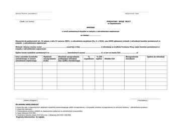 ……….................................................. (miejscowość, data) ...................................................................................... (pieczęć firmowa pracodawcy) .................................................................................... POWIATOWY URZĄD PRACY w Częstochowie (bank i nr konta) WNIOSEK o zwrot poniesionych kosztów w związku z zatrudnieniem wspieranym za miesiąc…………………. Stosownie do postanowień art. 16 ustawy z dnia 13 czerwca 2003 r. o zatrudnieniu socjalnym (Dz. U. z 2016r. poz.1828) zgłaszamy wniosek o refundacje kosztów poniesionych w związku z zatrudnieniem wspieranym. Wniosek dotyczy umowy numer .................................................zawartej w dniu ........................................ o refundację ze środków Funduszu Pracy części kosztów poniesionych w związku z zatrudnieniem wspieranym. Ogólna kwota wydatków poniesionych na ....................................bezrobotnych wynosi .............................. zł, w tym na koszty ZUS .............................. zł. Imię i nazwisko Uczestnika zatrudnionego w ramach zatrudnienia wspieranego Wysokość wynagrodzenia brutto ................................................................... ( Główny Księgowy ) Wysokość wynagrodzenia podlegająca refundacji (bez zasiłku chorobowego) % wypadkowe % ZUS ogółem Składka ZUS Wynagrodzenie chorobowe Ogółem do refundacji .............................................................. ( Pracodawca ) Do wniosku należy dołączyć: 1.Kopia listy płac z własnoręcznym podpisem Uczestnika potwierdzającego odbiór wynagrodzenia, w przypadku przelewu wynagrodzenia na rachunek bankowy – potwierdzenie przelewu. 2. Kopia listy obecności. 3. Potwierdzenie przelewu składek na ubezpieczenia społeczne za zatrudnionych pracowników. 4. Kopia deklaracji ZUS DRA. 5. Zwolnienie lekarskie (kopia ZUS ZLA) wraz z deklaracją ZUS RCA i ZUS RSA Oryginały dokumentów do wglądu.
