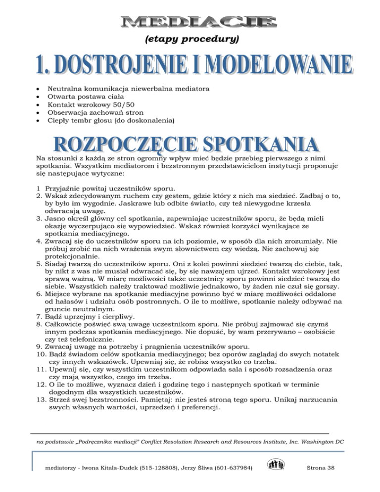 (etapy procedury) • • • • • Neutralna komunikacja niewerbalna mediatora Otwarta postawa ciała Kontakt wzrokowy 50/50 Obserwacja zachowań stron Ciepły tembr głosu (do doskonalenia) Na stosunki z każdą ze stron ogromny wpływ mieć będzie przebieg pierwszego z nimi spotkania. Wszystkim mediatorom i bezstronnym przedstawicielom instytucji proponuje się następujące wytyczne: 1 Przyjaźnie powitaj uczestników sporu. 2. Wskaż zdecydowanym ruchem czy gestem, gdzie który z nich ma siedzieć. Zadbaj o to, by było im wygodnie. Jaskrawe lub odbite światło, czy też niewygodne krzesła odwracają uwagę. 3. Jasno określ główny cel spotkania, zapewniając uczestników sporu, że będą mieli okazję wyczerpująco się wypowiedzieć. Wskaż również korzyści wynikające ze spotkania mediacyjnego. 4. Zwracaj się do uczestników sporu na ich poziomie, w sposób dla nich zrozumiały. Nie próbuj zrobić na nich wrażenia swym słownictwem czy wiedzą. Nie zachowuj się protekcjonalnie. 5. Siadaj twarzą do uczestników sporu. Oni z kolei powinni siedzieć twarzą do ciebie, tak, by nikt z was nie musiał odwracać się, by się nawzajem ujrzeć. Kontakt wzrokowy jest sprawą ważną. W miarę możliwości także uczestnicy sporu powinni siedzieć twarzą do siebie. Wszystkich należy traktować możliwie jednakowo, by żaden nie czuł się gorszy. 6. Miejsce wybrane na spotkanie mediacyjne powinno być w miarę możliwości oddalone od hałasów i udziału osób postronnych. O ile to możliwe, spotkanie należy odbywać na gruncie neutralnym. 7. Bądź uprzejmy i cierpliwy. 8. Całkowicie poświęć swą uwagę uczestnikom sporu. Nie próbuj zajmować się czymś innym podczas spotkania mediacyjnego. Nie dopuść, by wam przerywano – osobiście czy też telefonicznie. 9. Zwracaj uwagę na potrzeby i pragnienia uczestników sporu. 10. Bądź świadom celów spotkania mediacyjnego; bez oporów zaglądaj do swych notatek czy innych wskazówek. Upewniaj się, że robisz wszystko co trzeba. 11. Upewnij się, czy wszystkim uczestnikom odpowiada sala i sposób rozsadzenia oraz czy mają wszystko, czego im trzeba. 12. O ile to możliwe, wyznacz dzień i godzinę tego i następnych spotkań w terminie dogodnym dla wszystkich uczestników. 13. Strzeż swej bezstronności. Pamiętaj: nie jesteś stroną tego sporu. Unikaj narzucania swych własnych wartości, uprzedzeń i preferencji. na podstawie „Podręcznika mediacji” Conflict Resolution Research and Resources Institute, Inc. Washington DC mediatorzy - Iwona Kitala-Dudek (515-128808), Jerzy Śliwa (601-637984) Strona 38