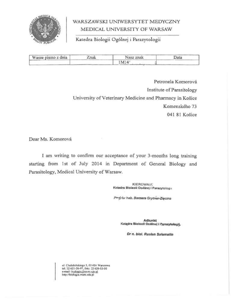 WARSZAWSKI UNIWERSYTET MEDYCZNY MEDICAL UNIVERSITY OF WARSAW Katedra Biologii Ogólnej i Parazytologii ismo z dnia Znak L-------------~~--------------~ Nasz znak 1Ml 4 ' Data Petronela Komorová Institute ofParasitology University of Veterinary Medicíne and Pharmacy in Košice Komenského 73 041 81 Košice Dear Ms. Komorová I am writing to confirm our acceptance of your 3-months long training starting from 1st of July 2014 in Department of General Biology and Parasitology, Medical University of Warsaw. KIEROWNIK Katedra BloiRlaU Ouólnej l Parazytolog11 PYrlj/or hab. Bamara Grytner~Zi(tcina Adlunkt K~dra Bloloall OaólneJ l P.Arazytologlj. Dr n. blol. Ruslan Salamatln ul Chalubiňskiego 5, 02·004 Wars7awa tel. 22 621-26 -07, fa ks 22 628-53-50 e-mail: hiOiogiaotilwum.e.úu nl http://biolog1a.wum.edu.pl