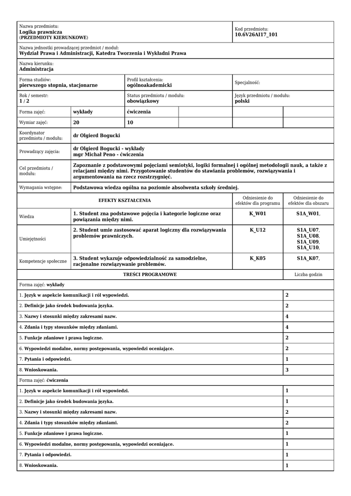 Nazwa przedmiotu: Kod przedmiotu: Logika prawnicza 10.6V26AI17_101 (PRZEDMIOTY KIERUNKOWE) Nazwa jednostki prowadzącej przedmiot / moduł: Wydział Prawa i Administracji, Katedra Tworzenia i Wykładni Prawa Nazwa kierunku: Administracja Forma studiów: Profil kształcenia: pierwszego stopnia, stacjonarne ogólnoakademicki Rok / semestr: 1/2 Status przedmiotu / modułu: Język przedmiotu / modułu: obowiązkowy polski Specjalność: Forma zajęć: wykłady ćwiczenia Wymiar zajęć: 20 10 Koordynator przedmiotu / modułu: dr Olgierd Bogucki Prowadzący zajęcia: dr Olgierd Bogucki - wykłady mgr Michał Peno - ćwiczenia Cel przedmiotu / modułu: Zapoznanie z podstawowymi pojęciami semiotyki, logiki formalnej i ogólnej metodologii nauk, a także z relacjami między nimi. Przygotowanie studentów do stawiania problemów, rozwiązywania i argumentowania na rzecz rozstrzygnięć. Wymagania wstępne: Podstawowa wiedza ogólna na poziomie absolwenta szkoły średniej. Odniesienie do efektów dla programu Odniesienie do efektów dla obszaru 1. Student zna podstawowe pojęcia i kategorie logiczne oraz powiązania między nimi. K_W01 S1A_W01, 2. Student umie zastosować aparat logiczny dla rozwiązywania problemów prawniczych. K_U12 S1A_U07, S1A_U08, S1A_U09, S1A_U10, 3. Student wykazuje odpowiedzialność za samodzielne, racjonalne rozwiązywanie problemów. K_K05 S1A_K07, EFEKTY KSZTAŁCENIA Wiedza Umiejętności Kompetencje społeczne TREŚCI PROGRAMOWE Liczba godzin Forma zajęć: wykłady 1. Język w aspekcie komunikacji i ról wypowiedzi. 2 2. Definicje jako środek budowania języka. 2 3. Nazwy i stosunki między zakresami nazw. 4 4. Zdania i typy stosunków między zdaniami. 4 5. Funkcje zdaniowe i prawa logiczne. 2 6. Wypowiedzi modalne, normy postępowania, wypowiedzi oceniające. 2 7. Pytania i odpowiedzi. 1 8. Wnioskowania. 3 Forma zajęć: ćwiczenia 1. Język w aspekcie komunikacji i ról wypowiedzi. 1 2. Definicje jako środek budowania języka. 1 3. Nazwy i stosunki między zakresami nazw. 2 4. Zdania i typy stosunków między zdaniami. 2 5. Funkcje zdaniowe i prawa logiczne. 1 6. Wypowiedzi modalne, normy postępowania, wypowiedzi oceniające. 1 7. Pytania i odpowiedzi. 1 8. Wnioskowania. 1 Metody kształcenia Wykład informacyjny połączony z metodą aktywizującą w formie dyskusji dydaktycznej związanej z wykładem (wykład). Metoda problemowa (ćwiczenia). Rozwiązywanie zadań (ćwiczenia). Nr efektu kształcenia z sylabusa Metody weryfikacji efektów kształcenia Forma i warunki zaliczenia * egzamin pisemny 1,2,3, * sprawdzian 1,2,3, Sprawdzian obejmuje wiedzę z ćwiczeń oraz wiedzę uzyskaną na podstawie literatury. Sprawdzian oceniany jest w kategoriach: zaliczone, niezaliczone. Uzyskanie zaliczenia jest warunkiem koniecznym dopuszczenia do egzaminu. Zaliczenie całości przedmiotu na podstawie egzaminu pisemnego. Egzamin obejmuje wiedzę z wykładu oraz wiedzę uzyskaną na podstawie literatury. Egzamin obejmuje cztery zadania. Maksymalna liczba punktów, którą można otrzymać na egzaminie - 100 pkt. Zasady oceniania są następujące: 100-90 pkt - bardzo dobry; 89-85 pkt -dobry plus; 84-70 pkt - dobry; 69-65 pkt dostateczny plus; 64-50 pkt - dostateczny; poniżej 50 - niedostateczny. Literatura podstawowa Ziembiński Z. (2011): Logika praktyczna. PWN, s. 1-284 Literatura uzupełniająca Zieliński M. Ziembiński Z. (1988): Uzasadnianie twierdzeń, ocen i norm w prawoznawstwie. PWN, s. 1-302 NAKŁAD PRACY STUDENTA: Liczba godzin Zajęcia dydaktyczne 30 Udział w konsultacjach 18 Zdawanie egzaminu lub/i zaliczenia 2 Przygotowanie się do zajęć 16 Studiowanie literatury 22 Przygotowanie się do egzaminu lub/i zaliczenia 12 ŁĄCZNY nakład pracy studenta w godz. 100 Liczba punktów ECTS 4